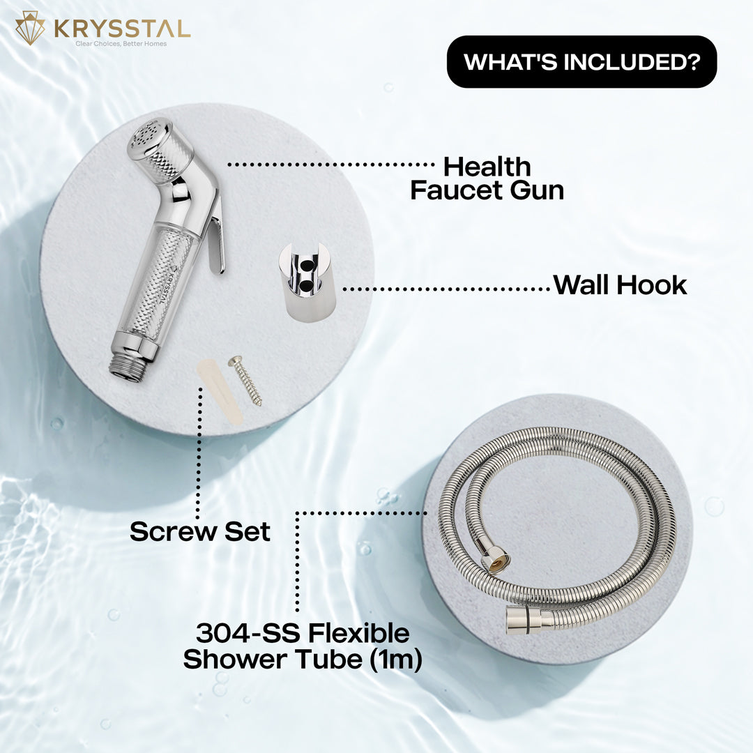• Package Contents: 1 x Health Faucet Gun, 1 x Flexible Shower Tube, 1 x Wall Holder/Hook, and 1 x Screw Set.