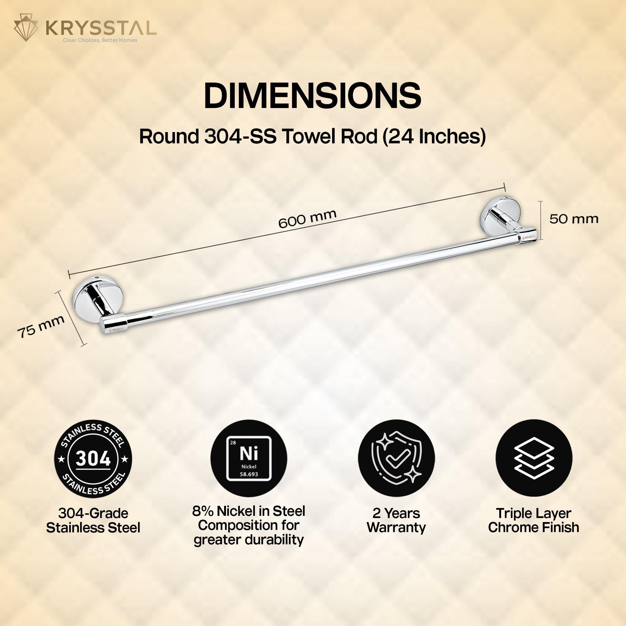 The 24-inch Round Towel Rod is made from tough 304-grade stainless steel with a shiny chrome finish that resists rust and stays bright. Its wall-mounted design frees up bathroom space while adding a sleek look. Strong and reliable, it holds heavy towels without bending or sagging for lasting use.