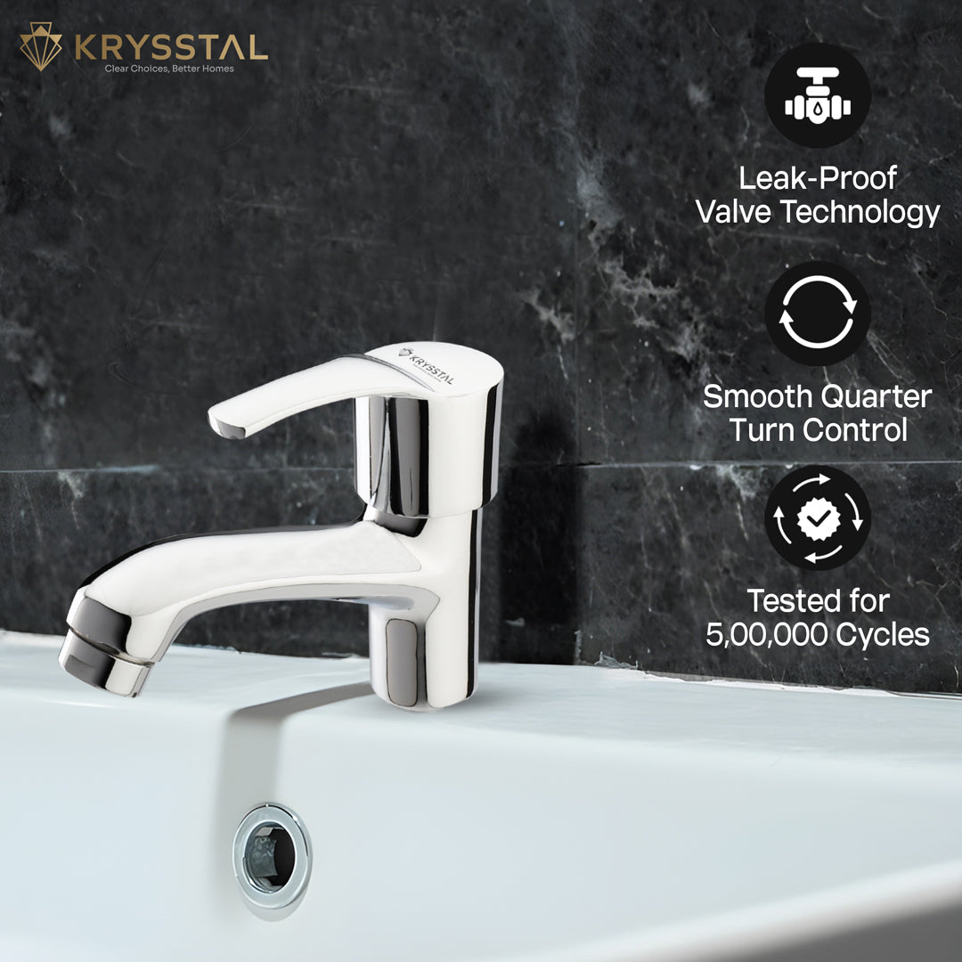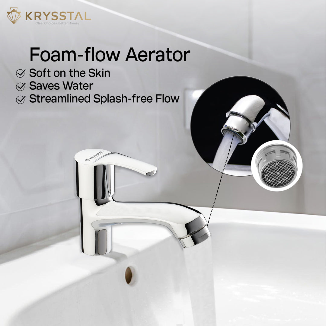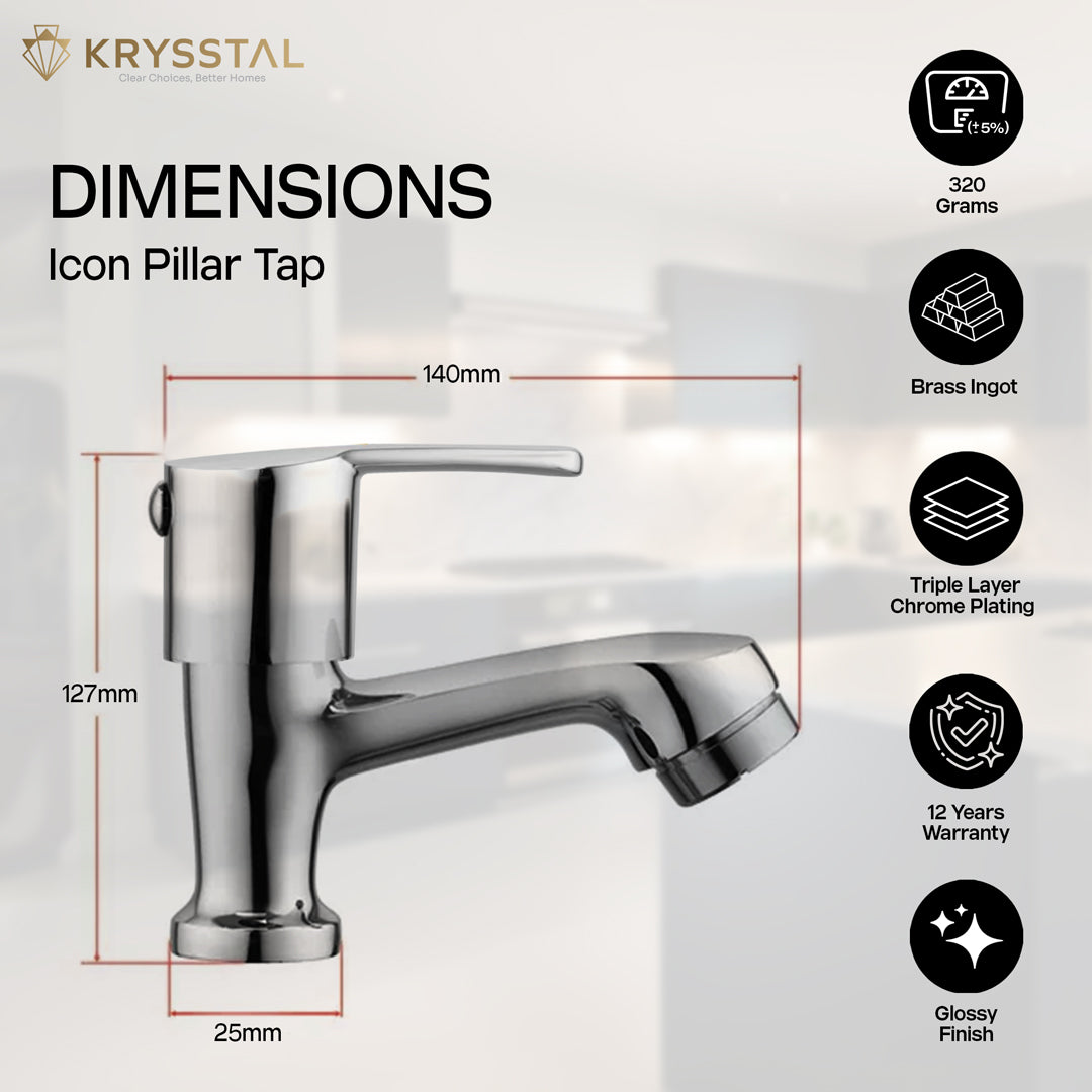 The Icon Pillar Tap for Wash Basin is crafted from solid brass and finished with a triple-layer chrome coating that provides strong resistance against rust, corrosion, and heat, ensuring reliable durability. Its advanced foam aerator introduces air into the water flow, cutting water usage by 50% while delivering a high-pressure, splash-free stream with reduced noise. Designed for leak-free operation, it offers an efficient 6-10 LPM flow rate supported by secure thread seals that handle high water pressure. Built with a smooth quarter-turn handle, it’s ideal for wash basins, small kitchen sinks, and kitchen bars. The non-porous chrome surface resists stains and fingerprints, making maintenance easy without harsh chemicals.