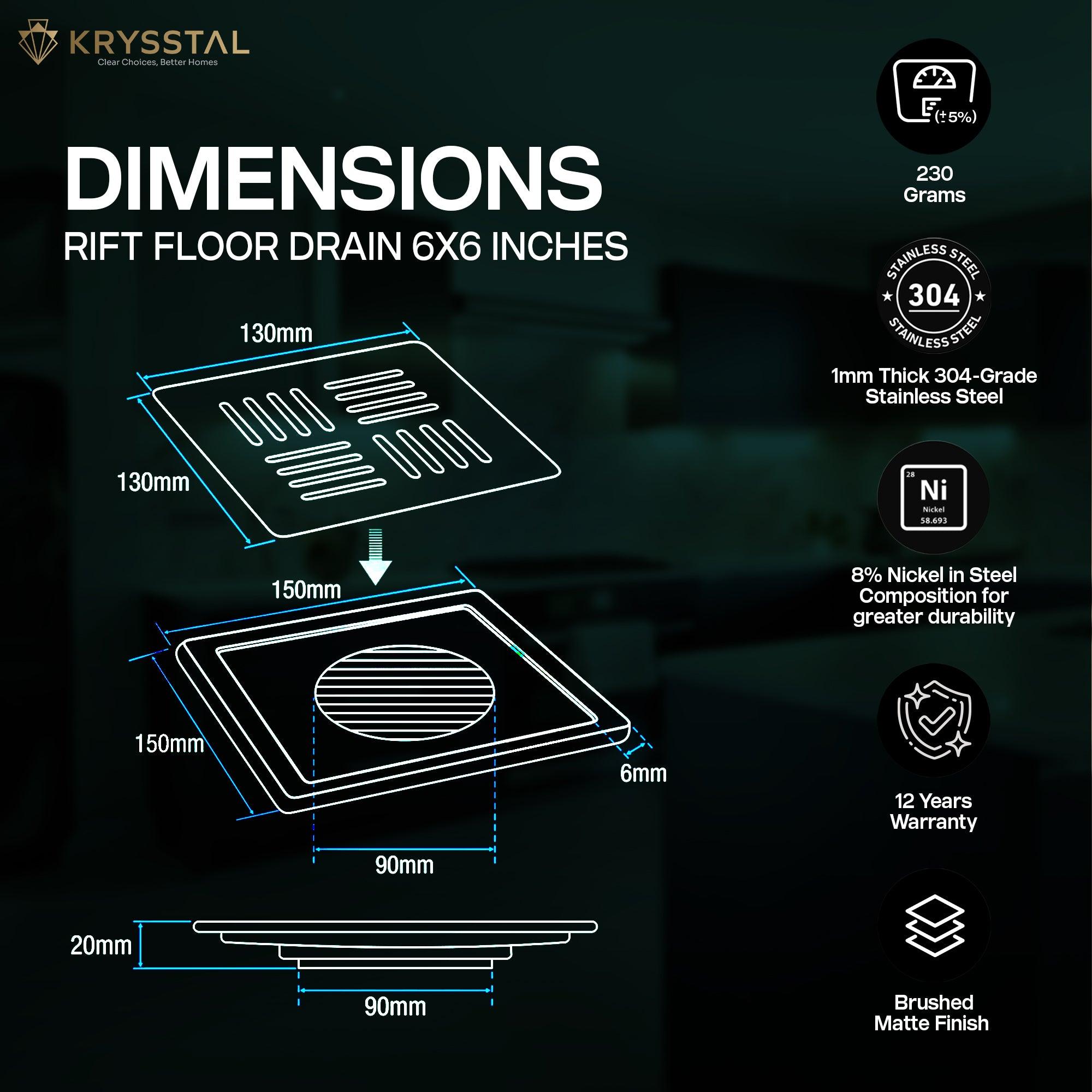 The Rift 304-SS Floor Drain (6" x 6") is made from durable 304-grade stainless steel with a brushed matte finish that resists rust and corrosion. Its precise grating ensures fast drainage, keeping floors dry and clean. Curved edges provide a snug, stable fit without wobbling. The removable, stylish top allows easy cleaning while maintaining a seamless look. Designed for high-traffic areas, this drain offers reliable performance and simple maintenance.