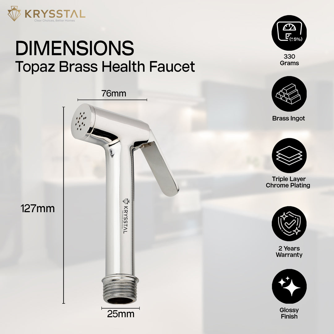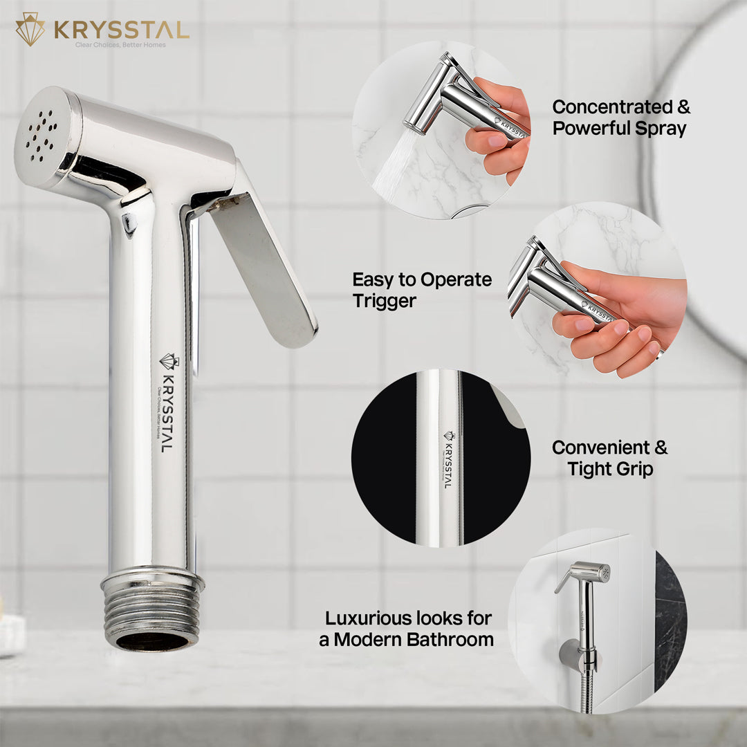 Brass health faucets are preferred for their sturdiness and resistance to rust and tarnish, making them ideal for long-term use in humid bathroom conditions. KRYSSTAL’s brass faucets combine functionality with a premium design, enhancing the overall look of your bathroom.
