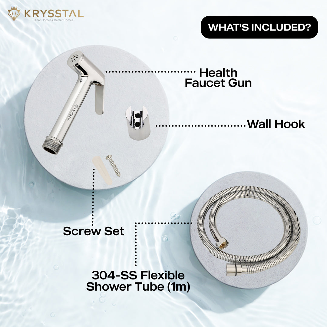 • Package Contents: 1 x Health Faucet Gun, 1 x Flexible Shower Tube, 1 x Wall Holder/Hook, and 1 x Screw Set.