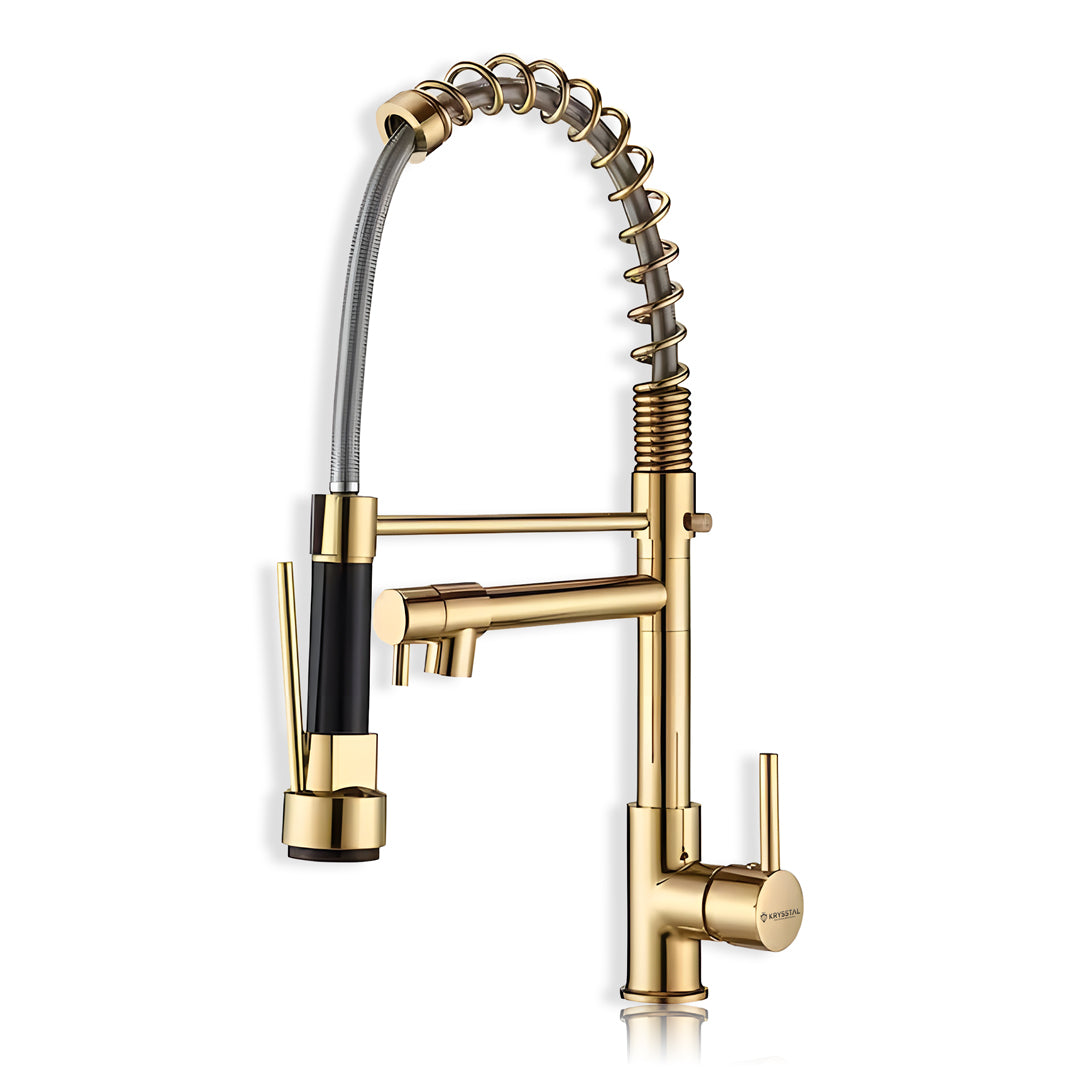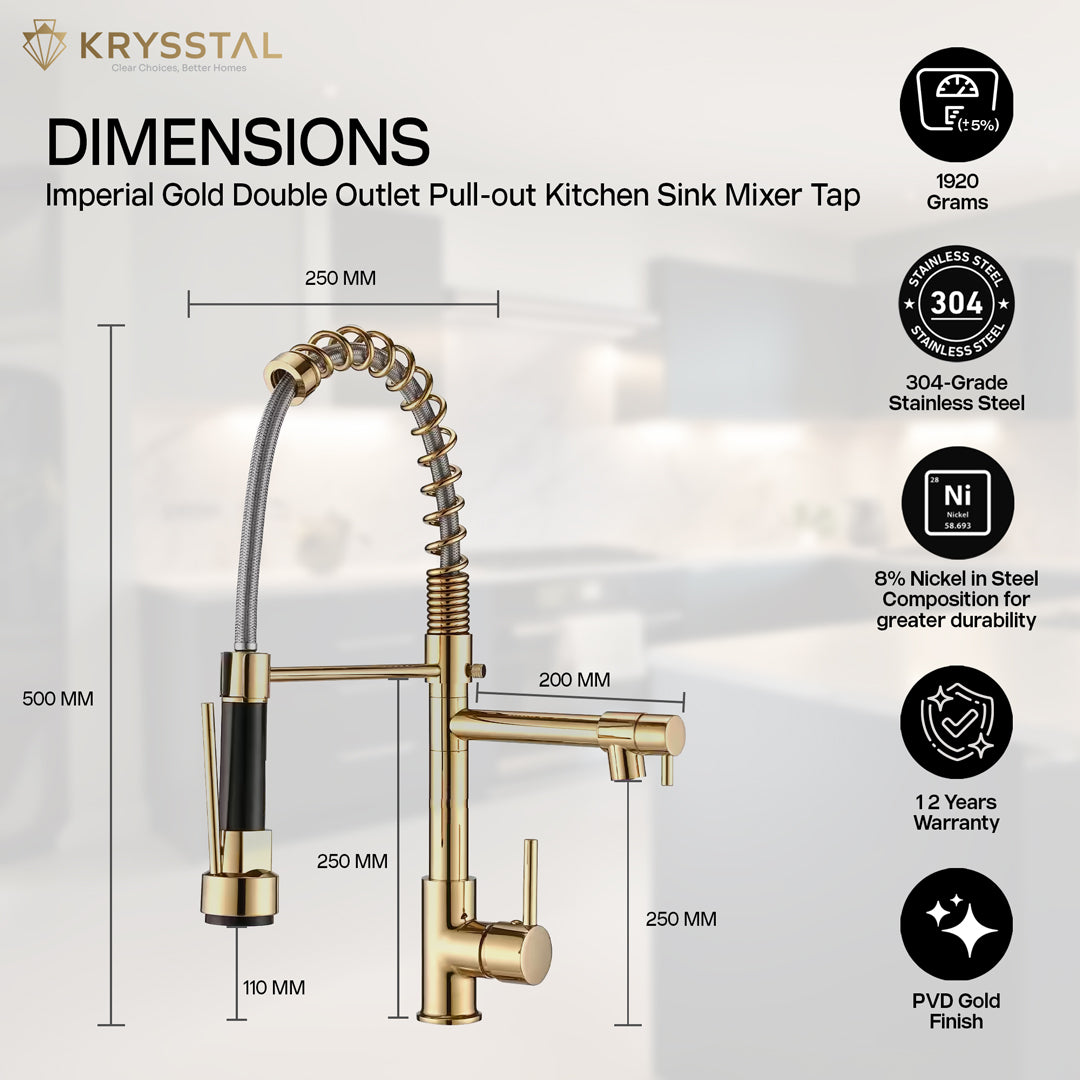 The Imperial Gold Double Outlet Pull-out Kitchen Sink Mixer Tap offers both luxury and functionality with its durable 304-grade stainless steel and gold PVD coating, resisting rust and corrosion. It features two outlets: a pull-out sprayer with dual flow modes for flexible use, and a swivel stream spout for smooth water flow. The high-arch spring hose provides extra clearance for tall pots, while the secure docking keeps the sprayer tidy. With a single-lever mixer for easy control and a premium ceramic cartridge for lasting performance, this tap combines style and reliability in your kitchen.