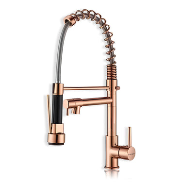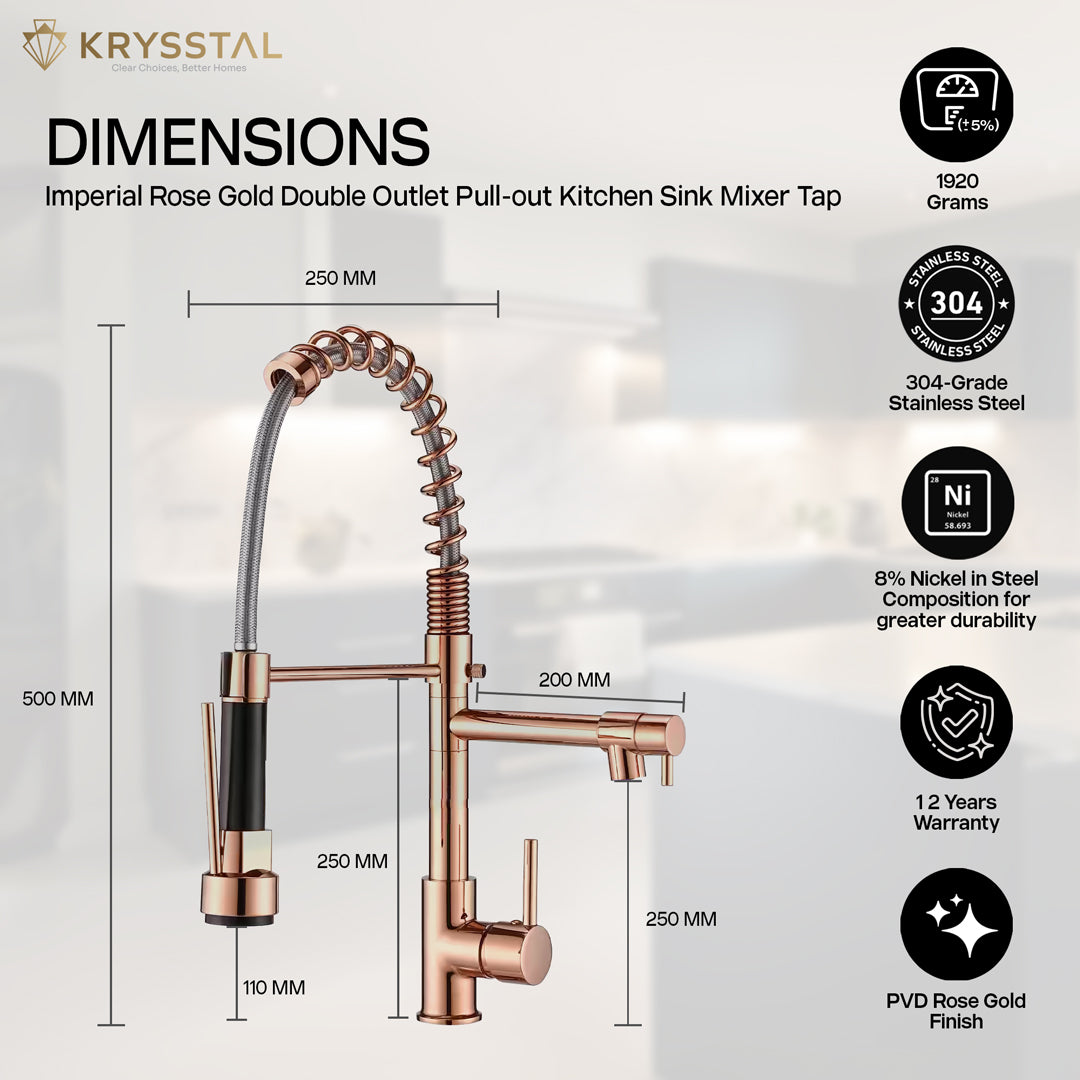 The Imperial Rose Gold Double Outlet Pull-out Kitchen Sink Mixer Tap offers durability and elegance with its 304-grade stainless steel and rose gold PVD finish. It features two outlets: a pull-out sprayer with dual flow modes for versatile use, and a swivel spout with smooth, efficient water flow. The high-arch spring hose fits tall pots and docks securely to keep your sink organized. With easy single-lever control and a ceramic cartridge tested for long-lasting performance, this tap combines style and practicality for your kitchen.
