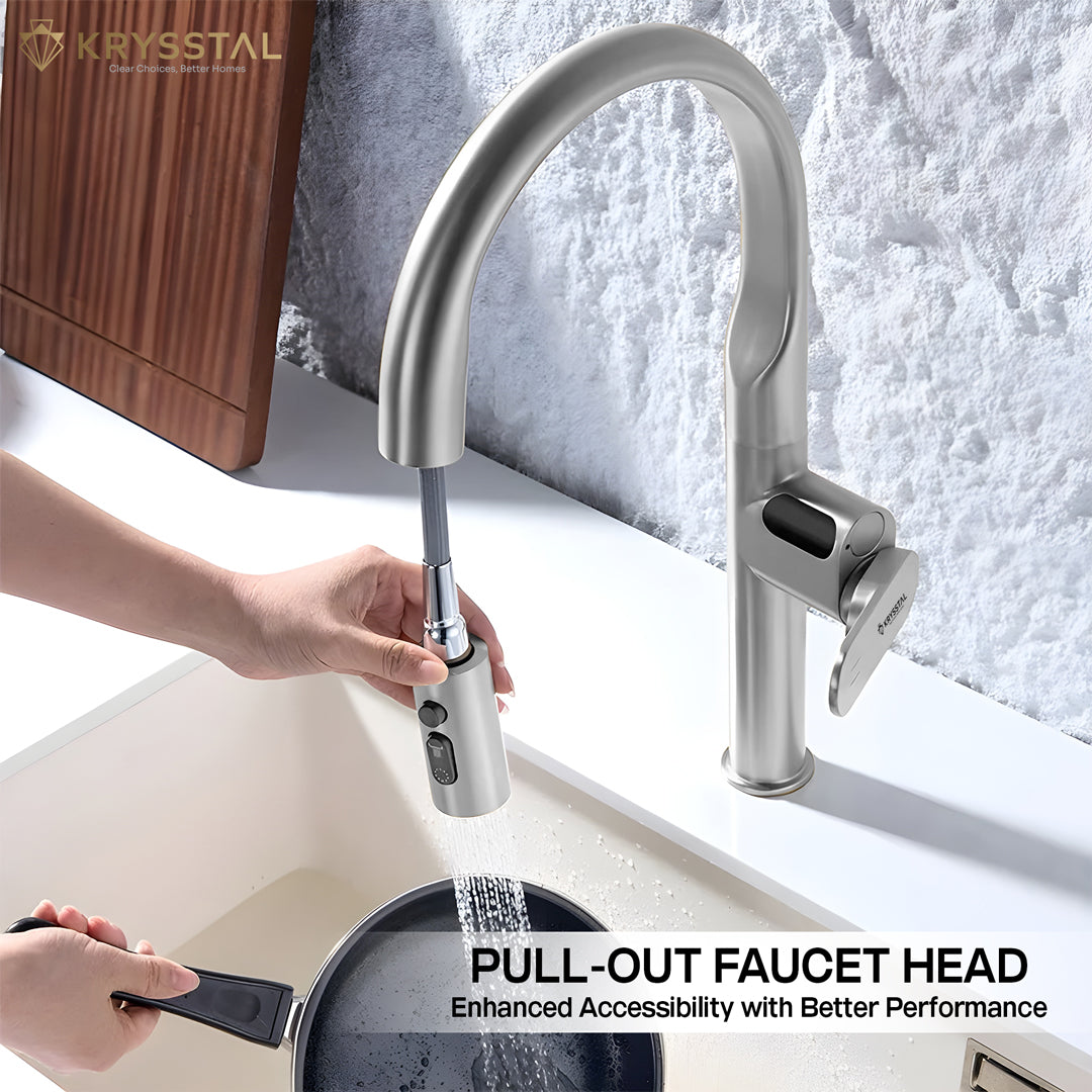A. Yes, many KRYSSTAL mixer faucets include a pull-out spray head feature, which is ideal for rinsing vegetables, cleaning large utensils, and reaching all corners of the sink.