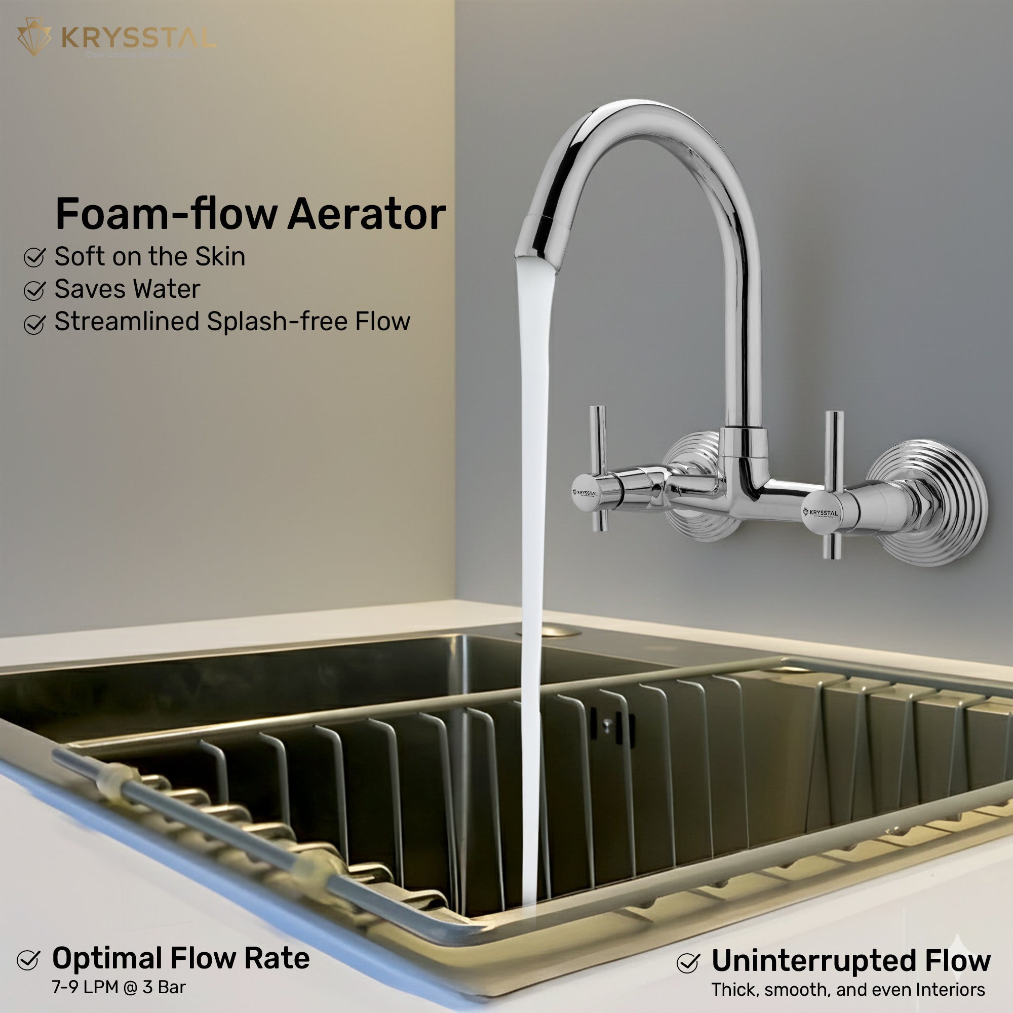 Double handle wall mount mixer taps allow better control over hot and cold water mixing, save counter space, and add a classic yet functional look to kitchen spaces.