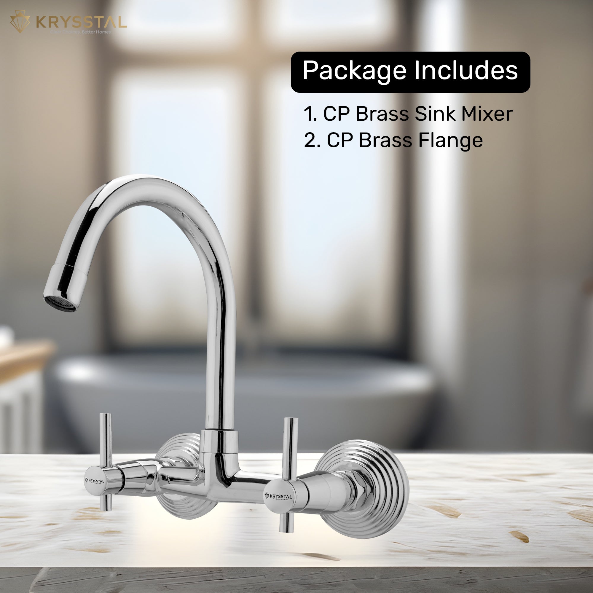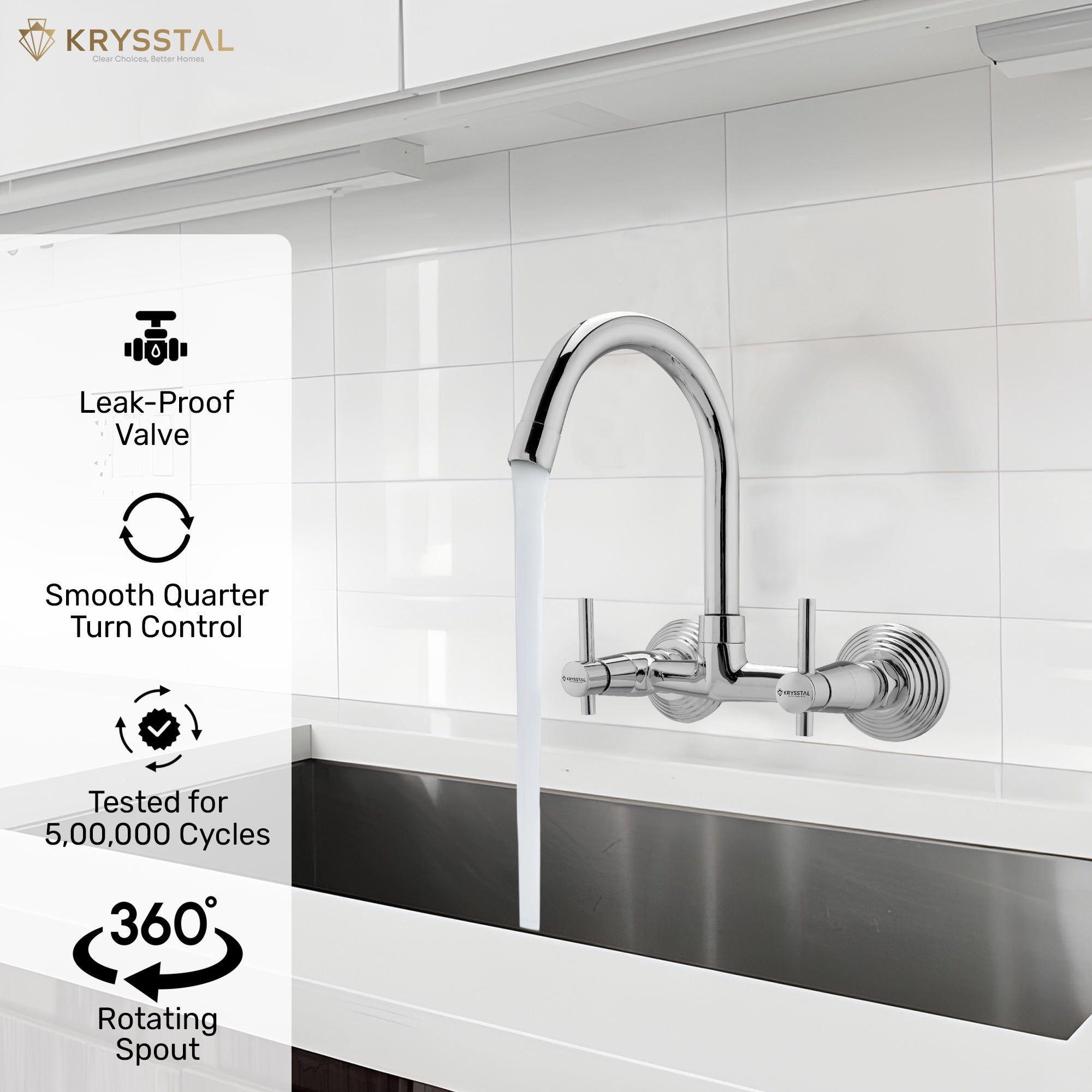 A wall mount kitchen sink mixer tap with double handle is installed on the wall above the sink and features two separate handles — one for hot water and one for cold — giving you precise control over water temperature and flow.