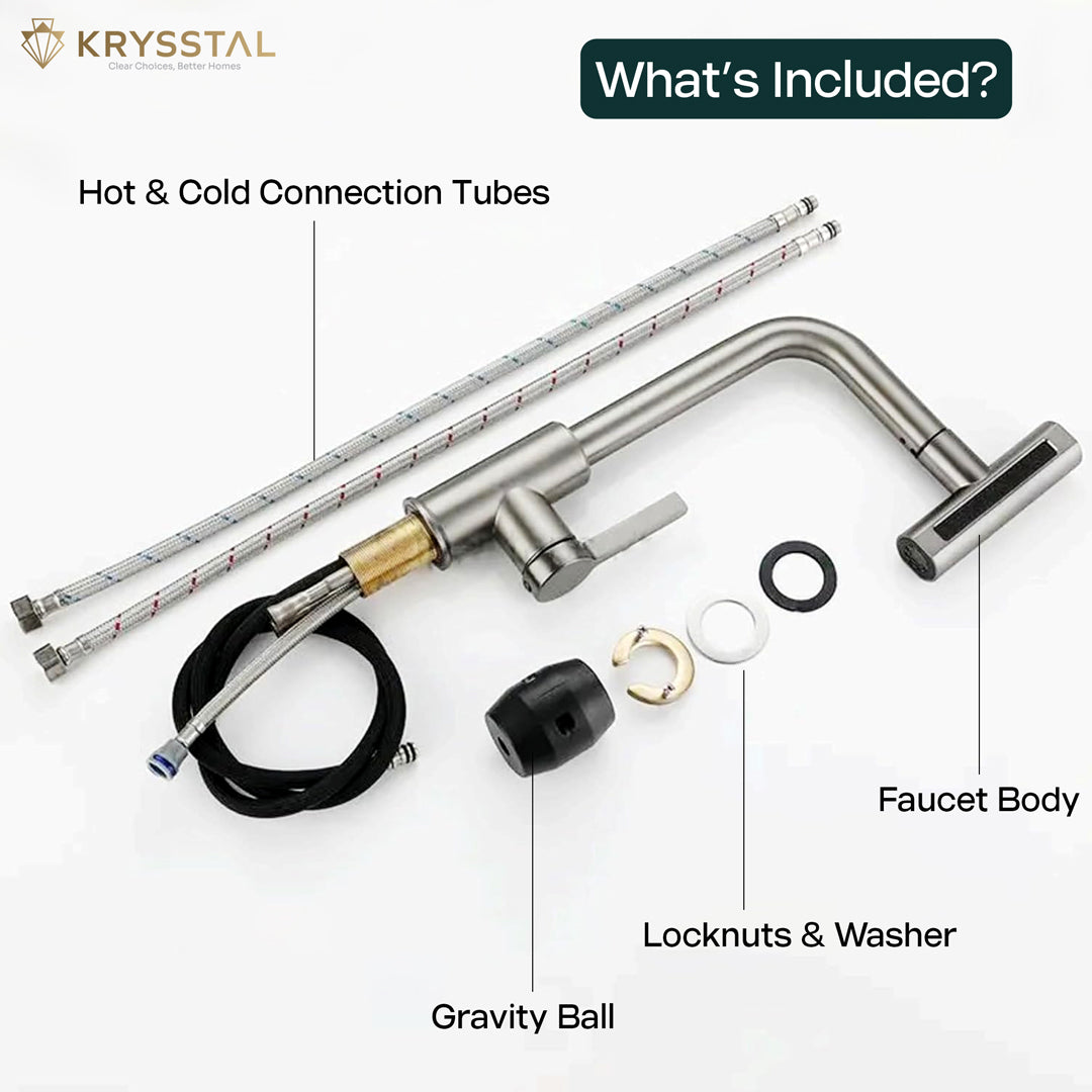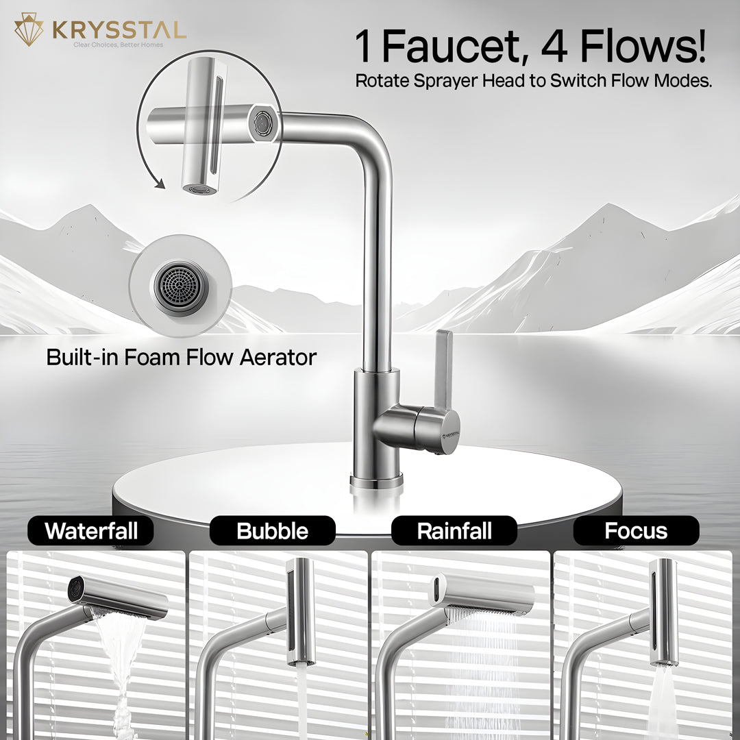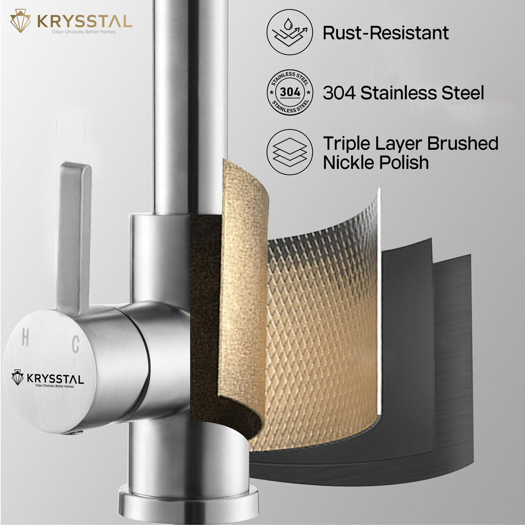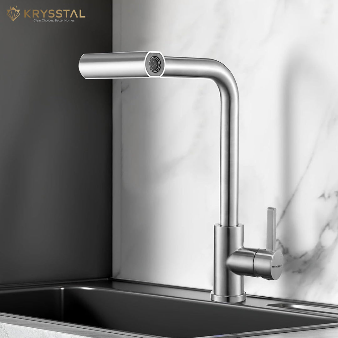 KRYSSTAL kitchen sink mixer faucets are made using 304-grade stainless steel and brass ingots, ensuring exceptional durability, rust resistance, and a sleek, polished appearance.
