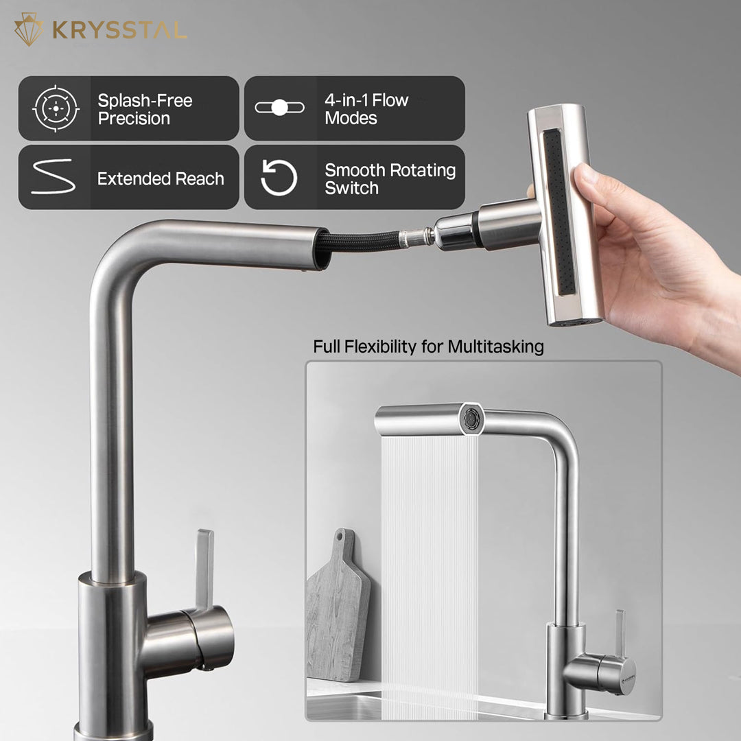• Pull-out Function: Retractable Sprayer Head with multiple flow modes controlled by a convenient trigger, offers flexible reach for multitasking.