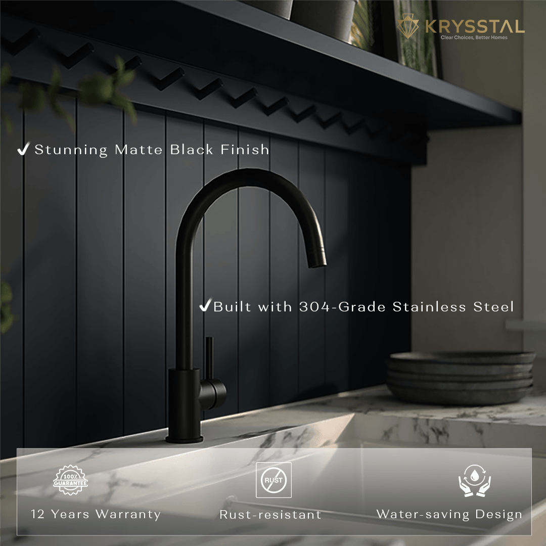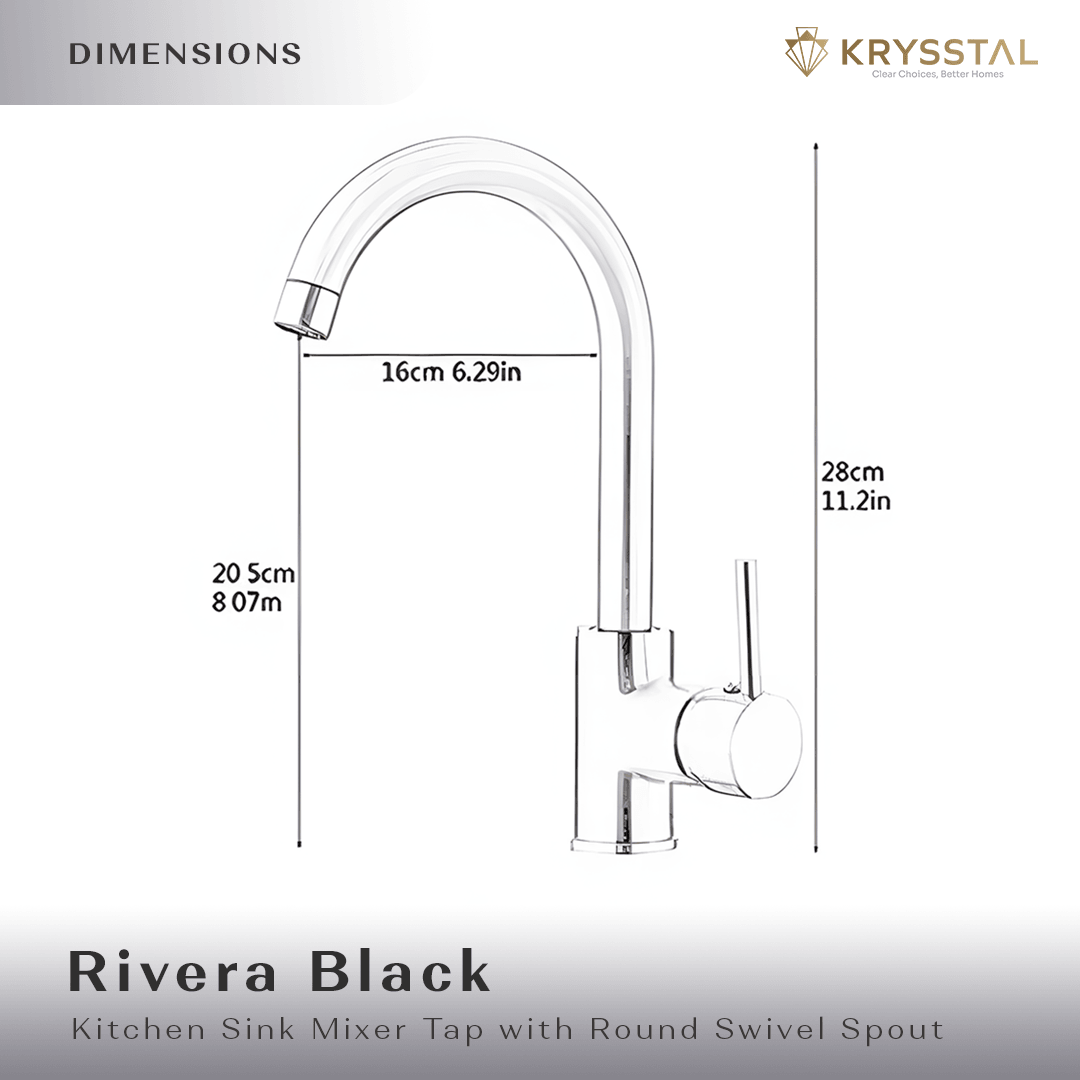The Rivera Black Kitchen Sink Mixer Tap is made from durable 304-grade stainless steel with a sleek black PVD coating that resists rust and corrosion. Its 360° swivel spout offers easy movement for better access, while the single-lever control lets you adjust water flow and temperature smoothly. Equipped with a premium ceramic disc cartridge tested for long-lasting use, it delivers efficient, splash-free water flow for an effortless kitchen experience.