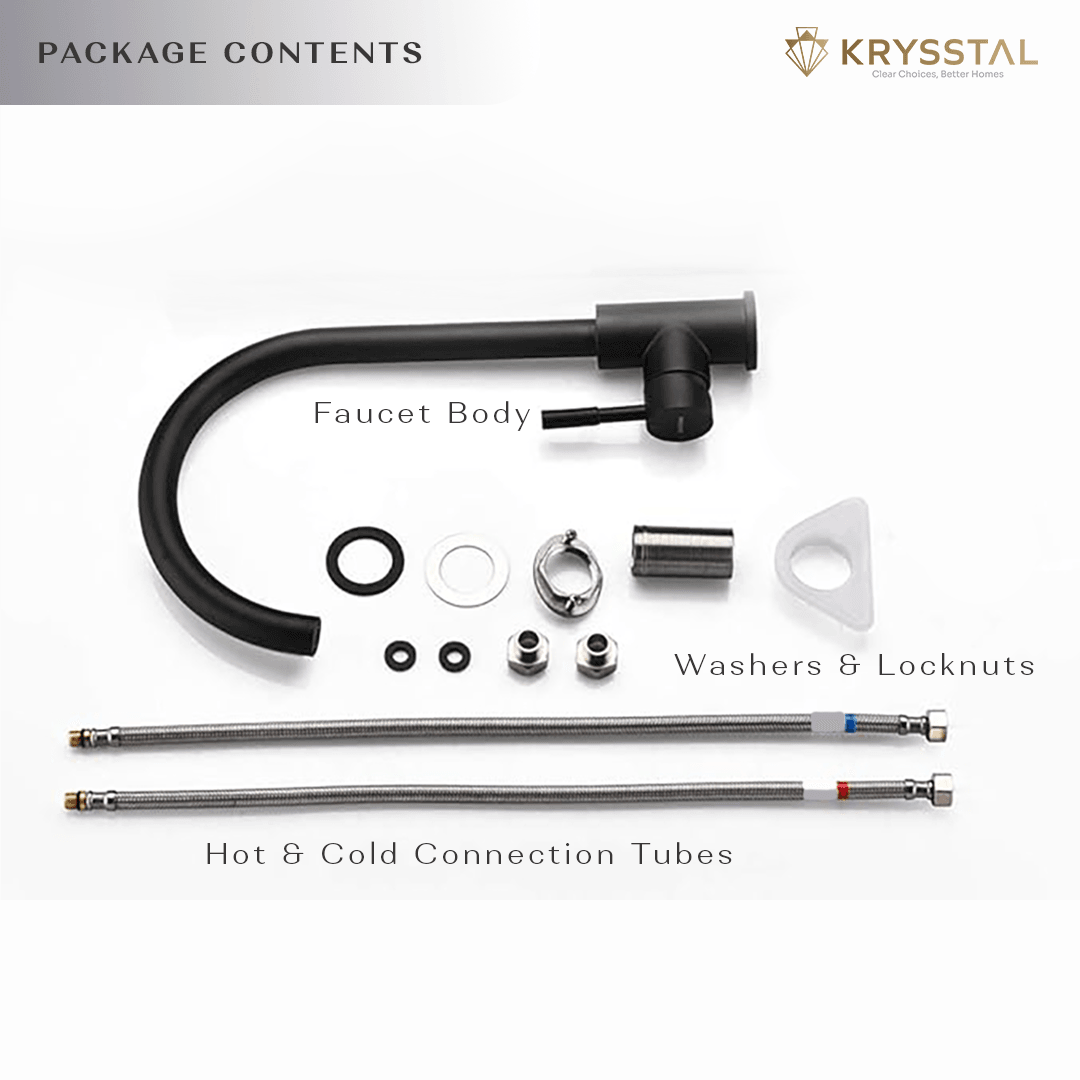 • Package Contents: 1 x Faucet Body, 1 x Hot & Cold Connection Tubes Set, 1 x Washers & Nut Set