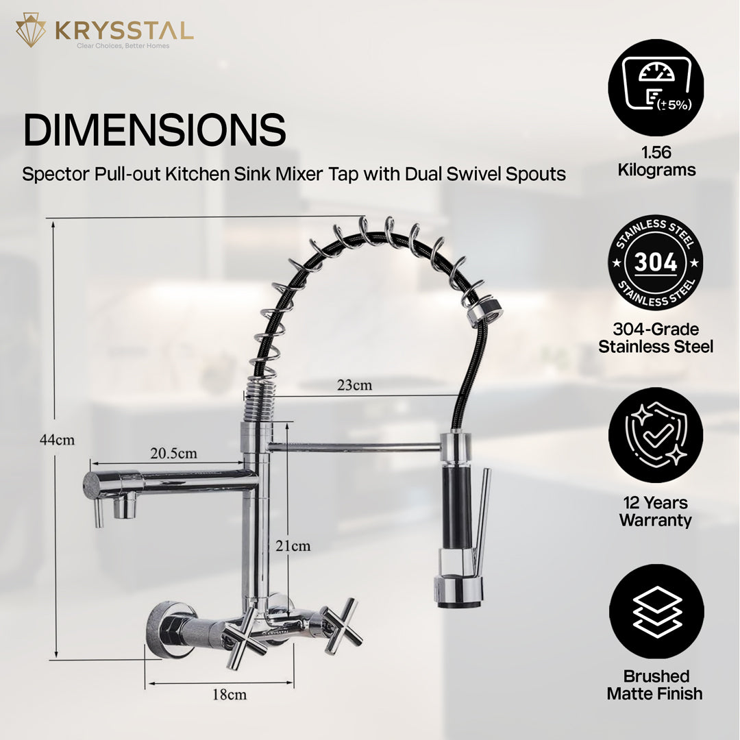 The Spector Pull-out Kitchen Sink Mixer Tap is made from durable 304-grade stainless steel with a silver matte finish that resists rust and corrosion. It features two outlets: a pull-out sprayer with dual flow modes for versatile use and a swivel stream spout with smooth, efficient flow. The high-arch spring hose provides extra space for tall cookware, and a secure docking system keeps the sprayer in place. Dual handles allow easy control of water flow and temperature, while a premium ceramic cartridge ensures long-lasting, reliable performance.
