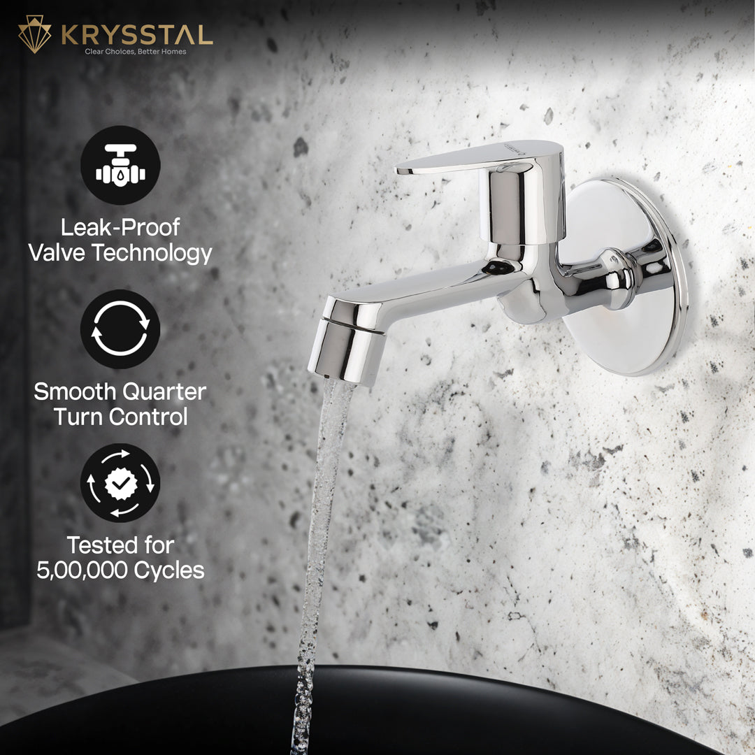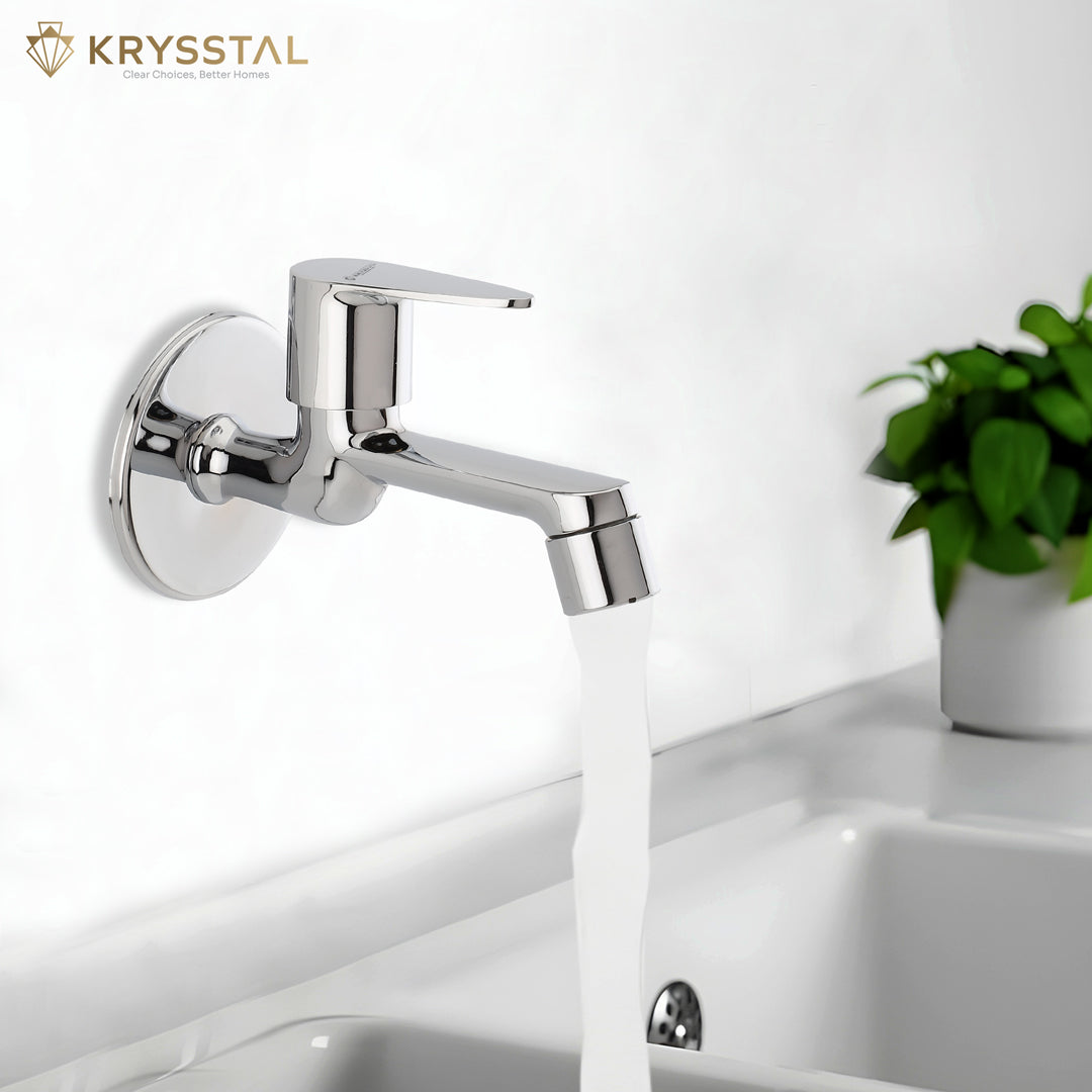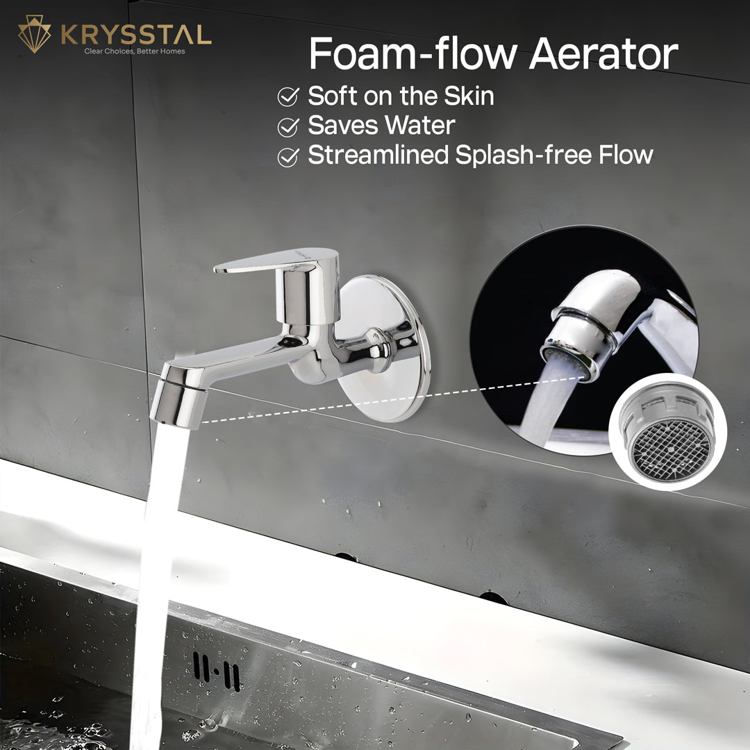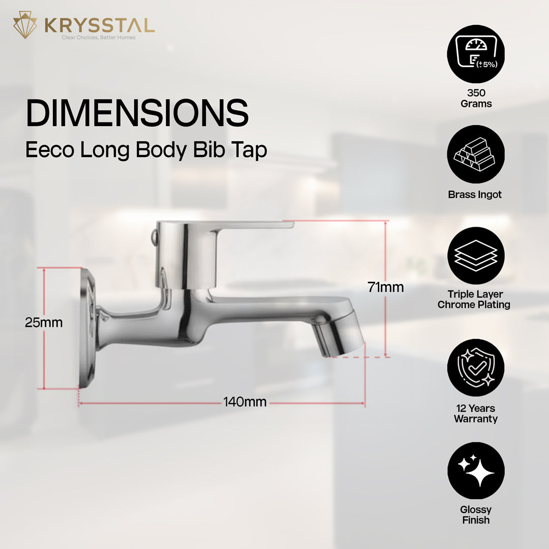 The Eeco Long Body Bib Tap is made from solid brass with a triple chrome finish that resists rust, corrosion, and heat. Its foam aerator saves water while reducing splashes and noise. Designed for smooth, leak-free flow at 6-10 LPM, it features a quarter-turn handle for easy use. Suitable for bathrooms, kitchens, gardens, and more, this wall-mounted tap is easy to clean and built for lasting performance.