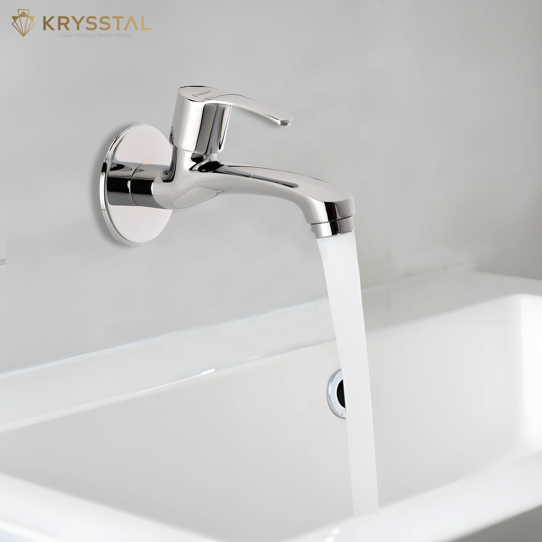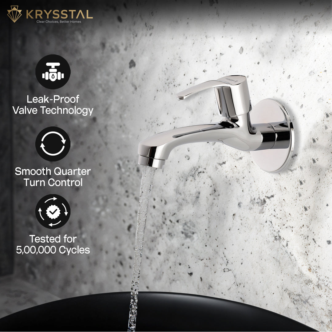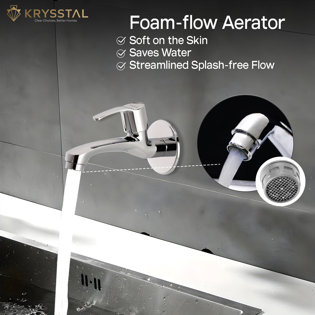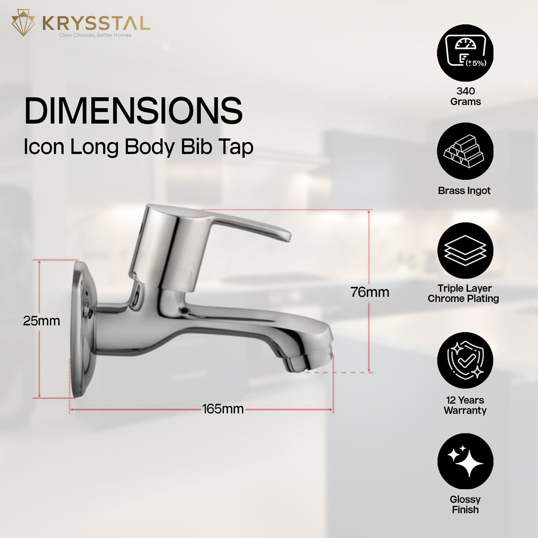 The Icon Long Body Bib Tap is made from solid brass with a triple chrome finish that resists rust, corrosion, and heat. Its foam aerator saves water while reducing splashes and noise. Designed for smooth, leak-free flow at 6-10 LPM, it features an easy quarter-turn handle. Suitable for bathrooms, kitchens, gardens, and more, this wall-mounted tap is simple to clean and built to last.