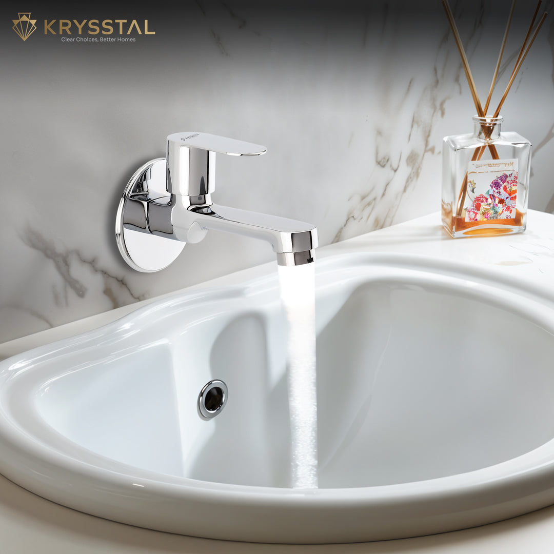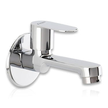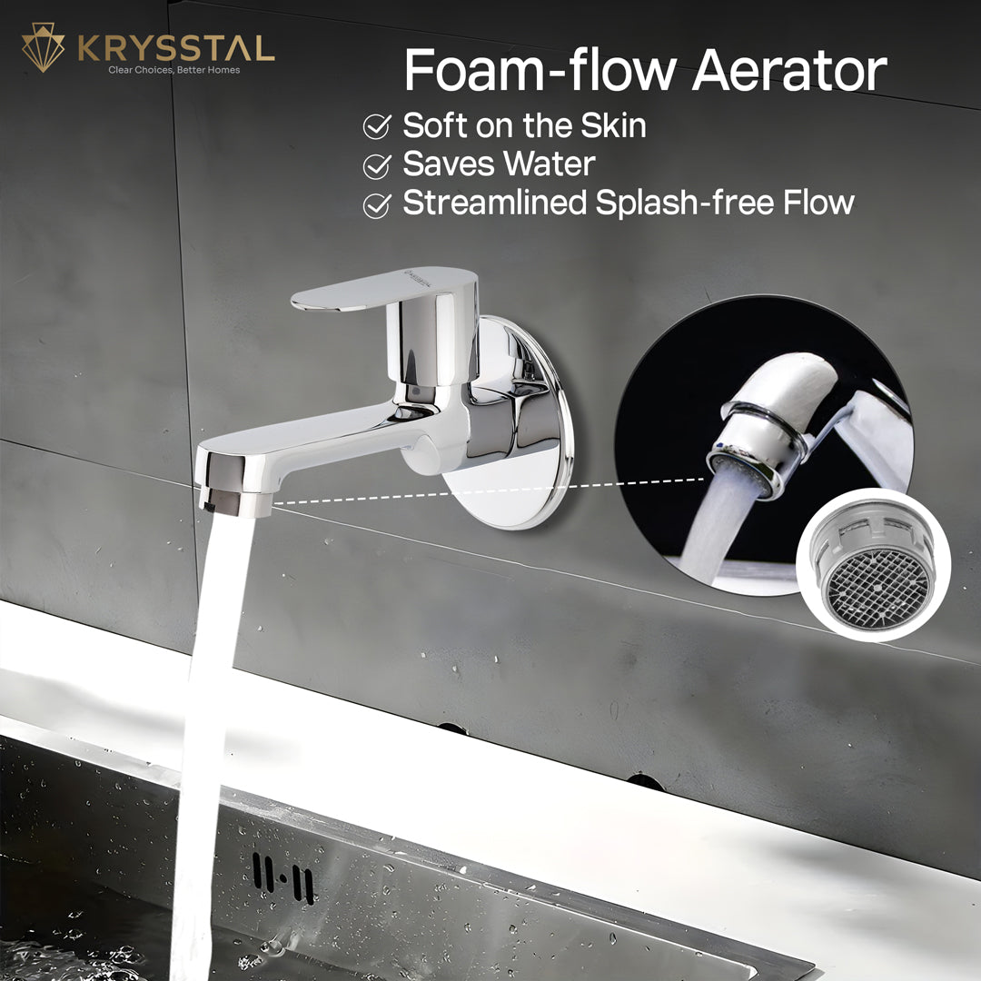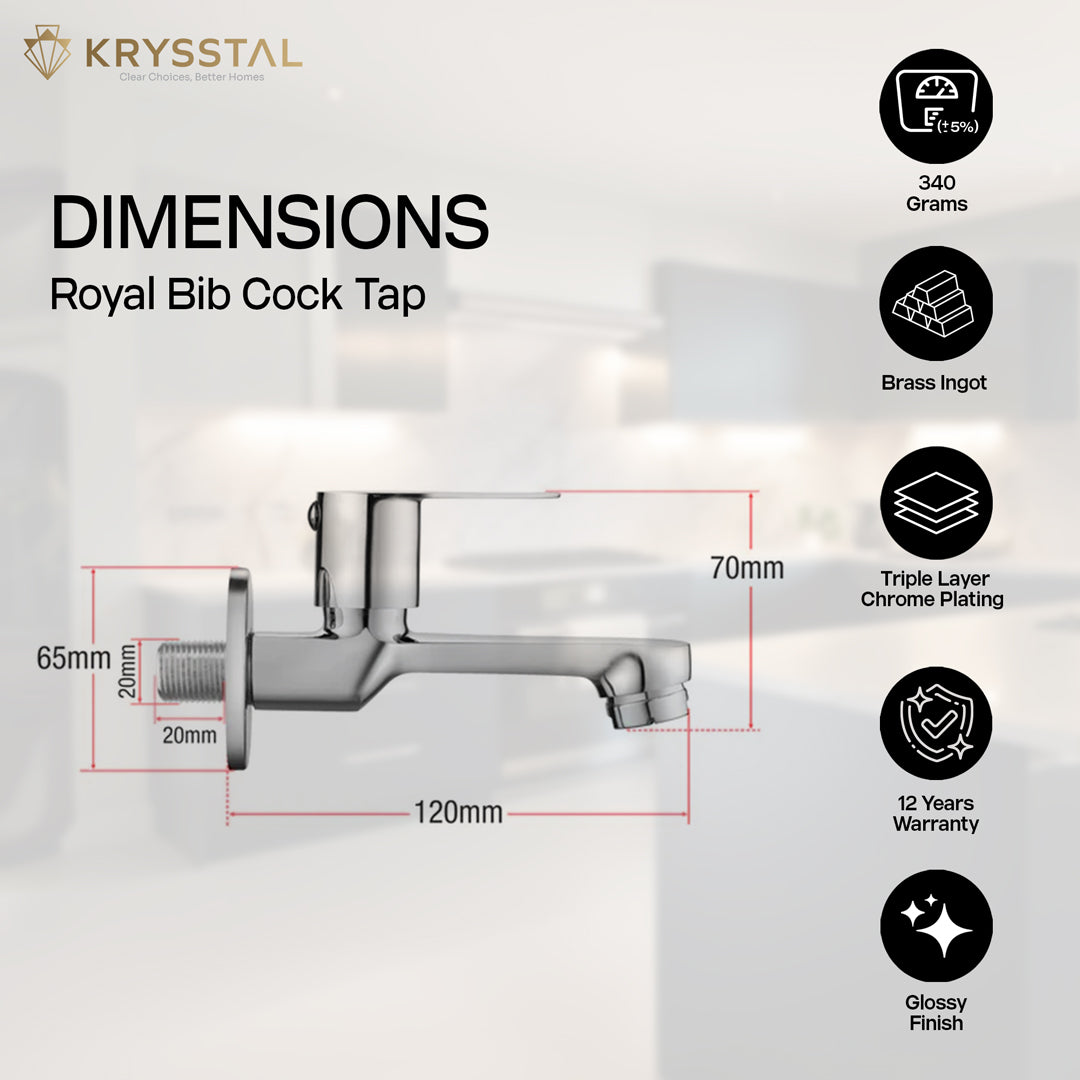 The Royal Bib Tap with Round Wall Flange is made from solid brass with a durable triple-layer chrome finish that resists rust and corrosion. Its foam aerator saves 50% water while reducing splashes and noise. Designed for leak-proof use, it offers smooth, drip-free operation with a reliable quarter-turn handle. Suitable for bathrooms, kitchens, gardens, and more, this tap is easy to clean and built to last.