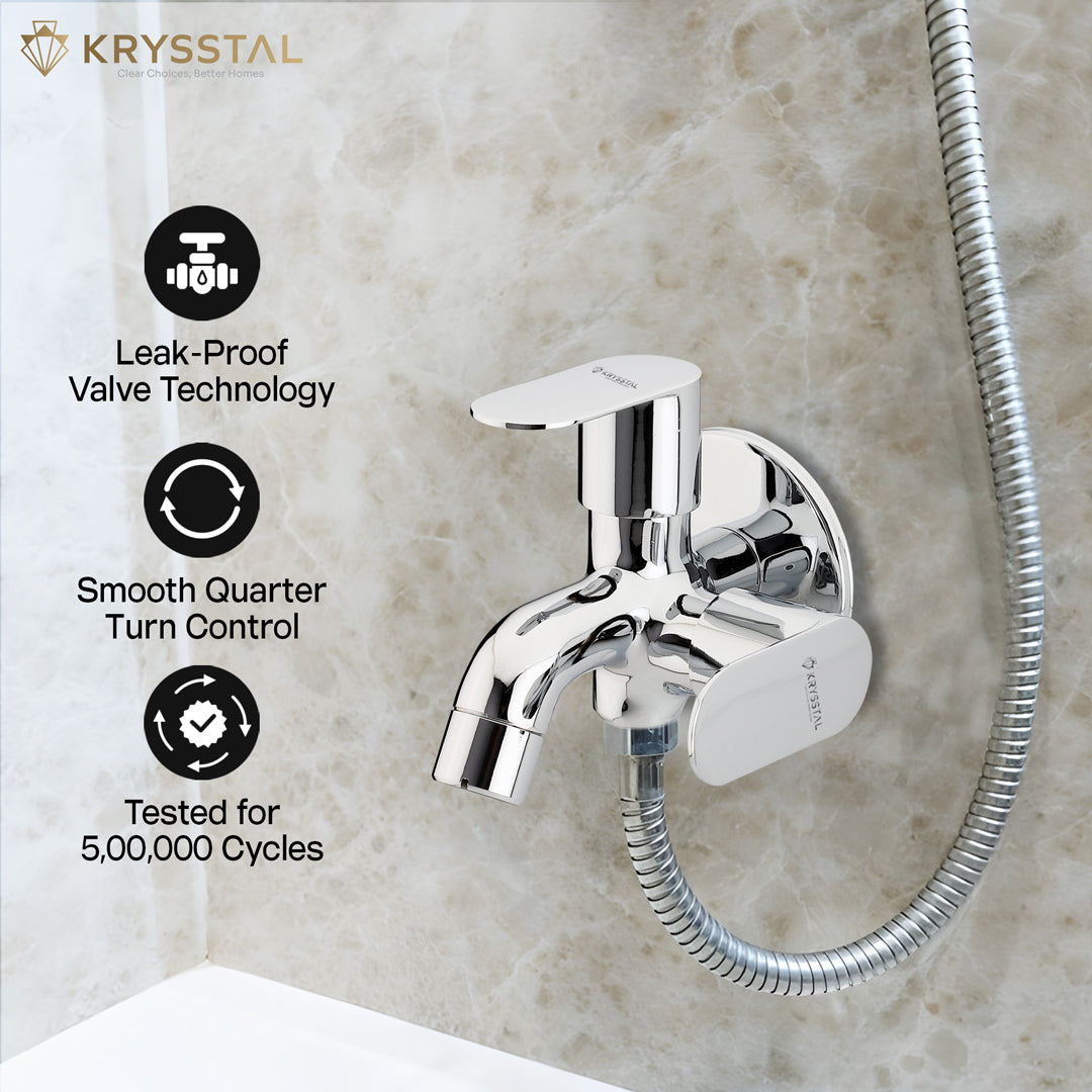 The Royal Two Way Bib Tap is made from solid brass with a triple chrome finish that resists rust, heat, and corrosion. It has two separate controls for easy water flow to a tap and another outlet, perfect for appliances like bidets or washing machines. The foam aerator saves water and reduces splashes and noise. Designed for smooth, leak-free flow at 6-10 LPM, this wall-mounted tap is easy to use, clean, and built to last.