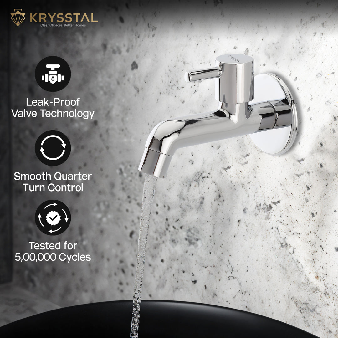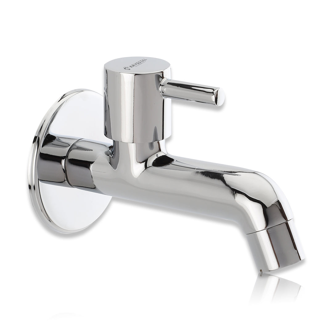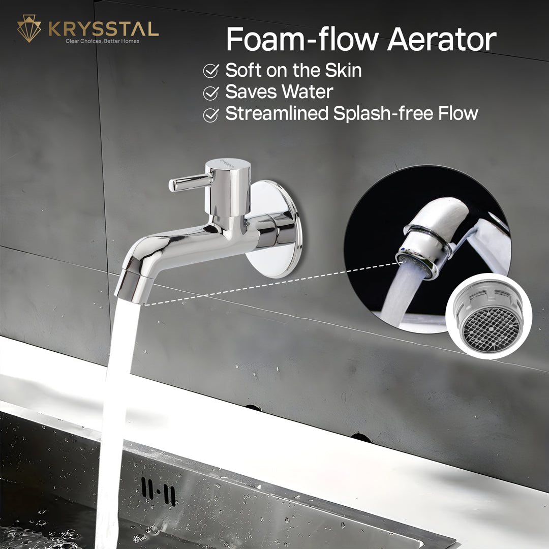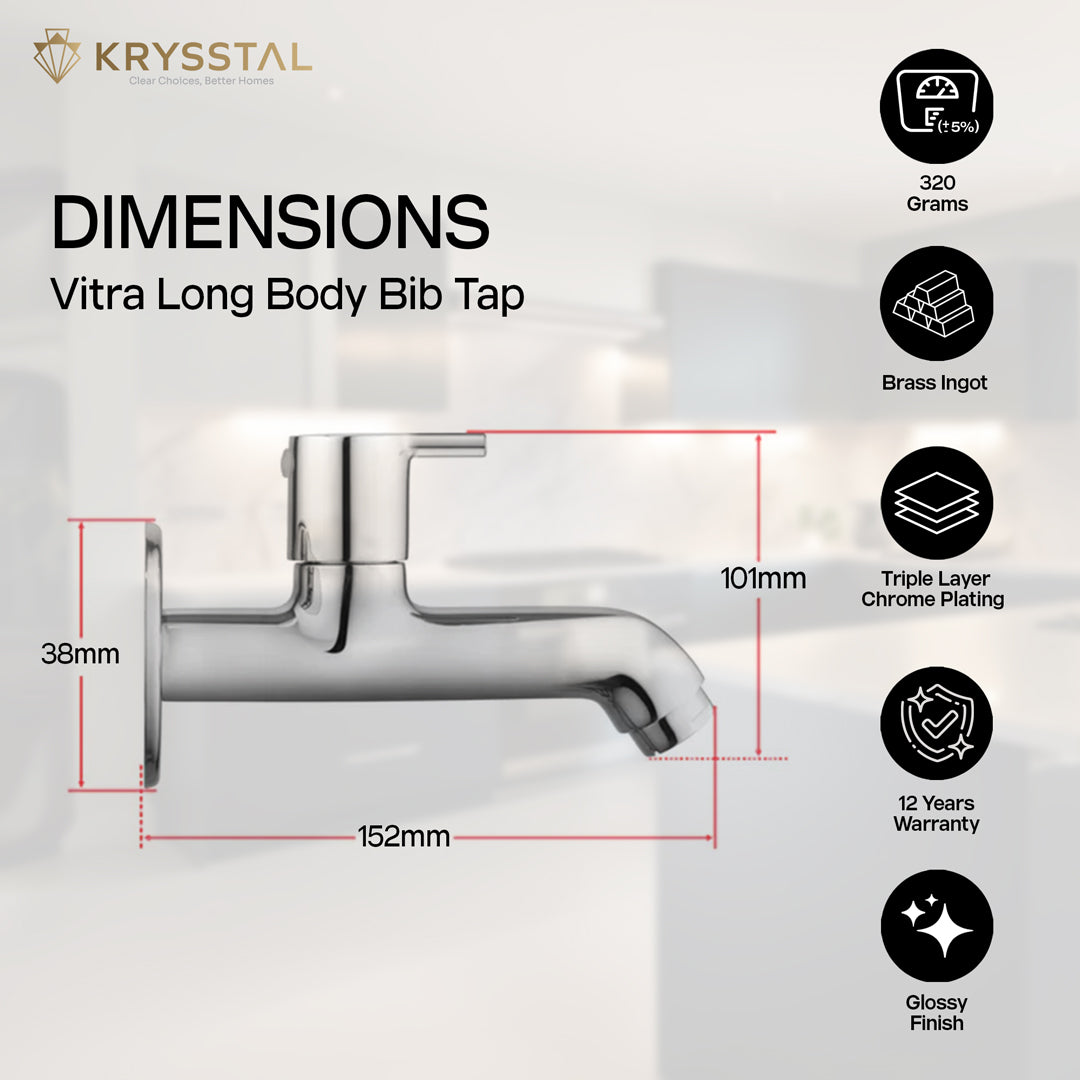 The Vitra Long Body Bib Tap is made of solid brass with a durable triple chrome finish that resists rust and heat. Its foam aerator saves water while cutting splashes and noise. Designed for steady, leak-free flow at 6-10 LPM, this wall-mounted tap suits bathrooms, kitchens, gardens, and more. It's easy-to-clean chrome surface maintains a fresh look with minimal effort.