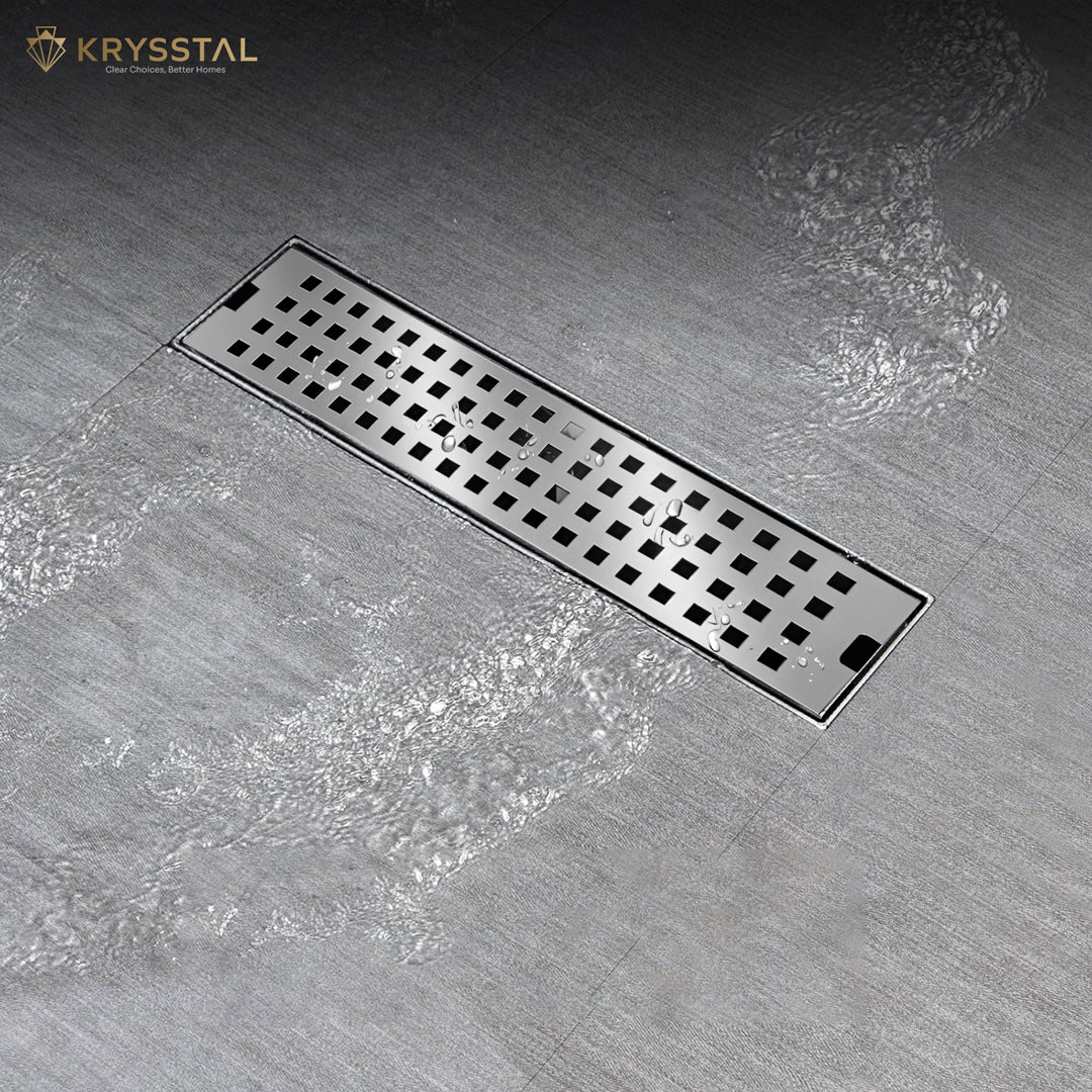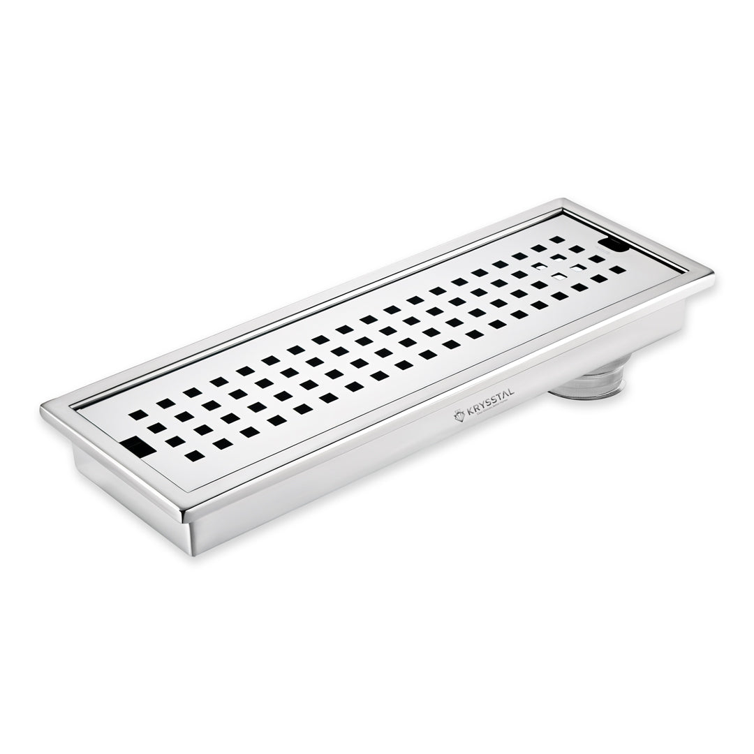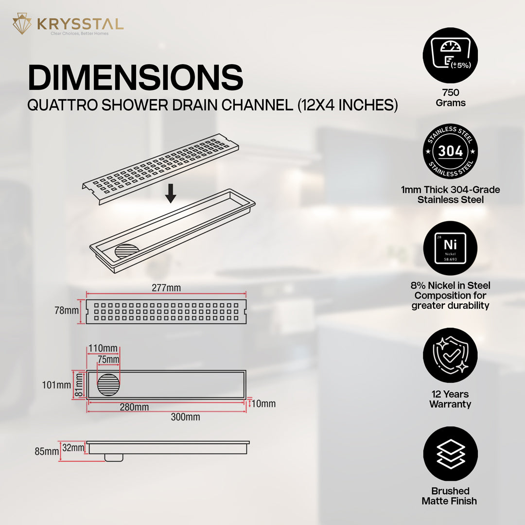 The Quattro 304-SS (12"x 4") Side Hole Shower Drain Channel is made from durable 304-grade stainless steel with a sturdy 1mm thickness, offering strong rust resistance and a modern brushed matte finish. This side hole drain includes a built-in cockroach trap that effectively blocks pests, odors, and clogs by catching hair, soap scum, and debris, keeping your sewage drain clear and flowing smoothly. Featuring Aqua-Vault technology, it handles heavy water flow for quick drainage, preventing water accumulation and keeping your bathroom floor dry. Its sleek, seamless design blends effortlessly with your flooring for a clean, polished look. Package includes a grating top, drain frame with tray, and cockroach trap. To maintain its longevity, clean regularly and avoid harsh chemicals.