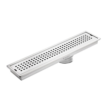 The Quattro 304-SS (24"x 4") Center Hole Shower Drain Channel is made from 304-grade stainless steel with a sturdy 1mm thickness, providing strong rust resistance and a sleek brushed matte finish. Its built-in cockroach trap effectively blocks pests, odors, and common clogs like hair and soap scum, keeping your drain clear. Equipped with Aqua-Vault Technology, this linear drain supports heavy water flow for fast drainage, preventing water buildup and keeping your bathroom floor dry. Its minimalist design fits seamlessly with the floor for a smooth, elegant look.
