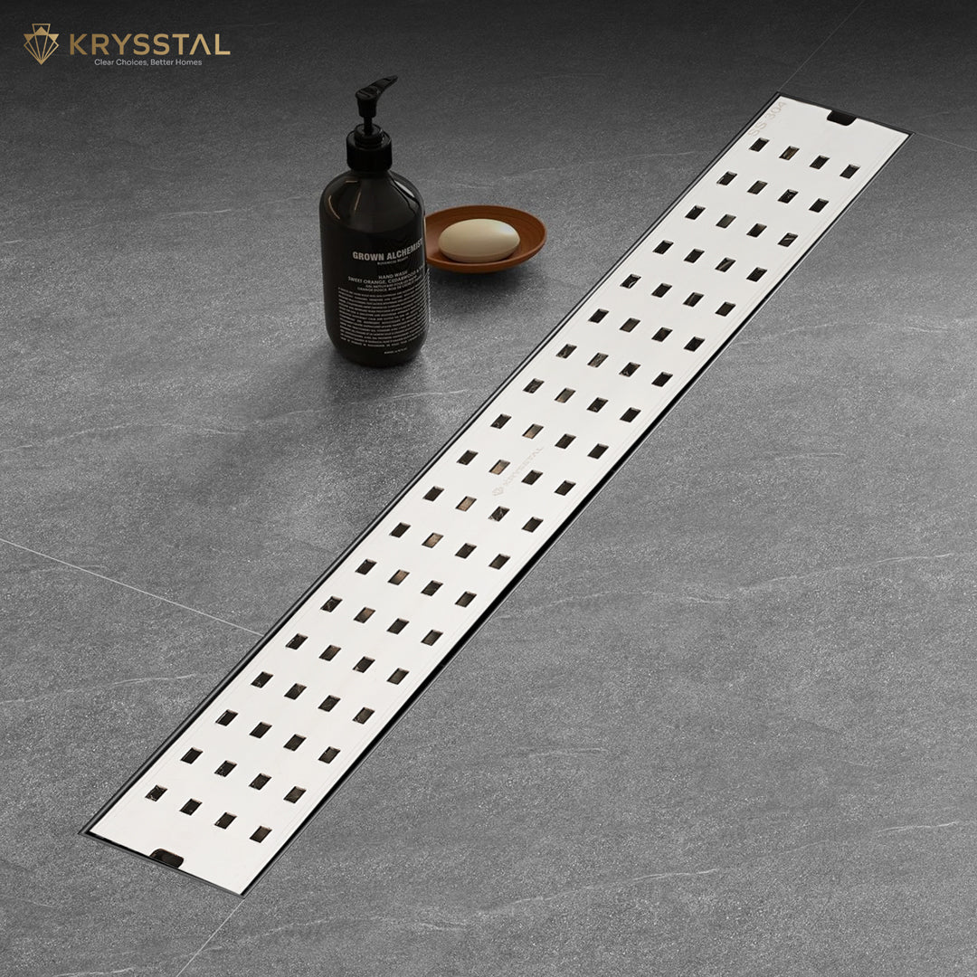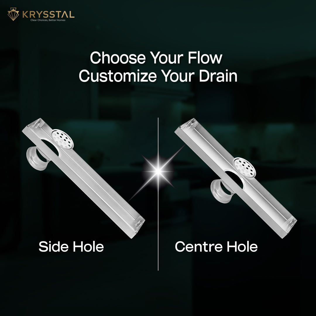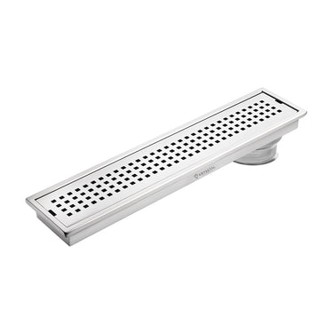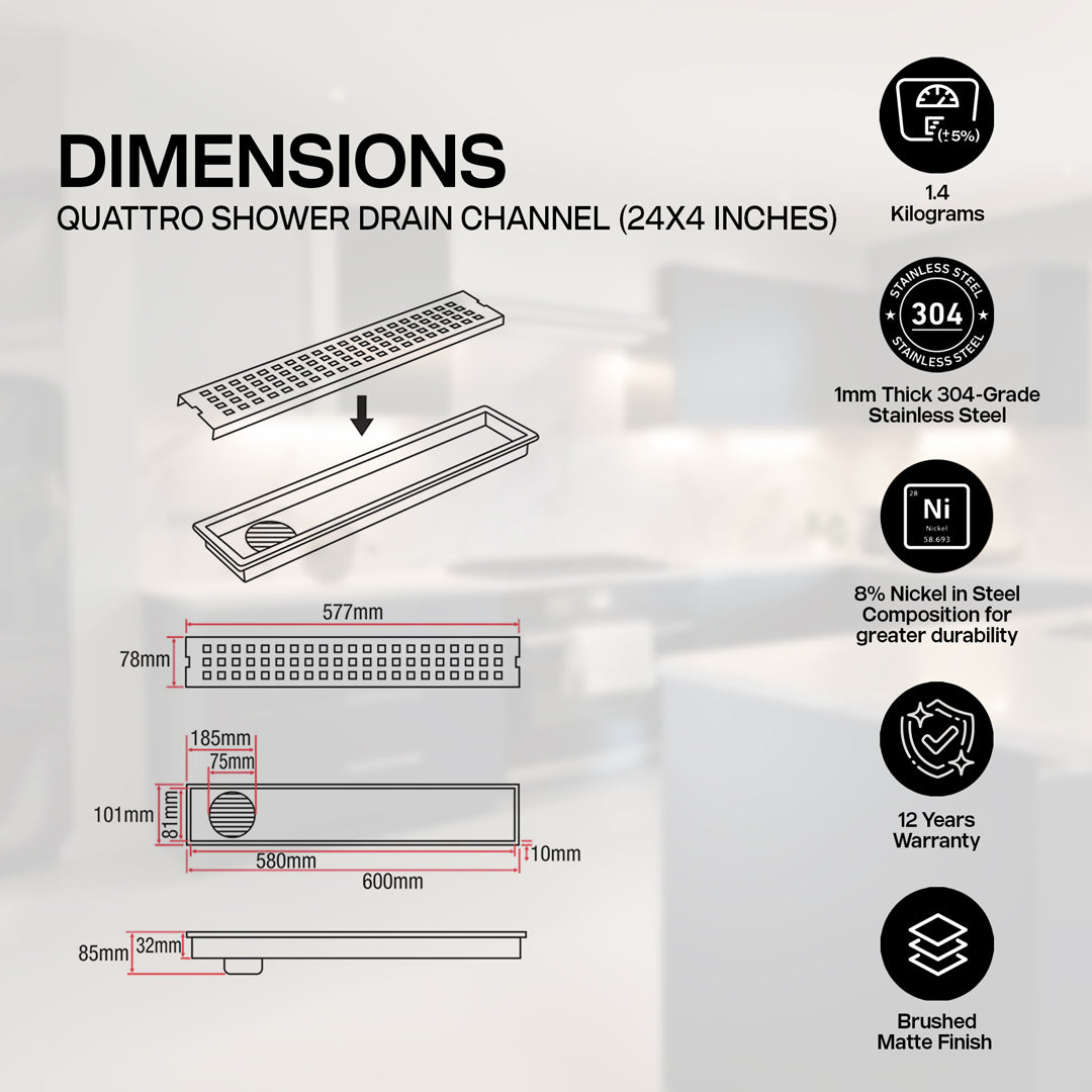 The Quattro 304-SS (24"x 4") Side Hole Shower Drain Channel is crafted from durable 304-grade stainless steel with a robust 1mm thickness, ensuring excellent rust resistance and a modern brushed matte finish. Its built-in cockroach trap effectively prevents pests, odors, and blockages by capturing hair, soap scum, and debris to keep your drain clear. Featuring Aqua-Vault Technology, this linear drain handles heavy water flow for fast drainage, stopping water from pooling and keeping your bathroom floor dry. Its sleek design blends seamlessly with the floor, offering a smooth, uninterrupted look that enhances your bathroom’s style.