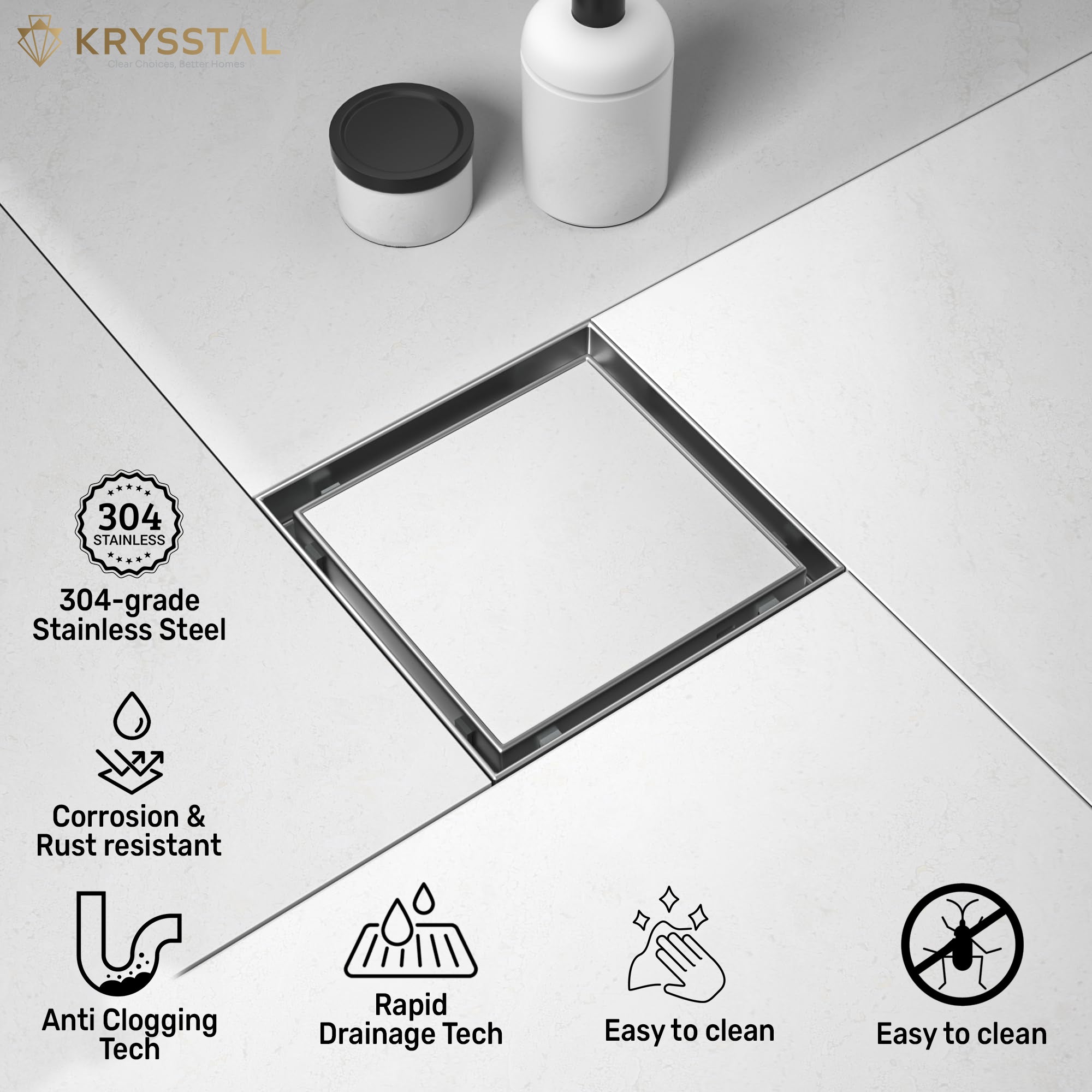 Equipped with an advanced internal trap, the drain blocks pests, foul odours, and backflow — keeping your bathroom fresh, clean, and protected without any extra effort.