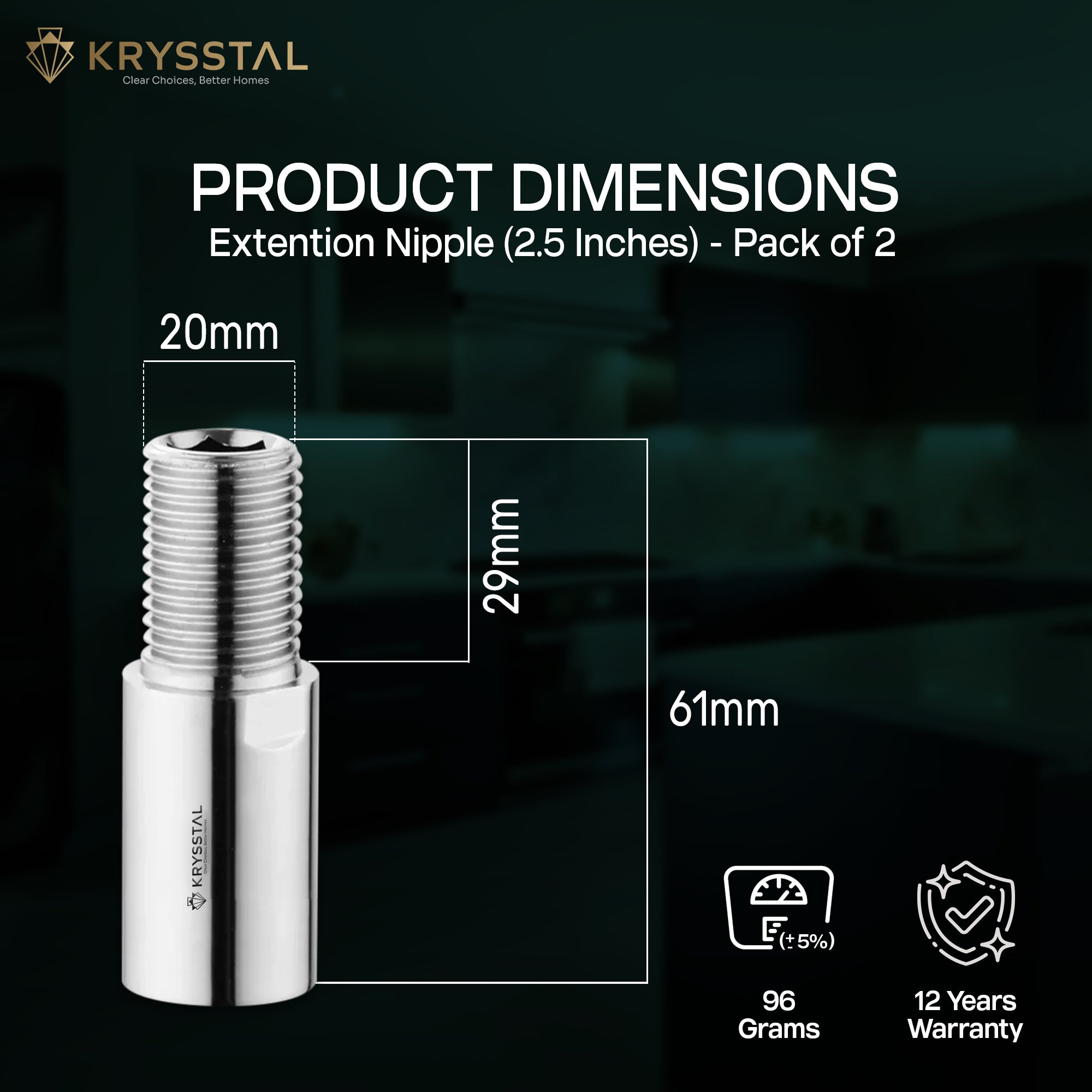 This pack of two 2.5-inch extension nipples is made from solid brass for durability and rust resistance. The triple chrome plating protects against corrosion and limescale, perfect for Indian bathrooms. With deep male threads, they fit securely and prevent leaks. The surface is easy to clean, ensuring long-lasting, reliable use.