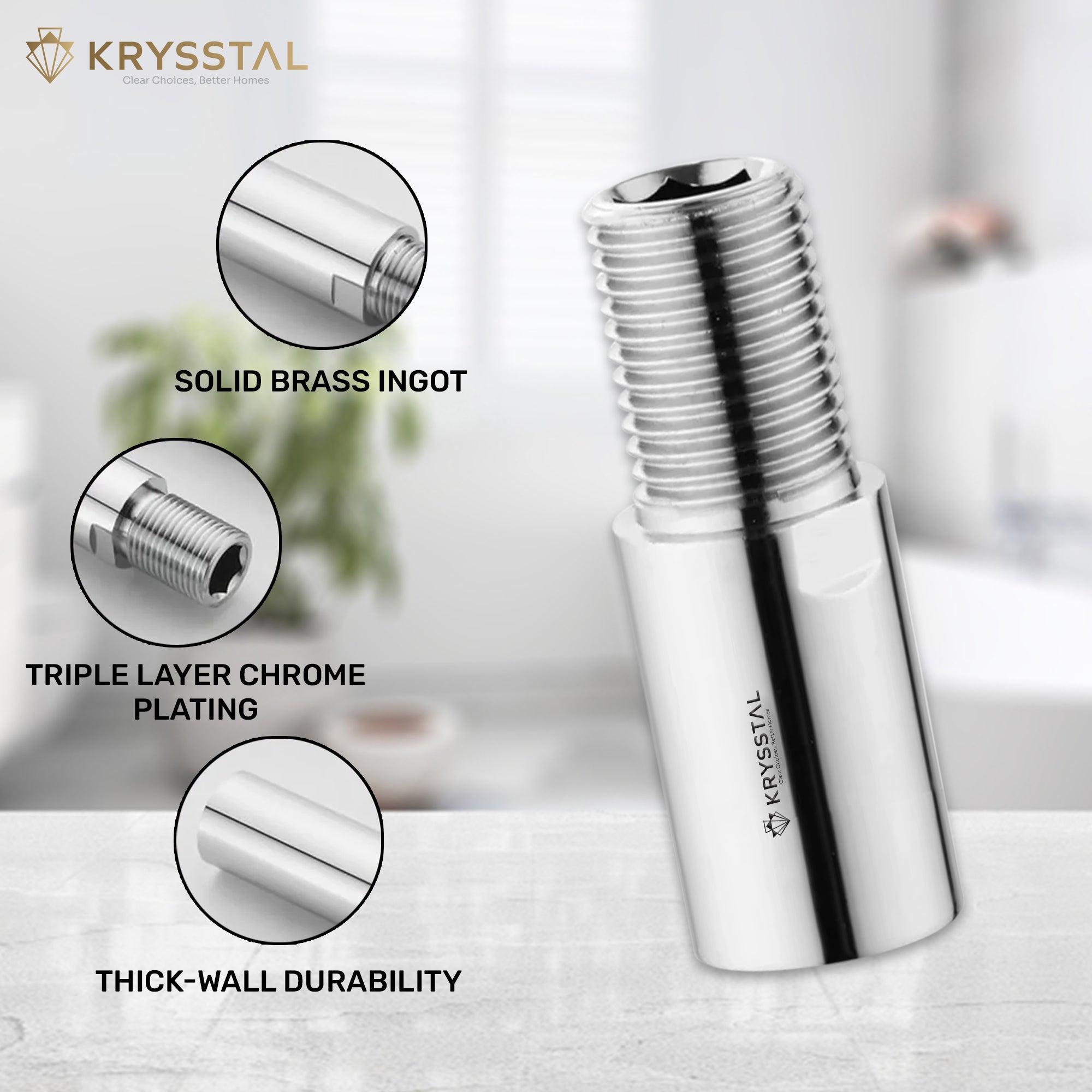 • FINISH: Triple-layered chrome plating (copper–nickel–chrome) gives mirror gloss and superior corrosion/limescale resistance. An ideal chrome-plated brass extension nipple for Indian bathrooms.