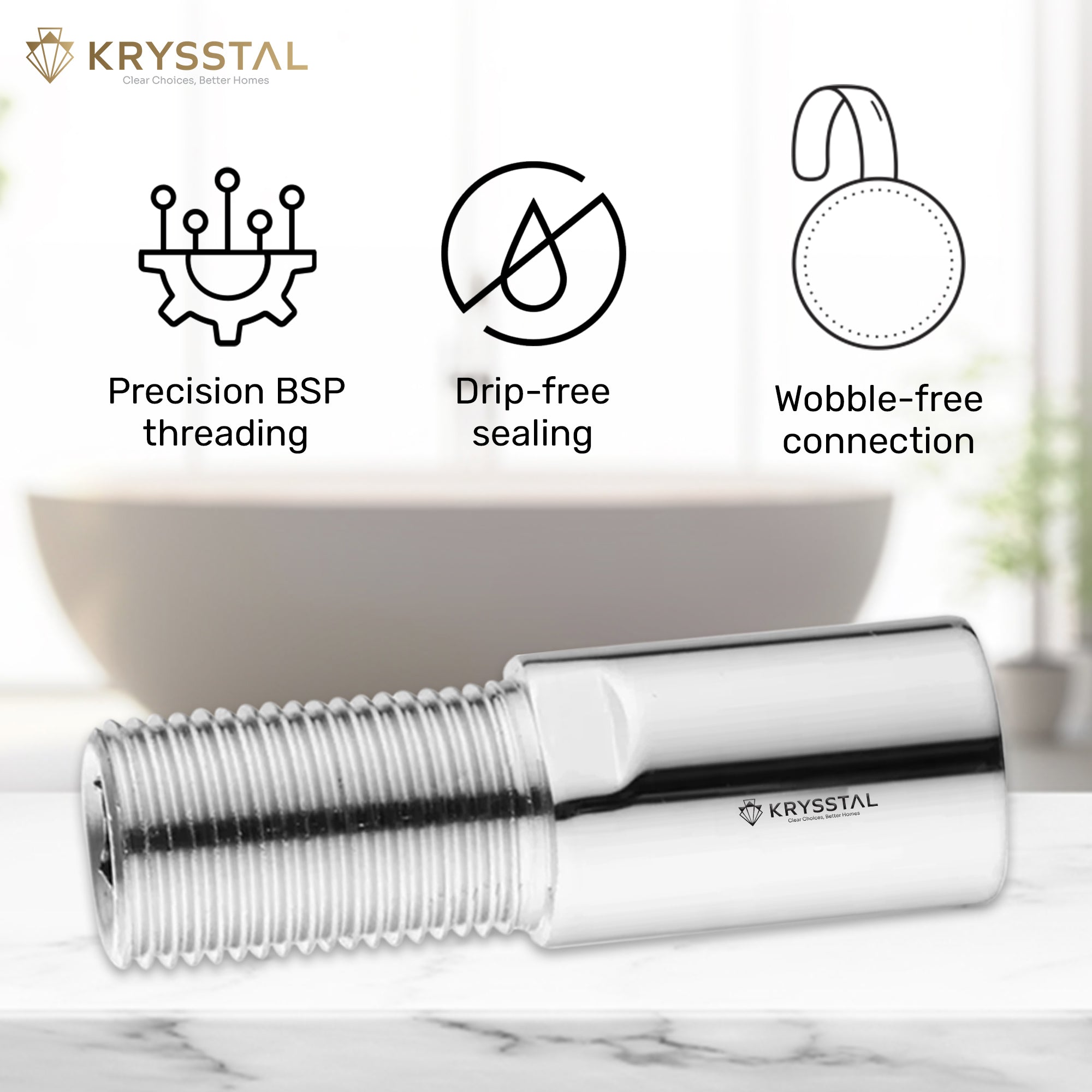 A chrome plated brass extension nipple (solid brass core, triple-layer chrome) is rust-free, limescale-resistant, and matches premium bathroom plumbing accessories.