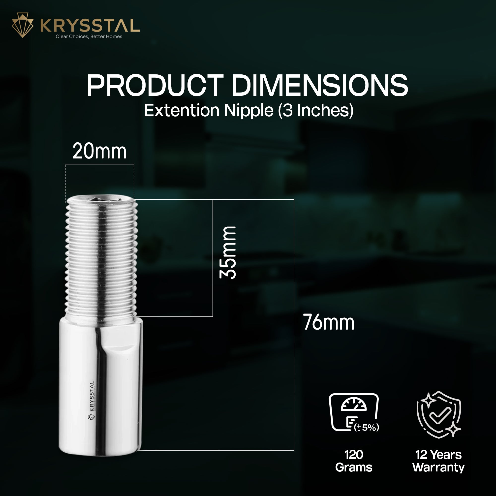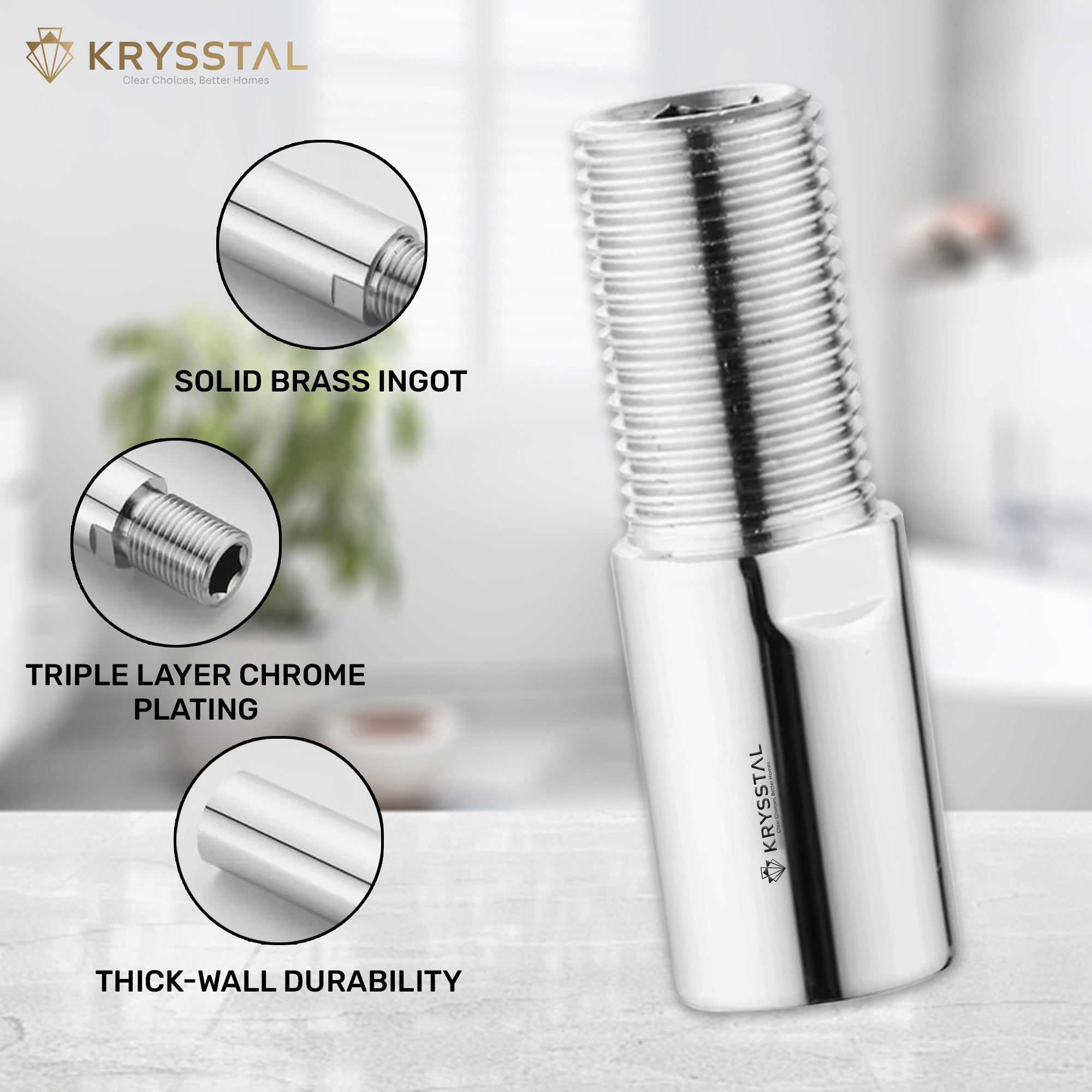 • FINISH: Triple-layered chrome plating (copper–nickel–chrome) gives mirror gloss and superior corrosion/limescale resistance. An ideal chrome-plated brass extension nipple for Indian bathrooms.