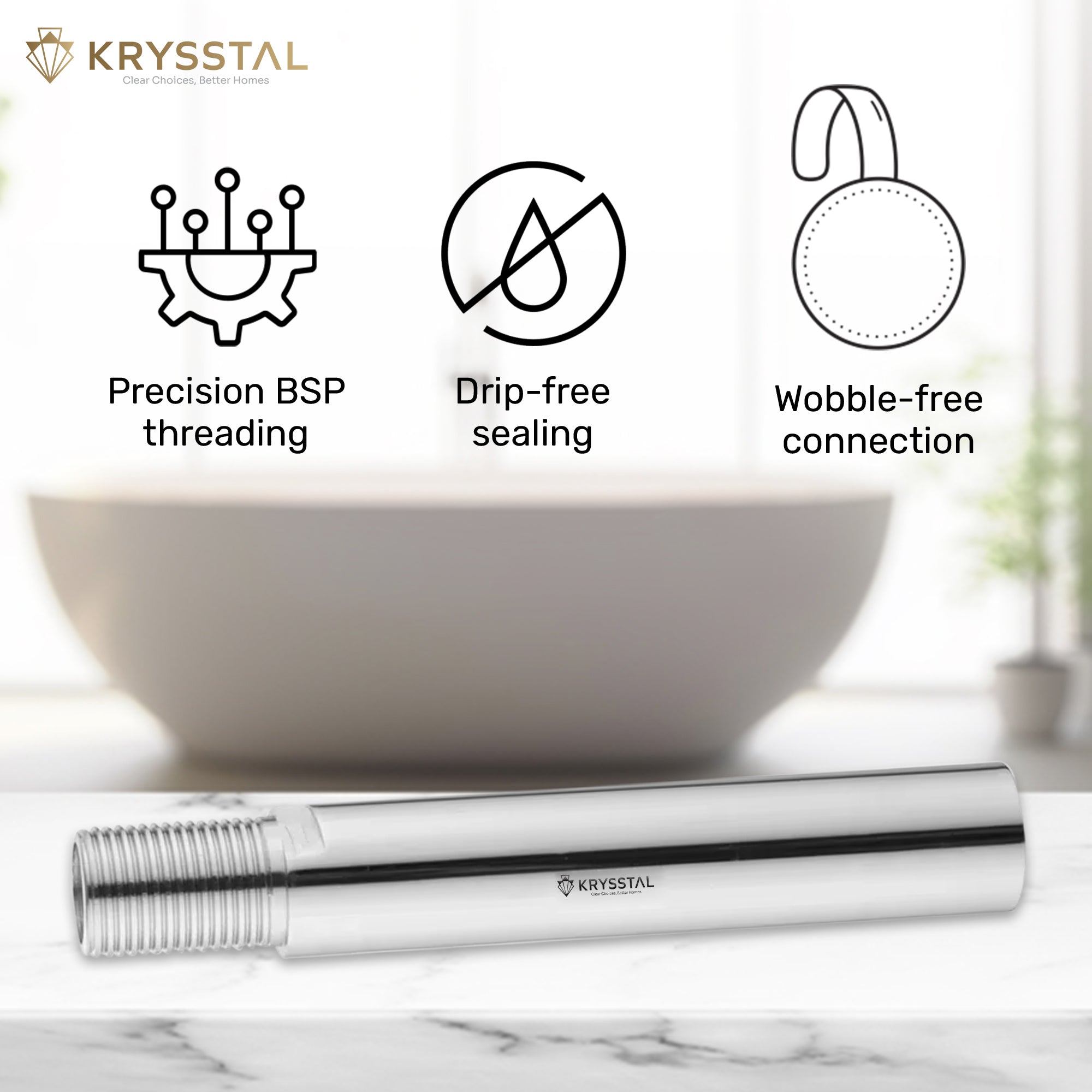 A chrome plated brass extension nipple (solid brass core, triple-layer chrome) is rust-free, limescale-resistant, and matches premium bathroom plumbing accessories.