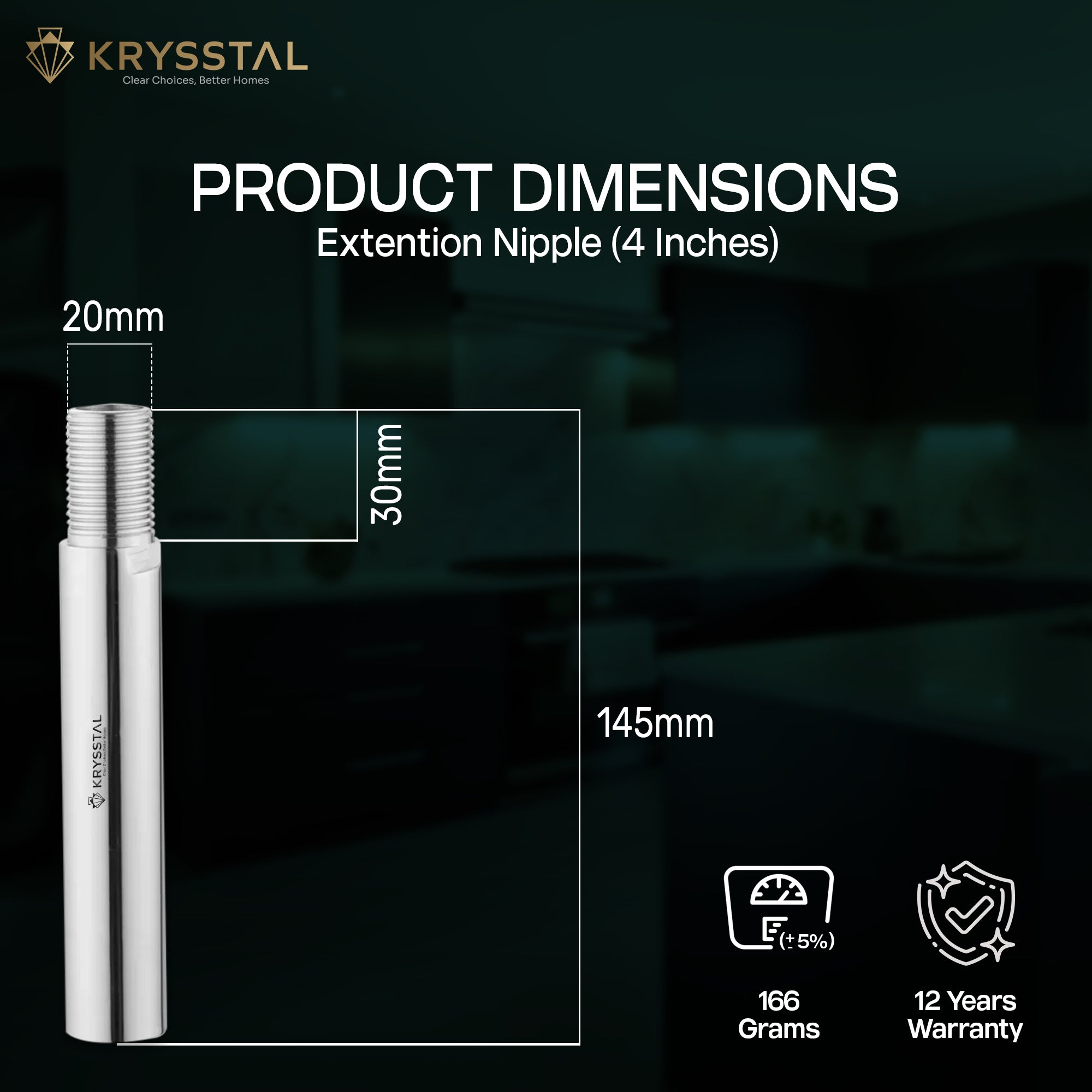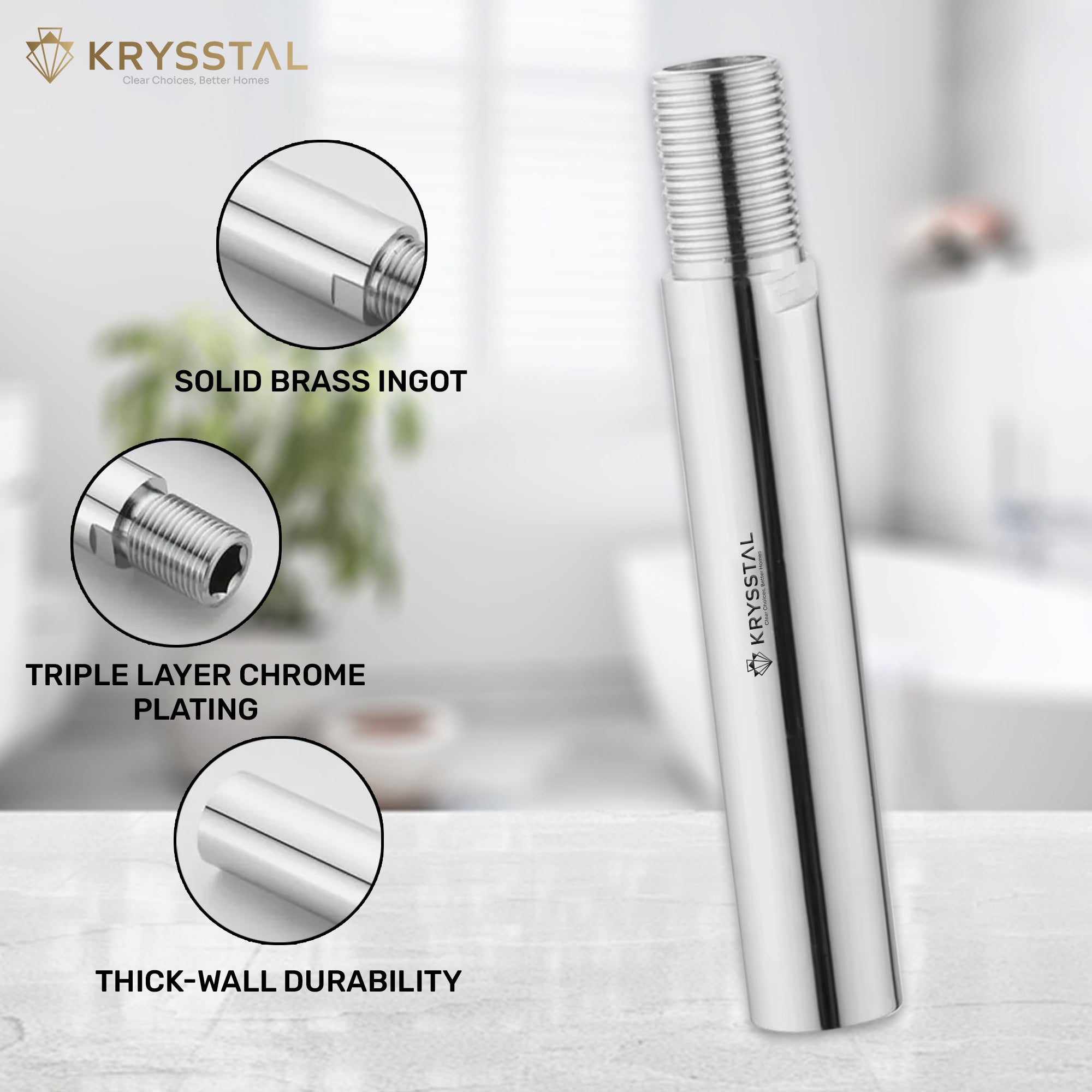 • FINISH: Triple-layered chrome plating (copper–nickel–chrome) gives mirror gloss and superior corrosion/limescale resistance. An ideal chrome-plated brass extension nipple for Indian bathrooms.