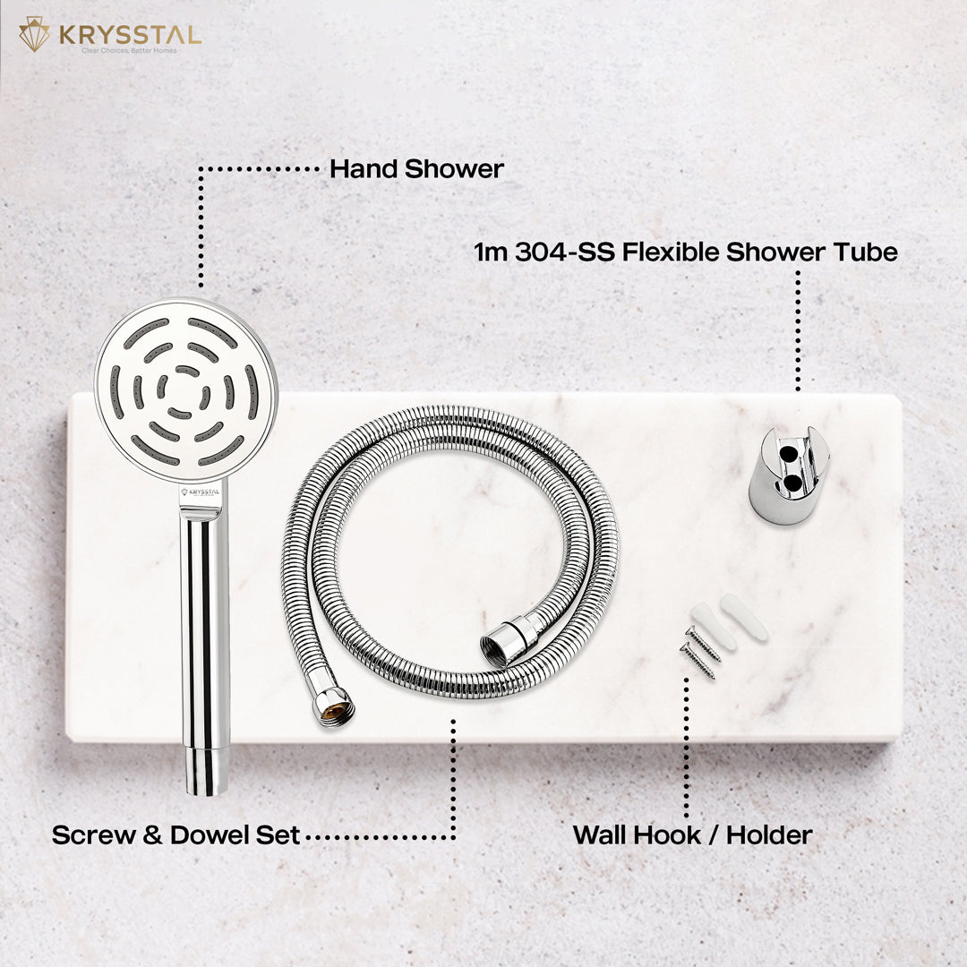 PACKAGE CONTENTS: 1 x Hand Shower Head, 1 x Hand Shower Holder/Wall Hook, 1 x 304 SS Shower Tube (1m)