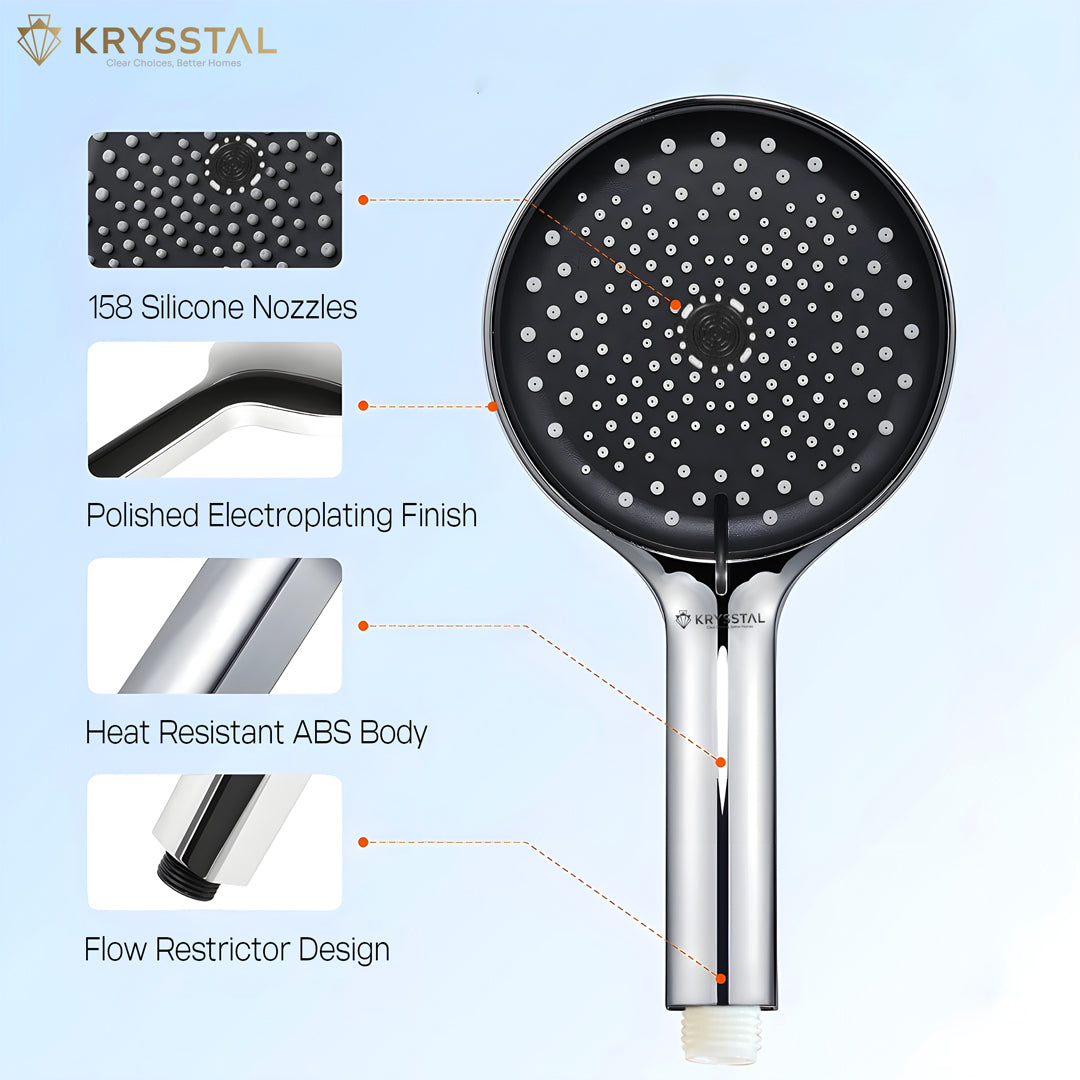 The Triva hand shower is made from strong, unbreakable ABS with a shiny chrome finish that resists rust and corrosion. It offers three spray modes—Pulse, Rain, and Rain+Pulse—that you can switch easily with a twist. Self-cleaning silicone nozzles prevent clogging for smooth water flow. The flexible 1-meter 304-grade stainless steel shower tube is leak-proof, burst-proof, and durable. Designed for high water pressure, it delivers a powerful and water-efficient shower every time.