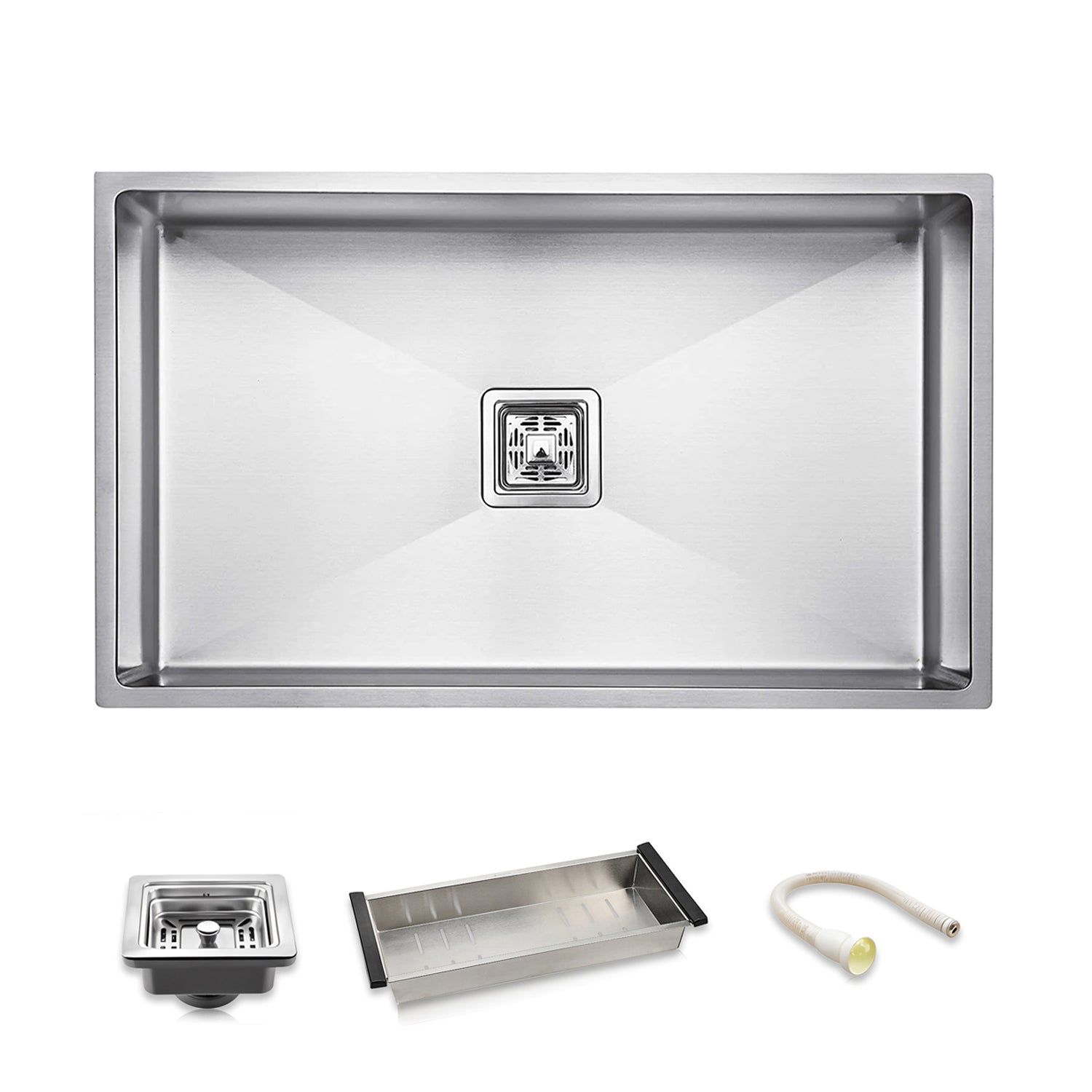 • Package Contents: 1 x Sink Bowl, 1 x 30 Inch PVC Waste Pipe, 1 x Square Sink Coupling, 1 x Sliding 304-SS Basket