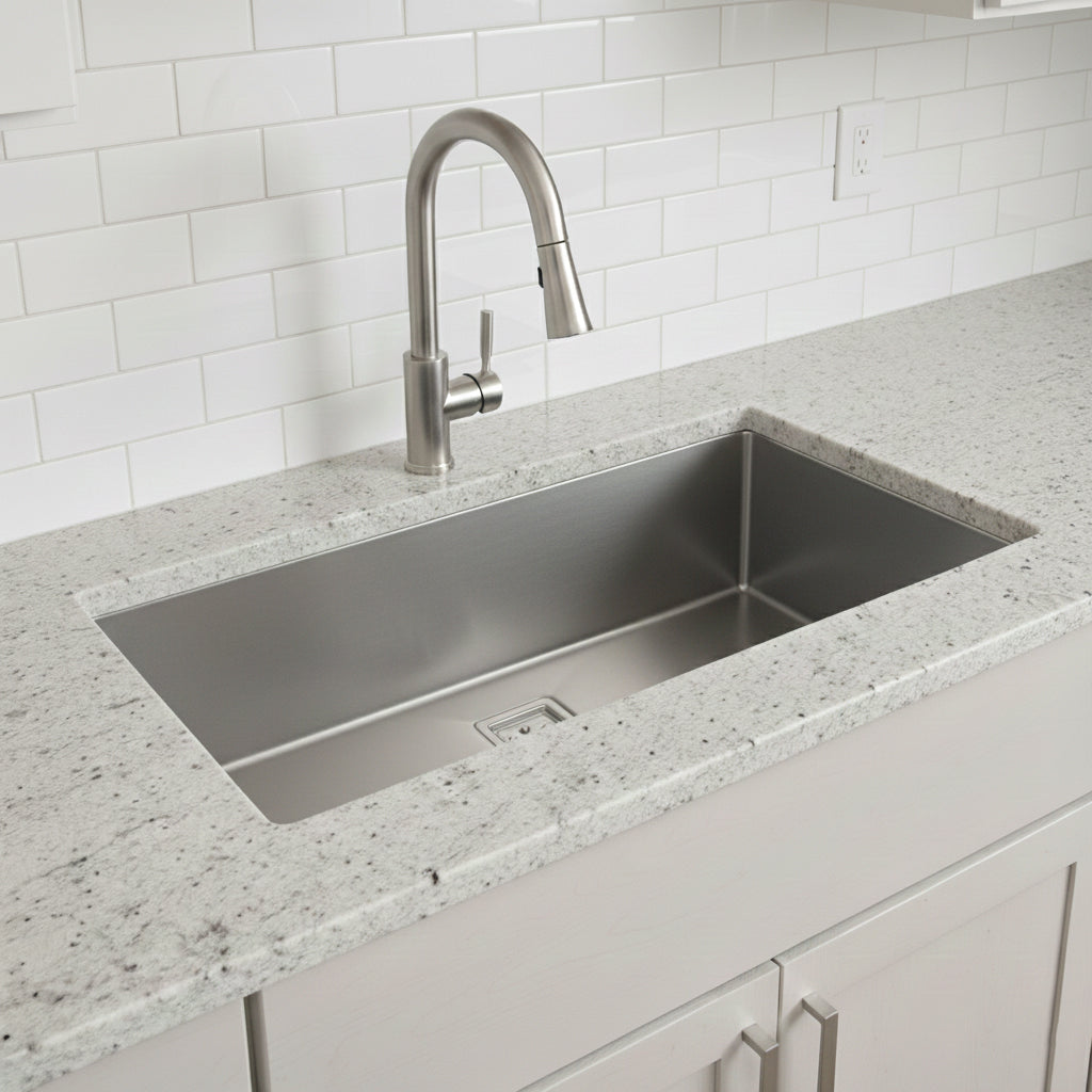 This handmade single bowl kitchen sink, crafted from durable 304-grade stainless steel, offers a spacious 32 x 20 x 10-inch basin to easily accommodate large cookware. Its smooth, rounded corners and sloped base promote cleanliness, while sound-absorbing pads reduce noise for a quieter kitchen. Suitable for undermount or flush-mount installation, this rust-resistant sink combines practicality with lasting quality, making it a reliable choice for any kitchen.