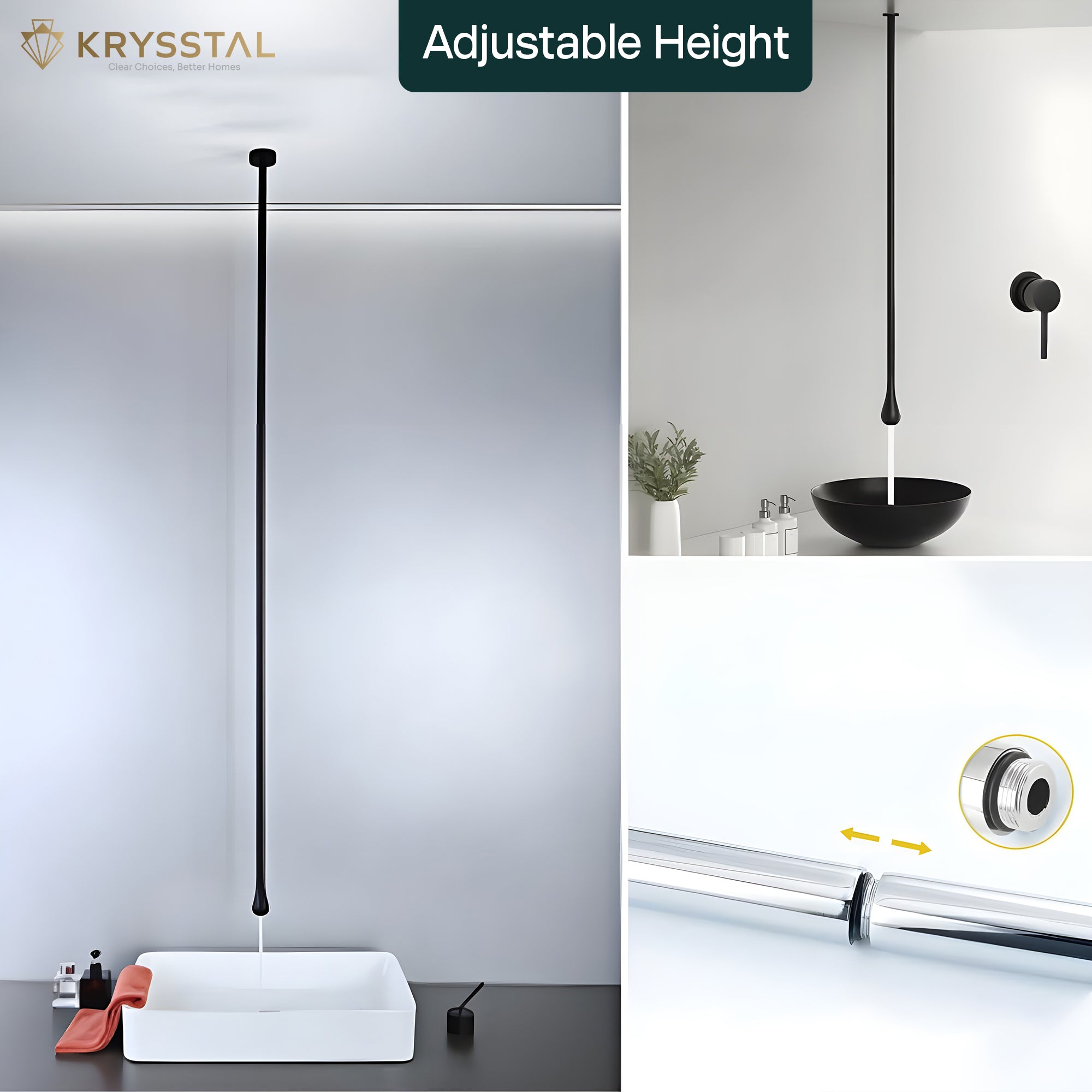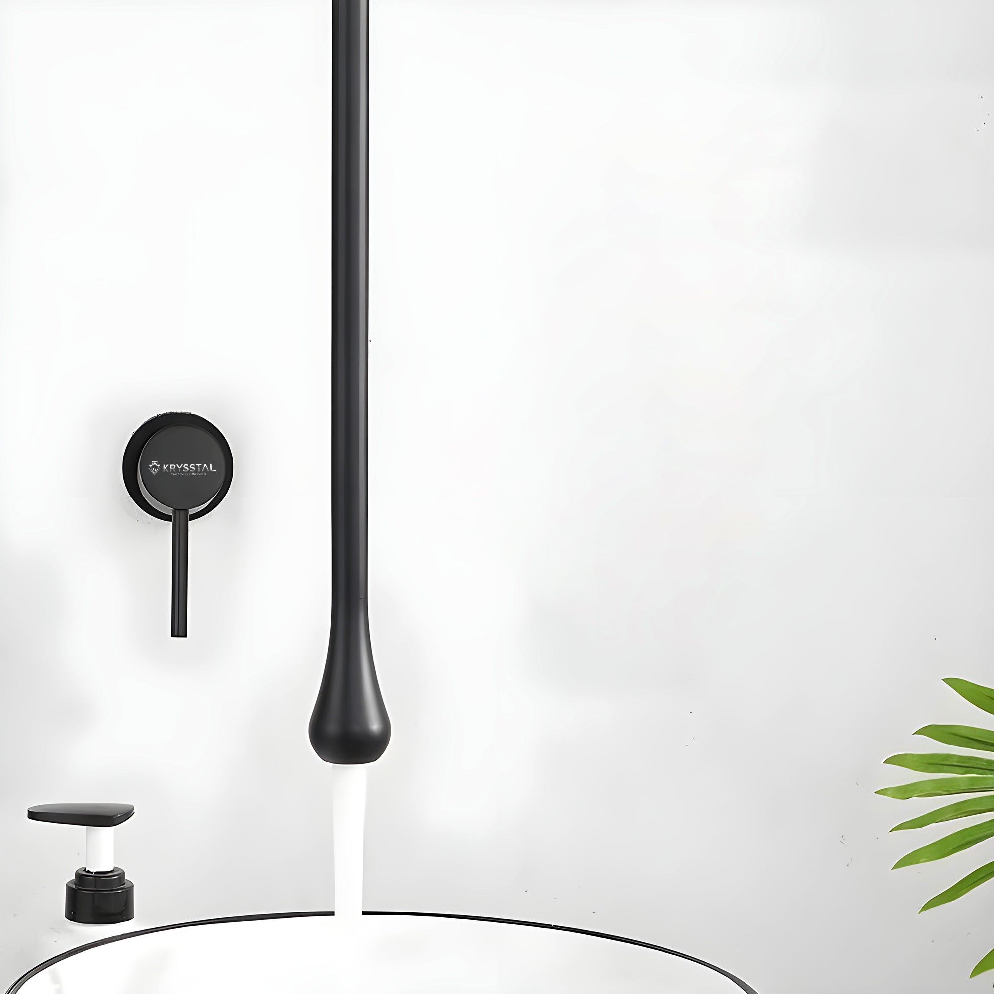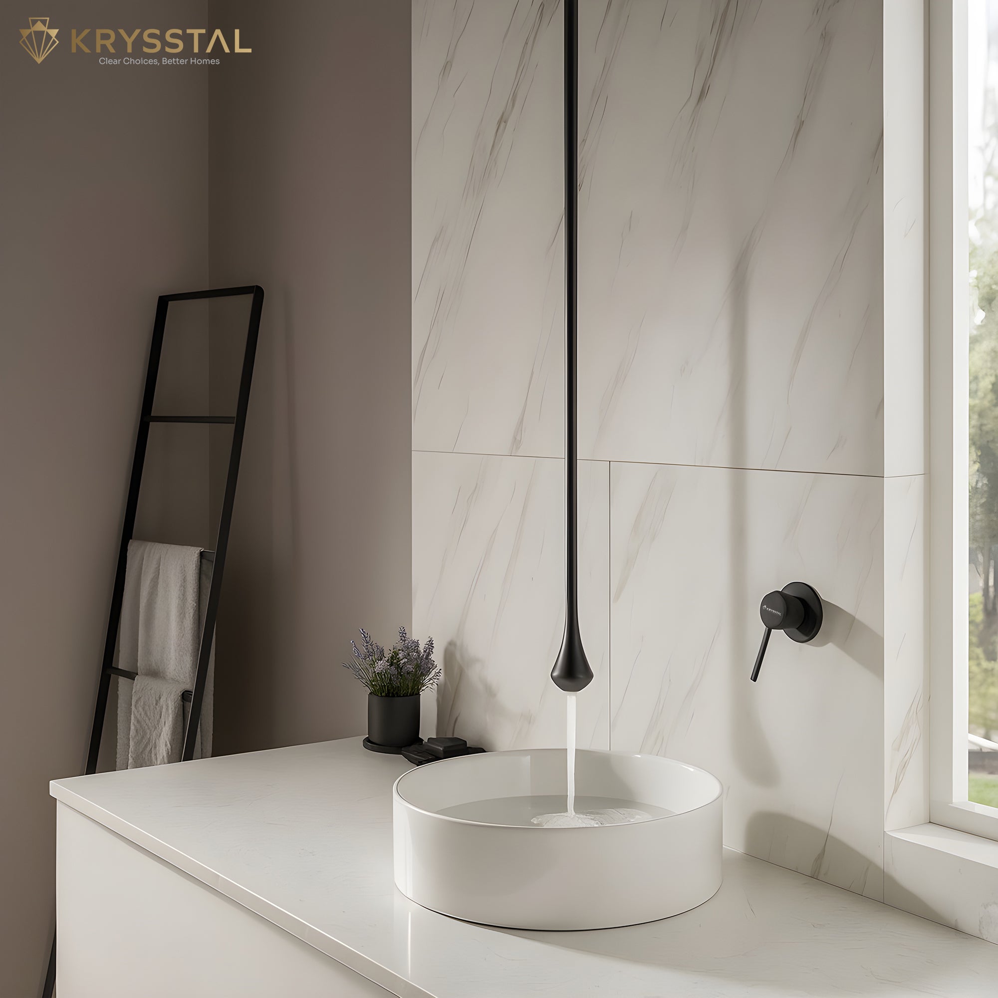 This designer Krysstal ceiling mount wash basin mixer tap is available in four luxurious PVD finishes – Matt Black, White, Rose Gold, and Gold – perfect for modern bathrooms.