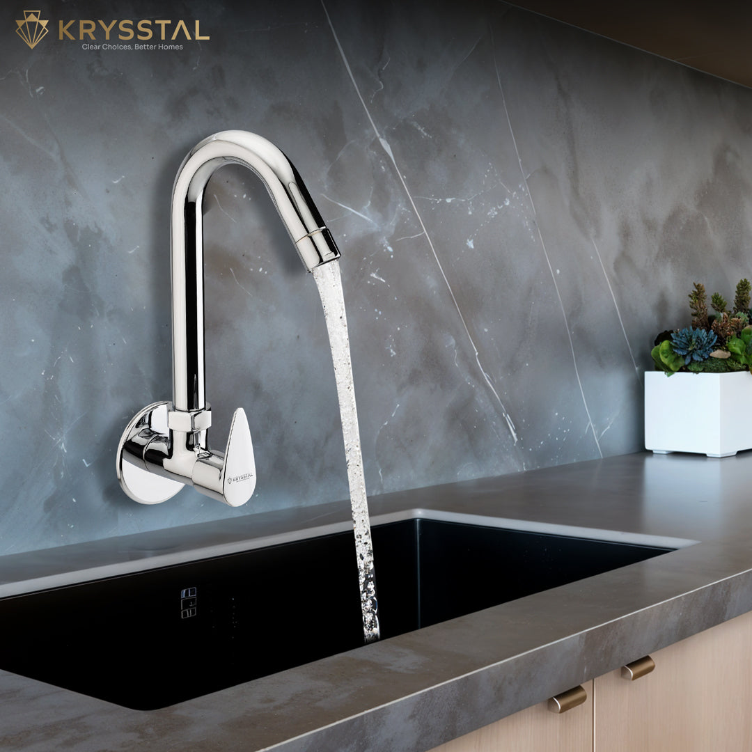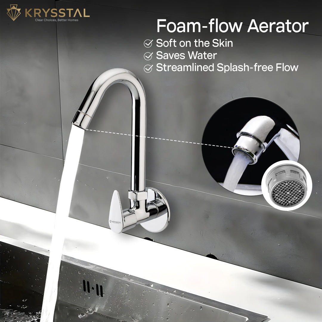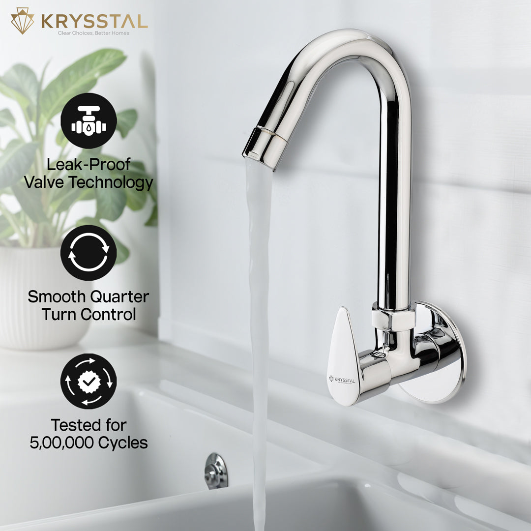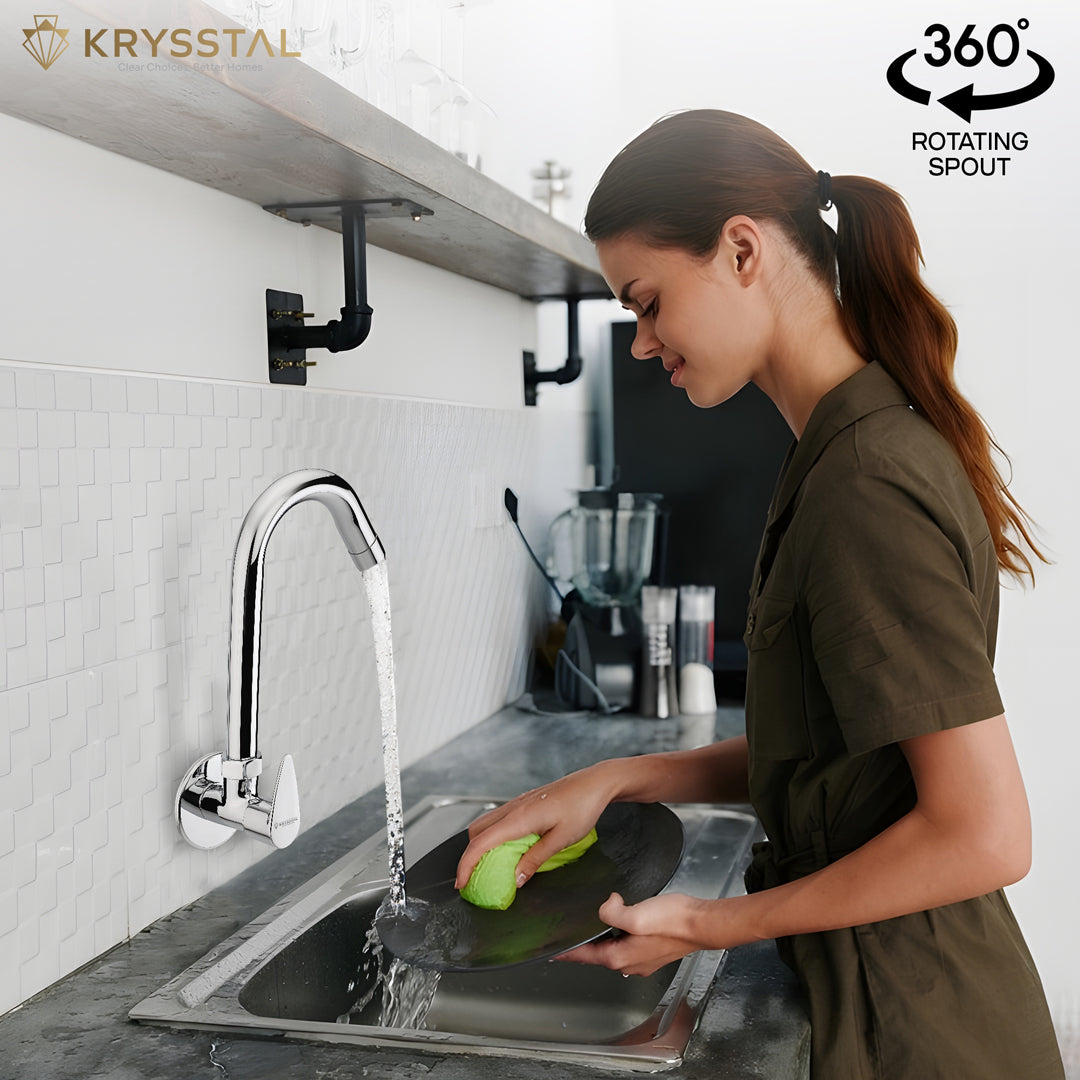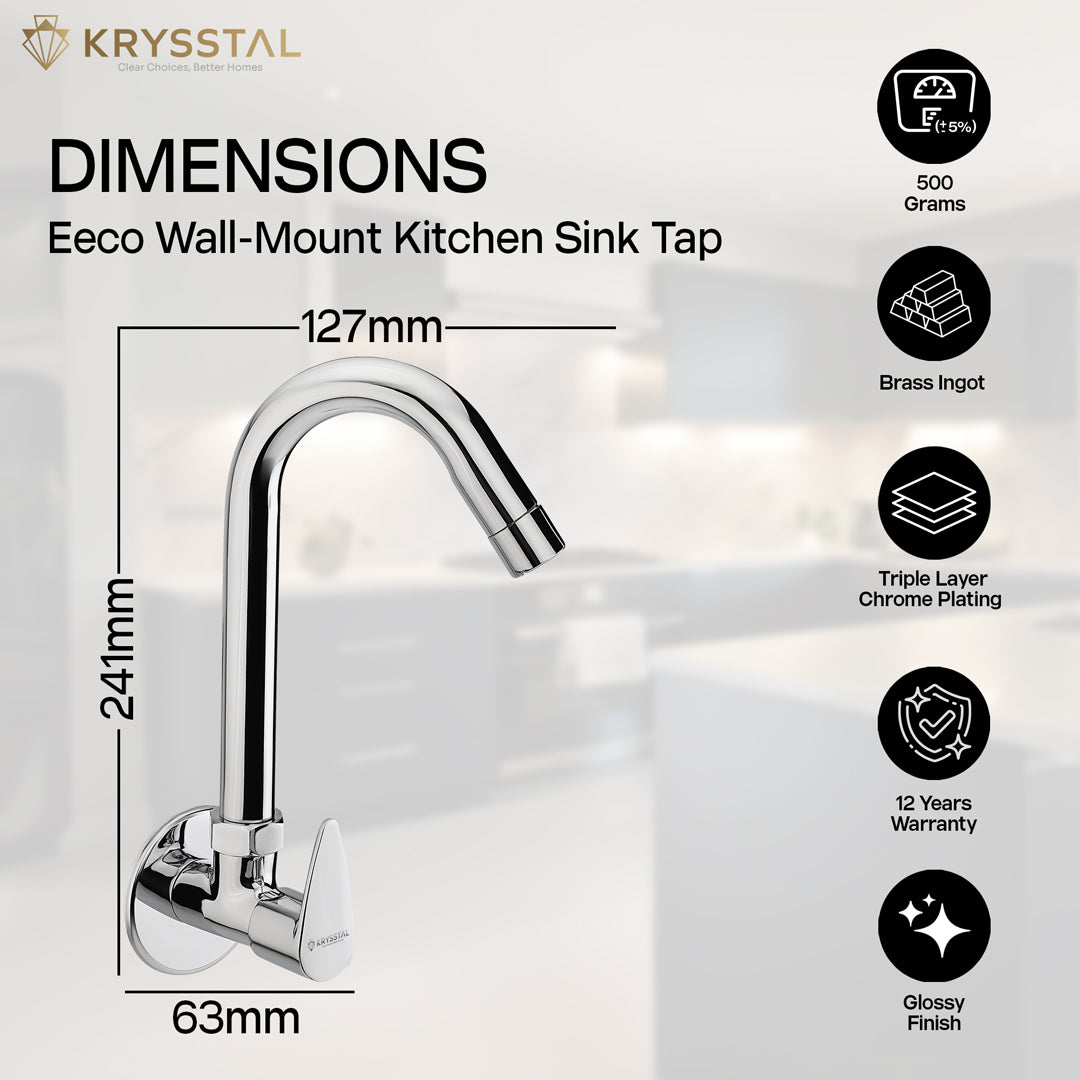 The Eeco Wall-Mount Kitchen Sink Tap is made from solid brass with a durable triple-layer chrome finish that resists rust, corrosion, and heat. Its water-saving aerator reduces water use by 50%, while minimizing splashes and noise. The 360° rotating spout offers flexible reach for washing, rinsing, or filling. Built to last over 500,000 uses, it guarantees drip-free operation. Easy to clean, its chrome surface resists stains and fingerprints, keeping your kitchen neat and stylish.