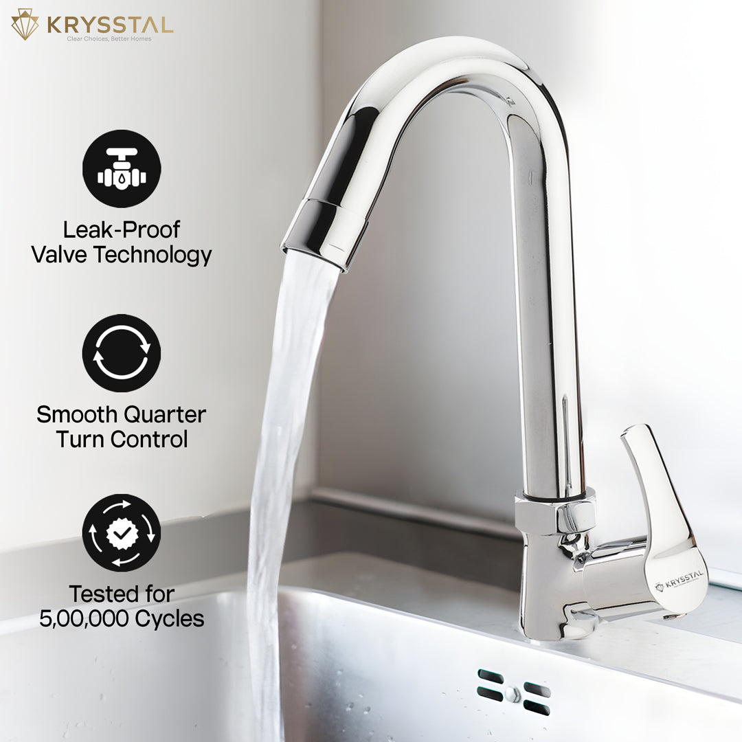 MATERIAL & FINISH: Swan Neck Tap is built with solid brass ingot, coated with a triple-layer chrome finish — that efficiently resists rusting, corrosion and heat; engineered for durability.