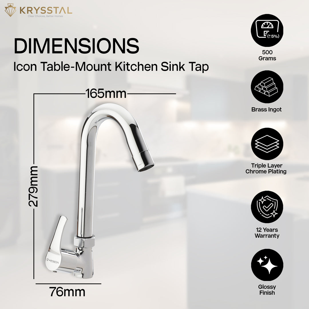 The Icon Table-Mount Kitchen Sink Tap features a solid brass build with a triple-layer chrome finish that resists rust, corrosion, and heat. Its water-saving aerator cuts water use by 50%, minimizing splashes and noise. The 360° rotating spout offers flexible reach across the sink for washing and filling. Designed for over 500,000 uses, it ensures drip-free, reliable performance. Easy to clean, its chrome surface resists stains and fingerprints, keeping your kitchen looking fresh.