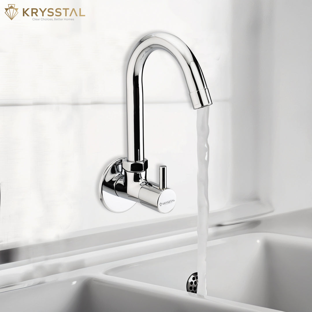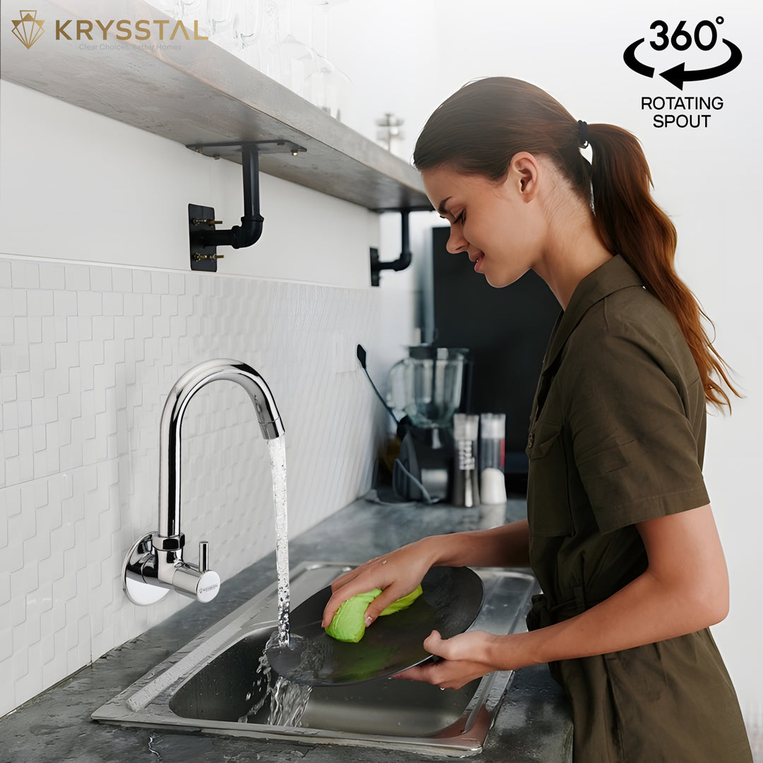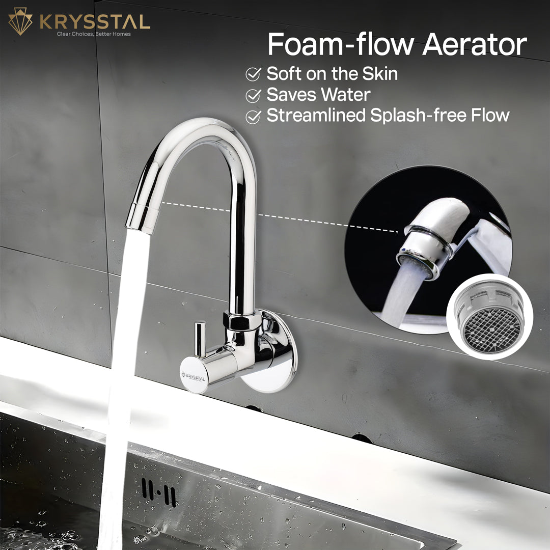 The Vitra Wall-Mount Kitchen Sink Tap is made from solid brass with a tough triple-layer chrome finish that stops rust, corrosion, and heat damage. Its water-saving aerator reduces water use by 50% and cuts splashes and noise. The 360° rotating spout provides flexible reach for easy washing and filling. Built for over 500,000 uses, it offers reliable, drip-free performance. The chrome surface is easy to clean and resists stains and fingerprints, keeping your kitchen looking fresh.