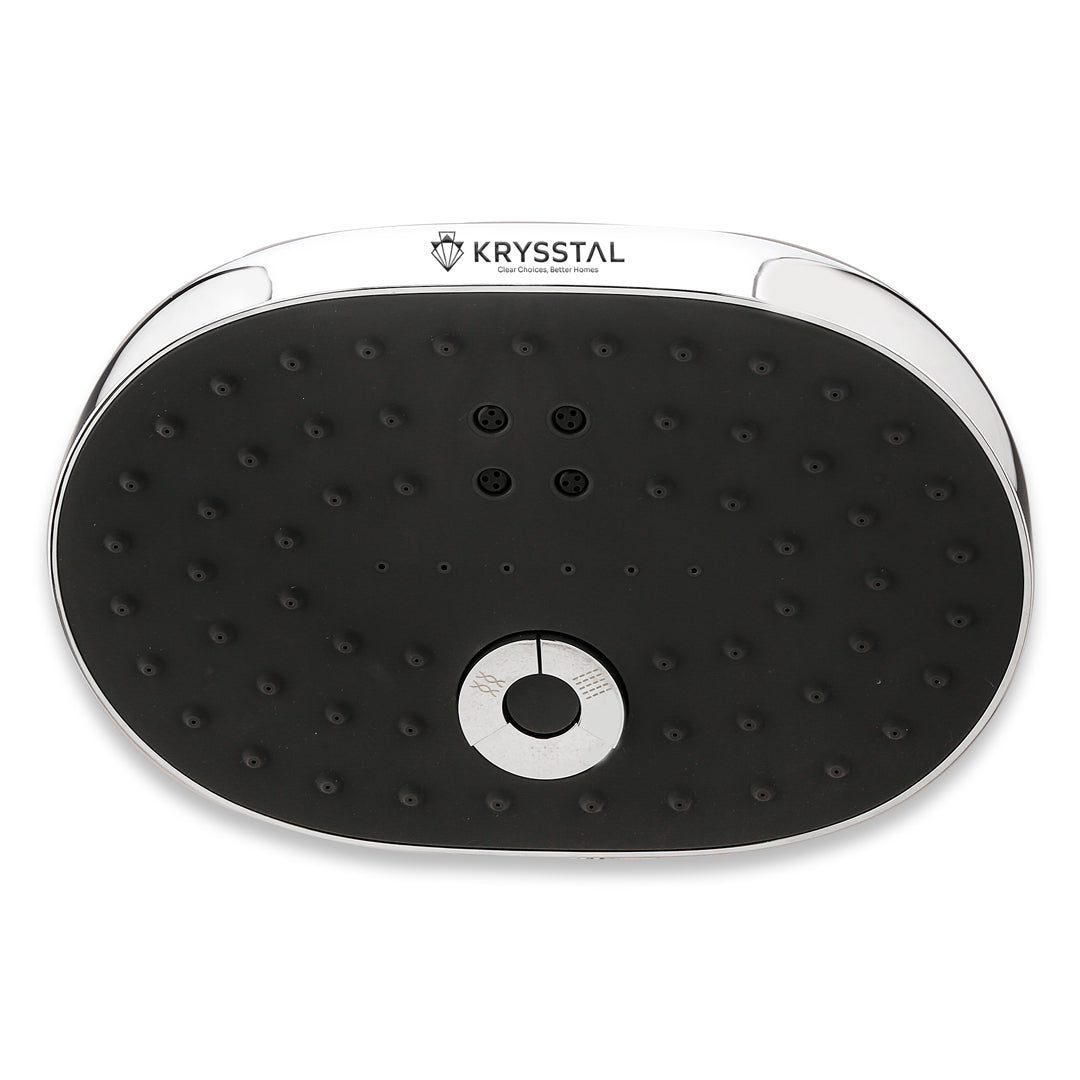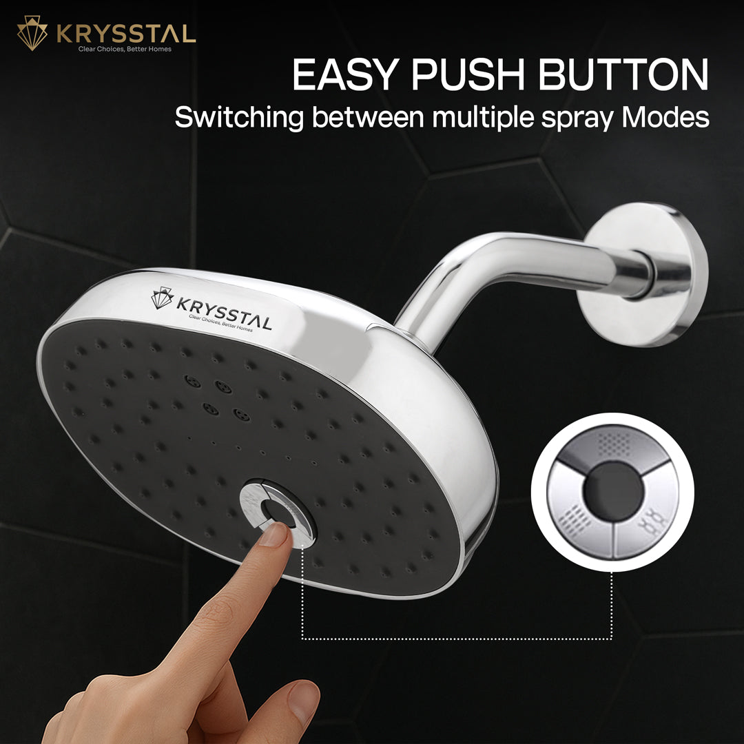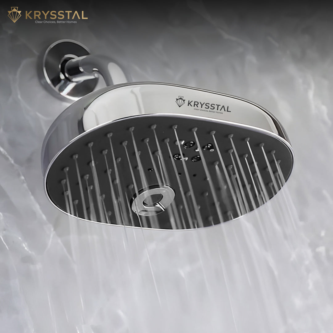 A. Krysstal offers two premium types: Ultra Slim Overhead Showers made from 304-grade stainless steel with 8% nickel content for rust resistance, and Luxury Overhead Showers made from unbreakable ABS plastic with a triple-layer chrome finish.