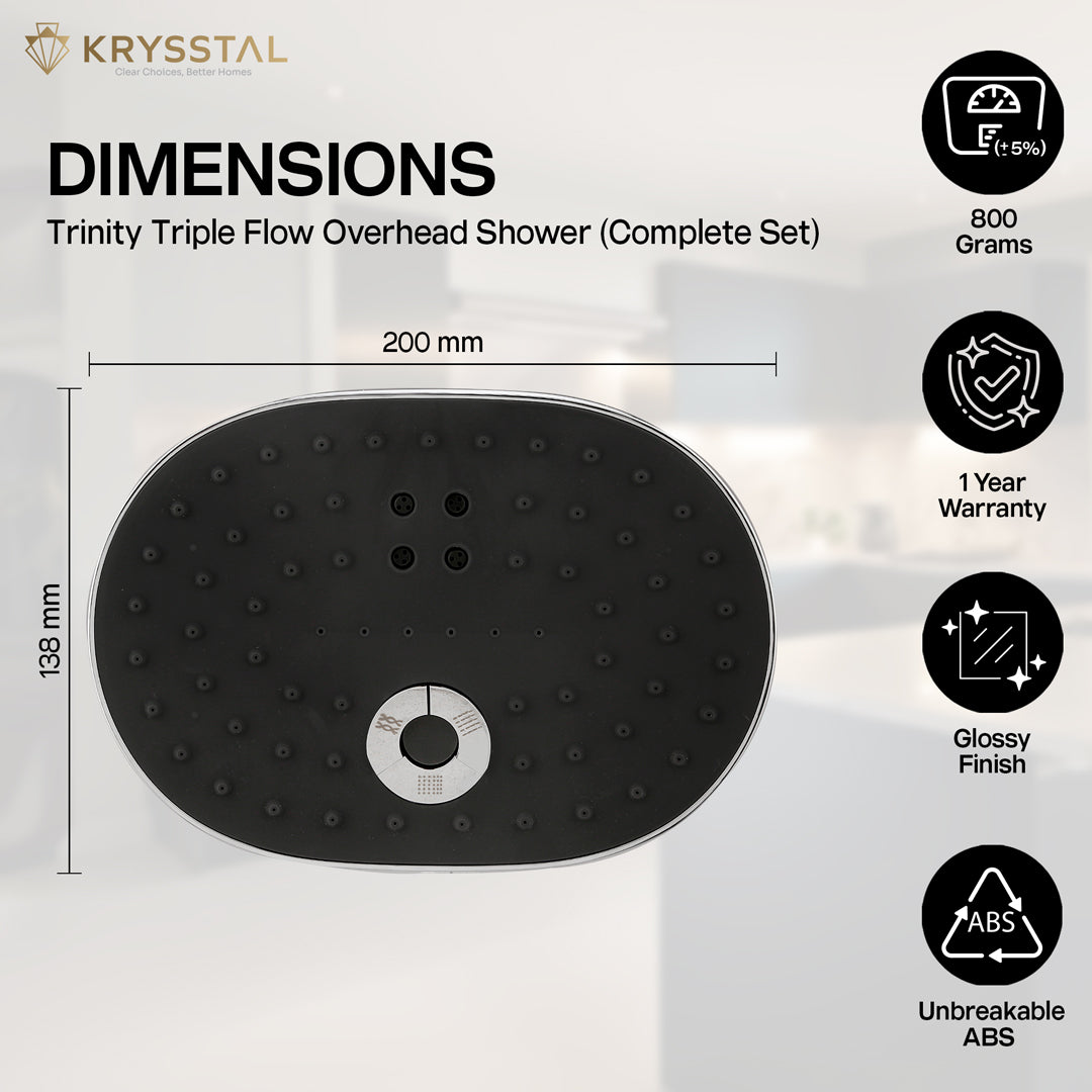 The Trinity triple flow overhead rain shower features a durable ABS body with a glossy triple chrome finish. It offers three spray modes—Rain, Pulse, and Mist—that you can switch easily using icon buttons. The shower delivers a strong, refreshing spray with advanced air intake technology and silicone nozzles that resist clogging for easy cleaning. Its brass ball joint allows smooth adjustment to direct water where you want. It combines style, power, and convenience for your bathroom.