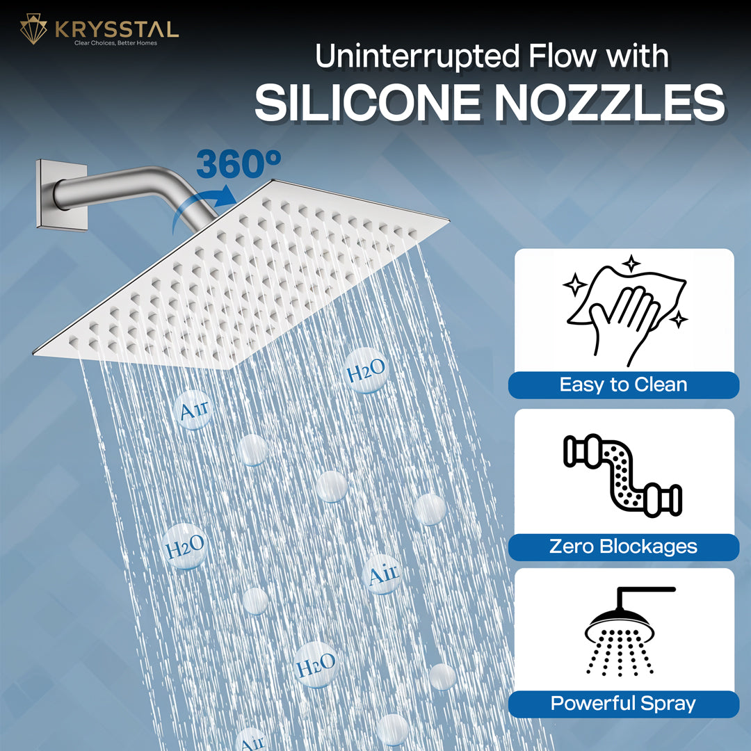 Experience a refreshing shower with this ultra slim 4" x 4" overhead rain shower made from durable 304-grade stainless steel. Its high-pressure spray delivers an even, powerful flow thanks to advanced air intake technology. Easily adjust the showerhead angle with the sturdy brass ball joint to suit your preference. Silicone nozzles prevent clogging and make cleaning simple. This shower combines quality and convenience for your bathroom.