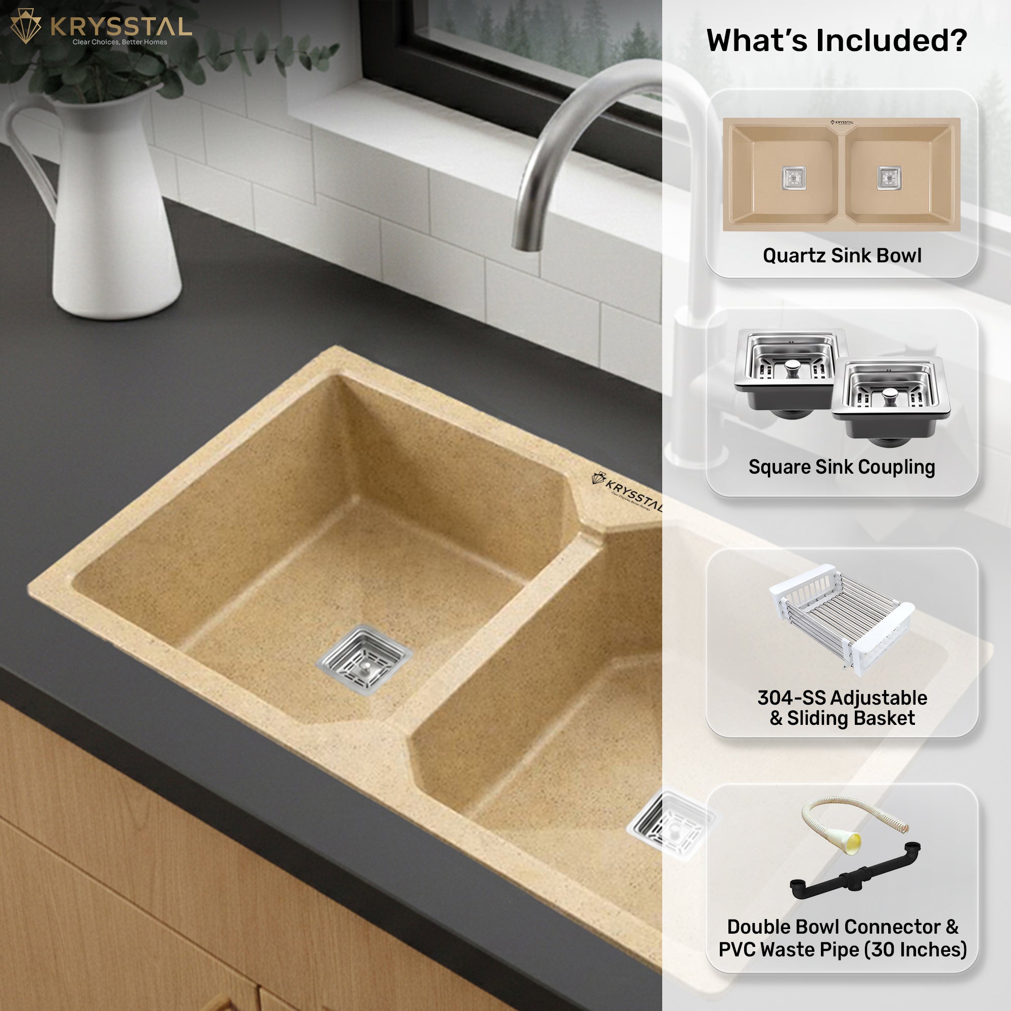 • Package Contents: 1 x Sink Bowl, 1 x 30 Inch PVC Waste Pipe, 2 x Square Sink Coupling, 1 x Double Bowl Connector, 1 x Sliding Adjustable Basket