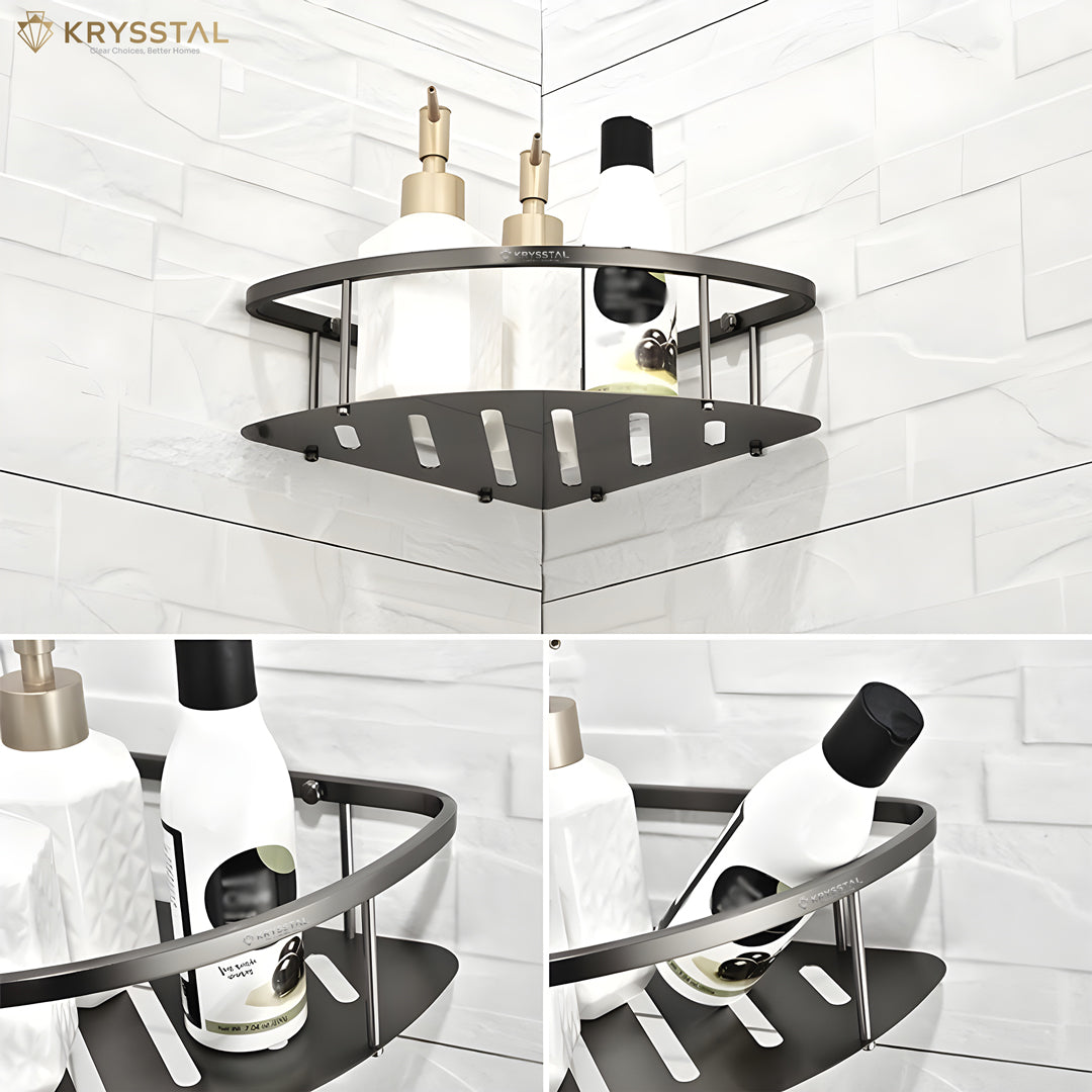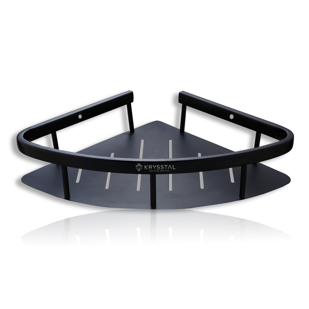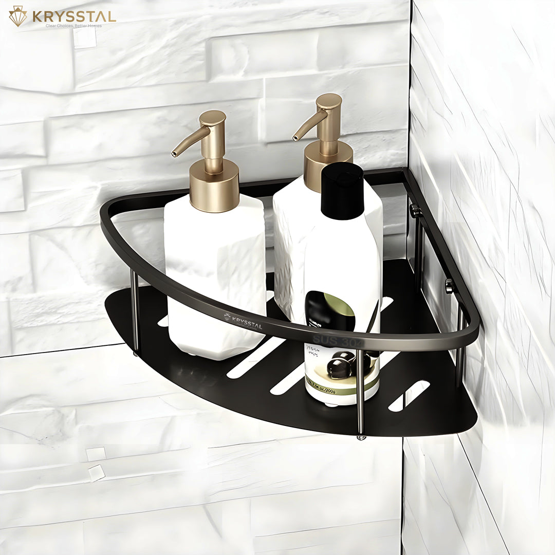 This Black Corner shelf tray is made from strong, rust-resistant 304-grade stainless steel with a sleek black finish. It holds heavy bottles and skincare products securely while saving space. Its smooth design fits perfectly in corners and stays firmly in place without wobbling. Smart drainage slots quickly remove water, keeping your items dry and your counters tidy.