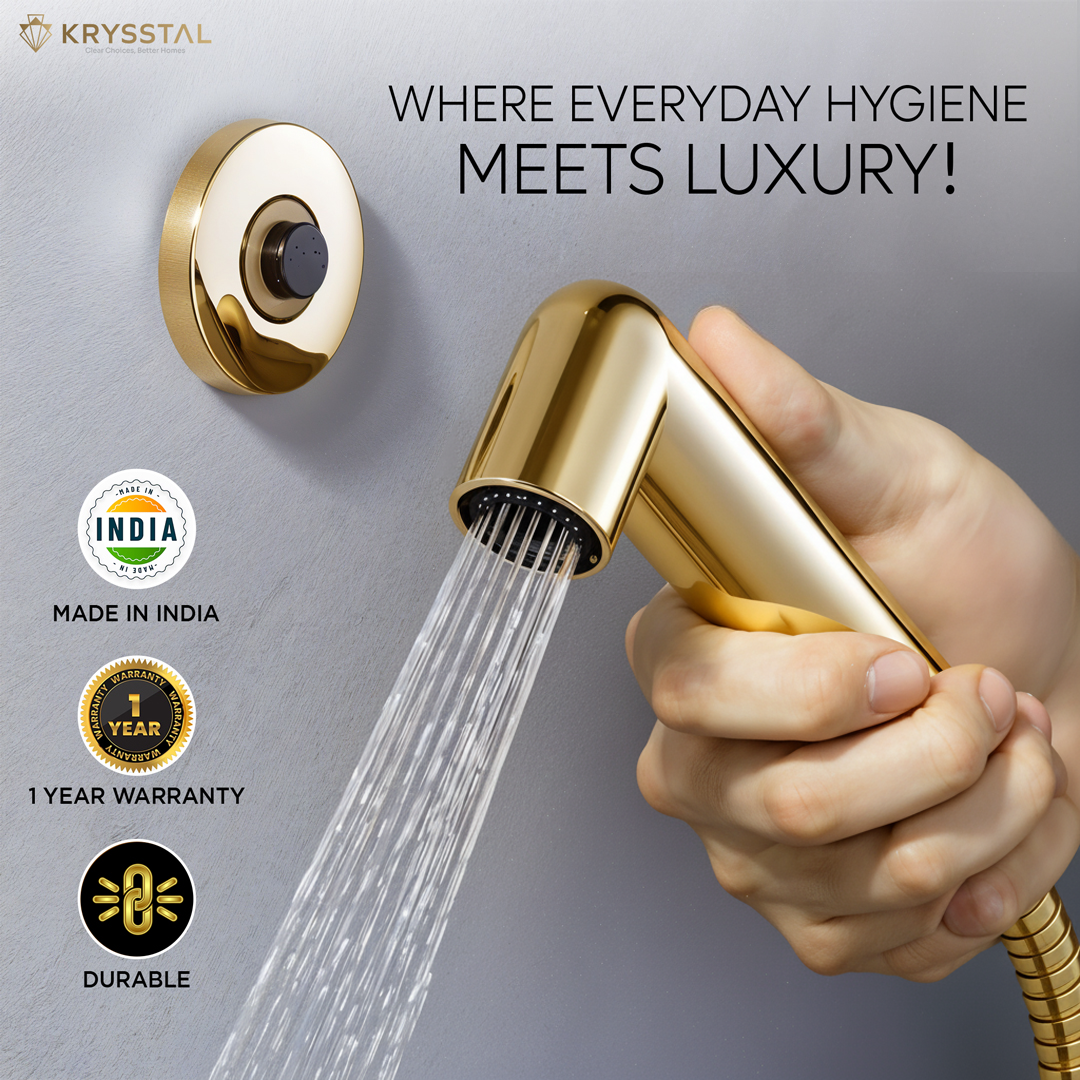 Brass health faucets are preferred for their sturdiness and resistance to rust and tarnish, making them ideal for long-term use in humid bathroom conditions. KRYSSTAL’s brass faucets combine functionality with a premium design, enhancing the overall look of your bathroom.