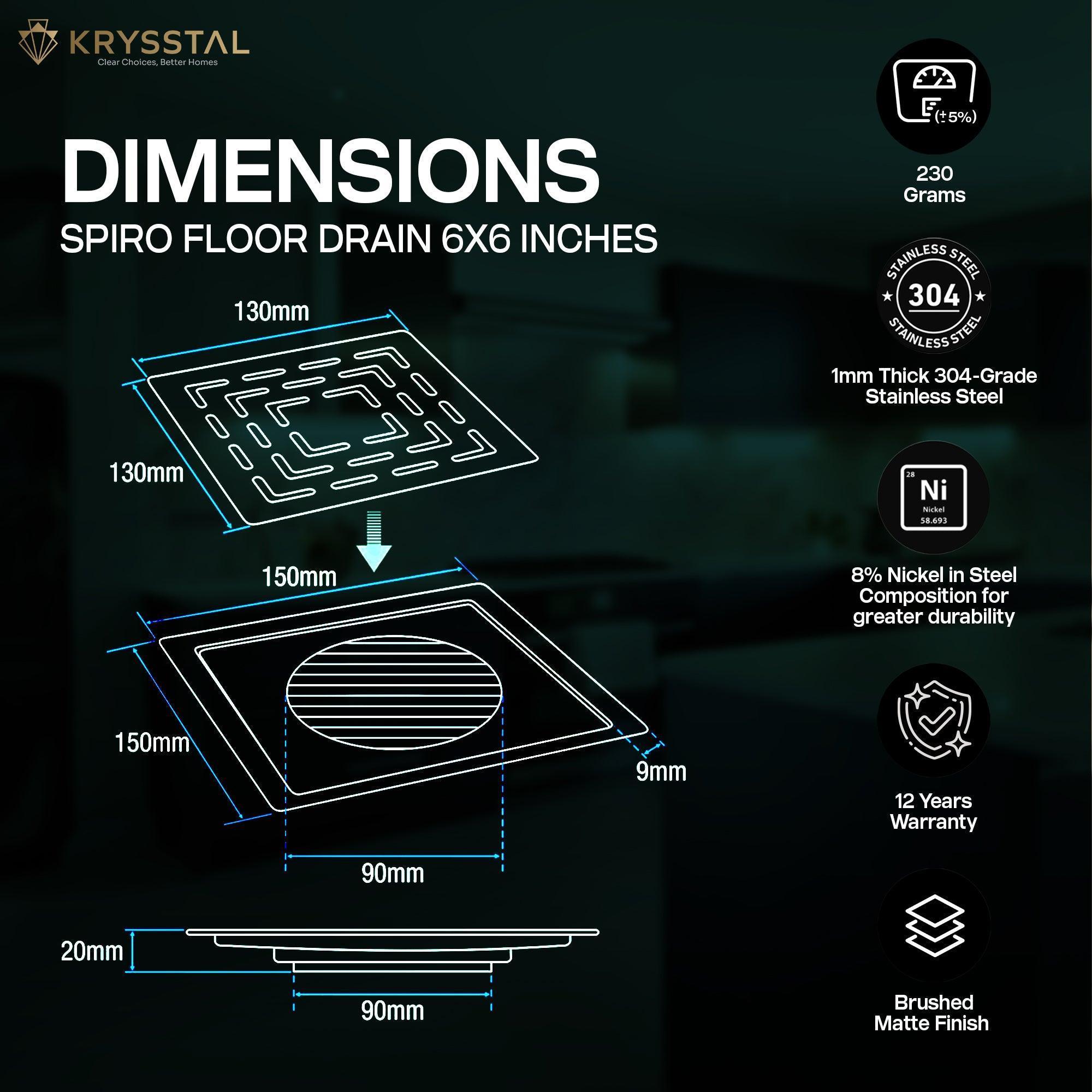 The Spiro 304-SS Floor Drain (6" x 6") is made from strong 304-grade stainless steel with a sleek brushed finish that resists rust and corrosion. Its precise grating allows quick drainage, keeping floors dry and clean. Curved edges provide a secure, stable fit without wobbling. The elegant, removable top makes cleaning easy while blending seamlessly with your floor. Built to handle heavy use, this drain offers lasting performance with simple maintenance.