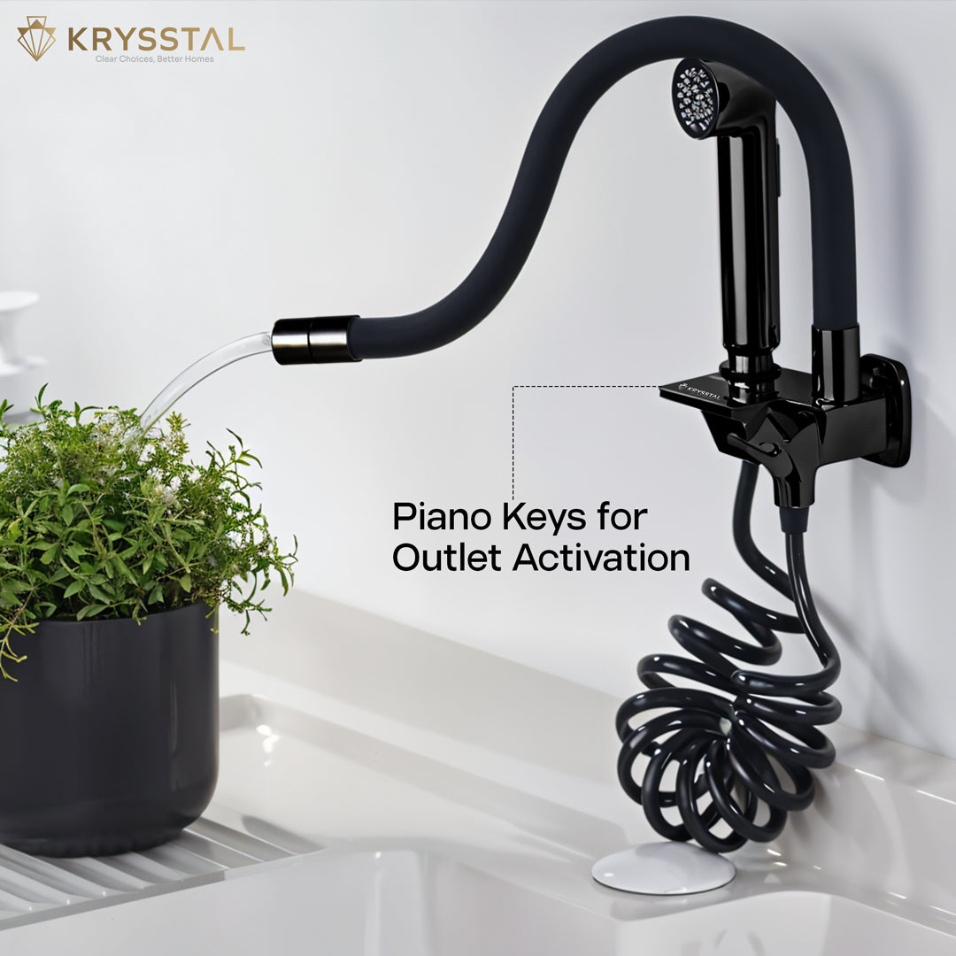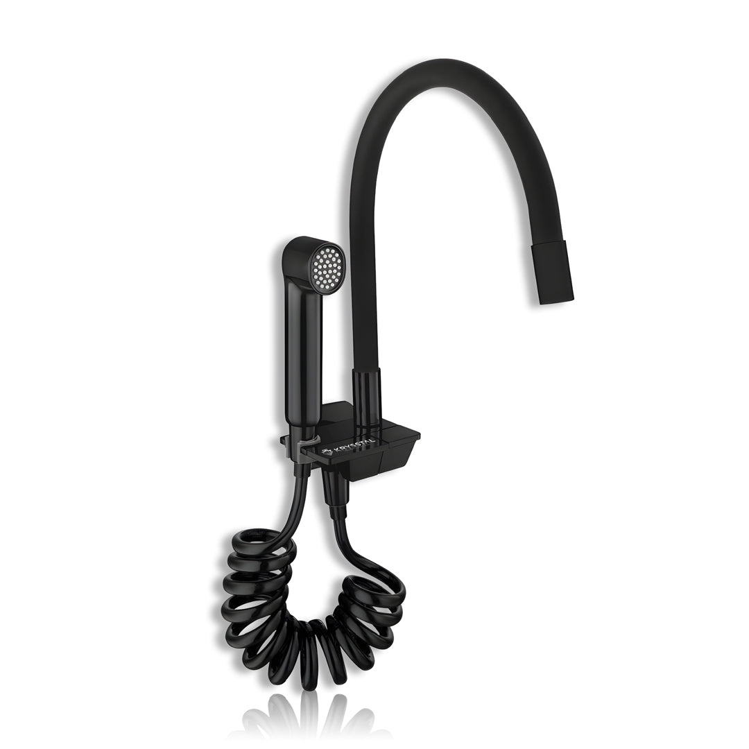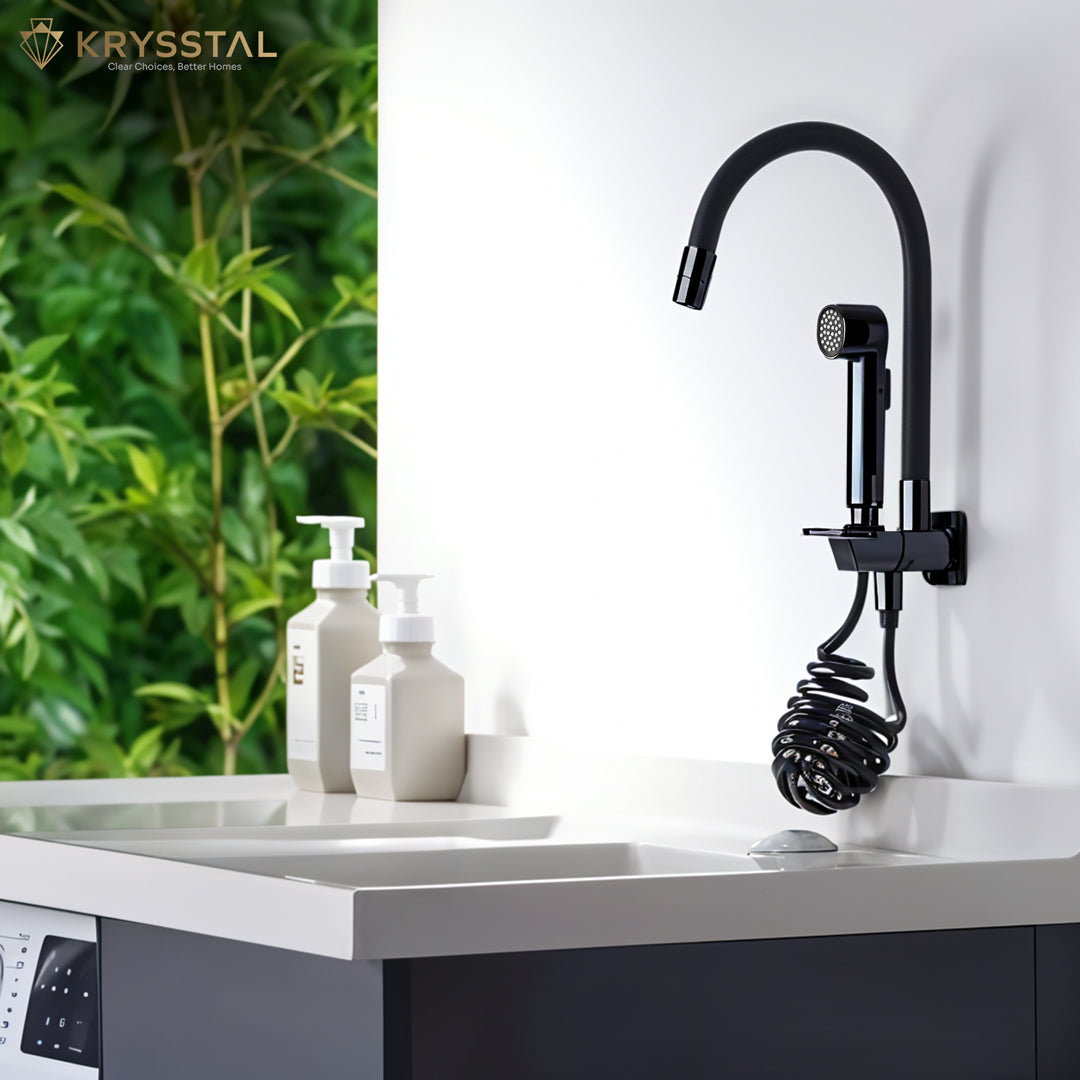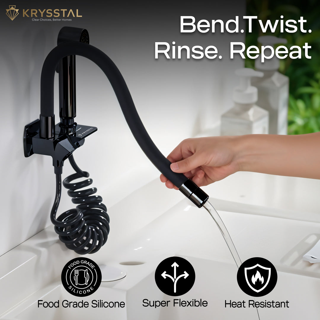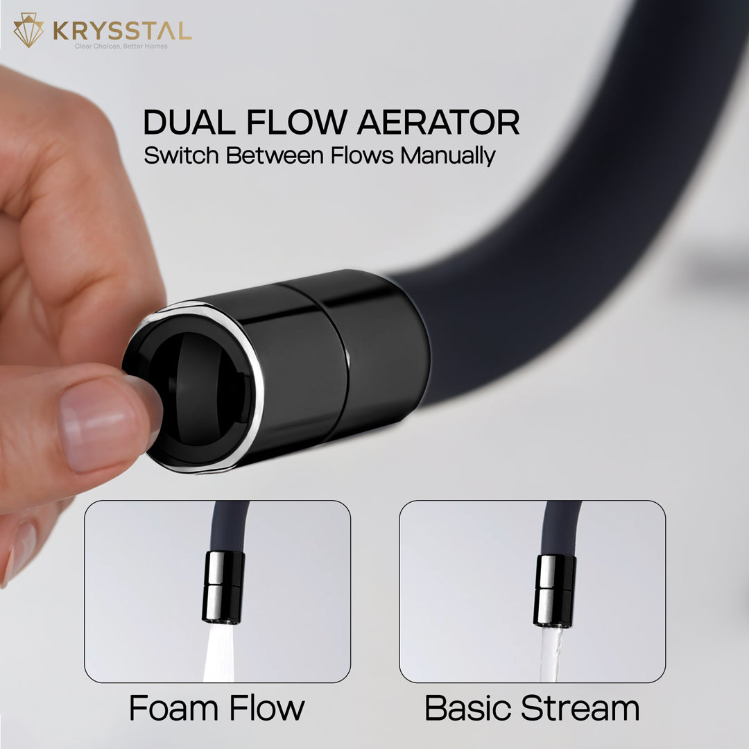The Rinzer Dual Flow Piano Black Kitchen Sink Tap combines style and versatility with its chrome-plated brass body and flexible, food-grade silicone spout for precise water direction. Easily switch between faucet and high-pressure hand shower using soft-press buttons. Its dual flow aerator lets you choose between a gentle stream and bubble foam flow, while the booster spray gun on a spring connector offers wide reach for all your cleaning needs. Designed for efficient, splash-free water use, it delivers a steady 8–12 LPM flow, making kitchen tasks faster and easier.