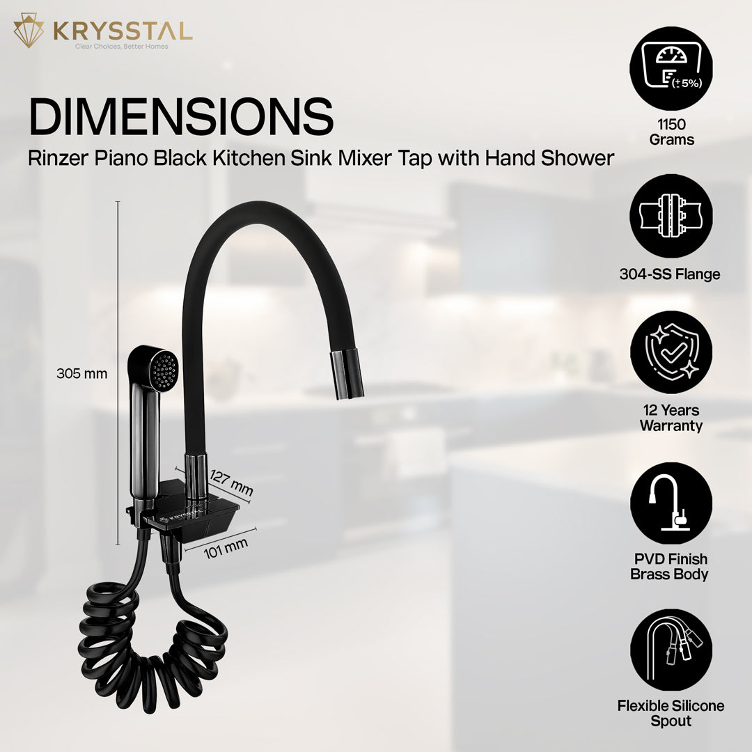 Rinzer Dual Flow Piano Black Kitchen Sink Tap with Hand Shower