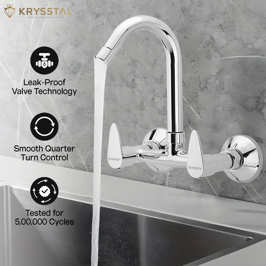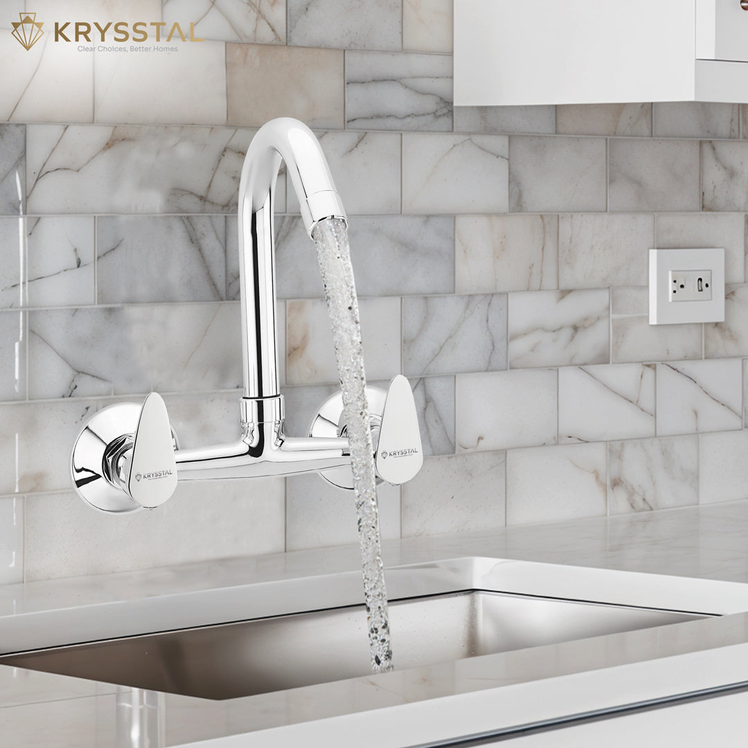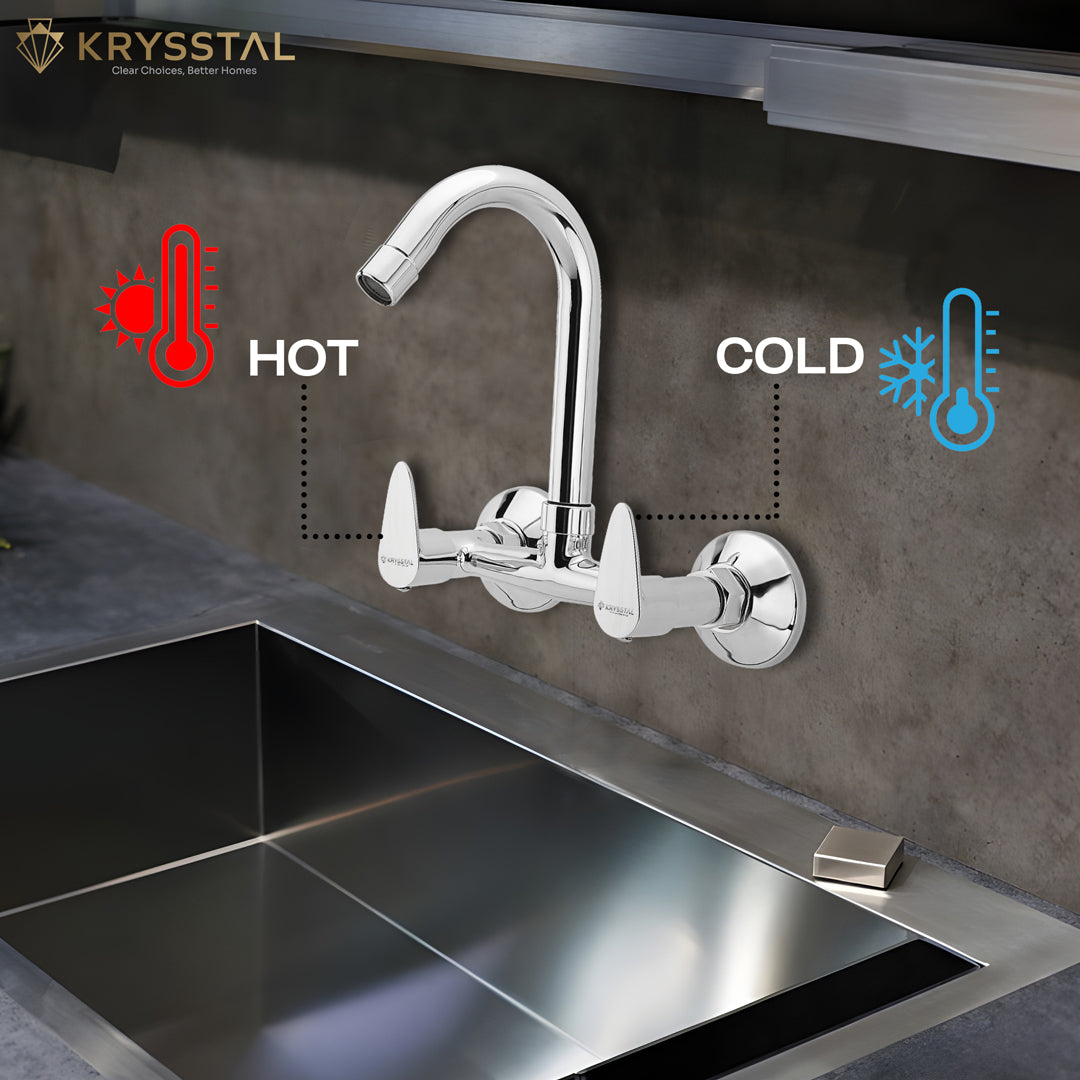 A wall mount kitchen sink mixer tap with double handle is installed on the wall above the sink and features two separate handles — one for hot water and one for cold — giving you precise control over water temperature and flow.